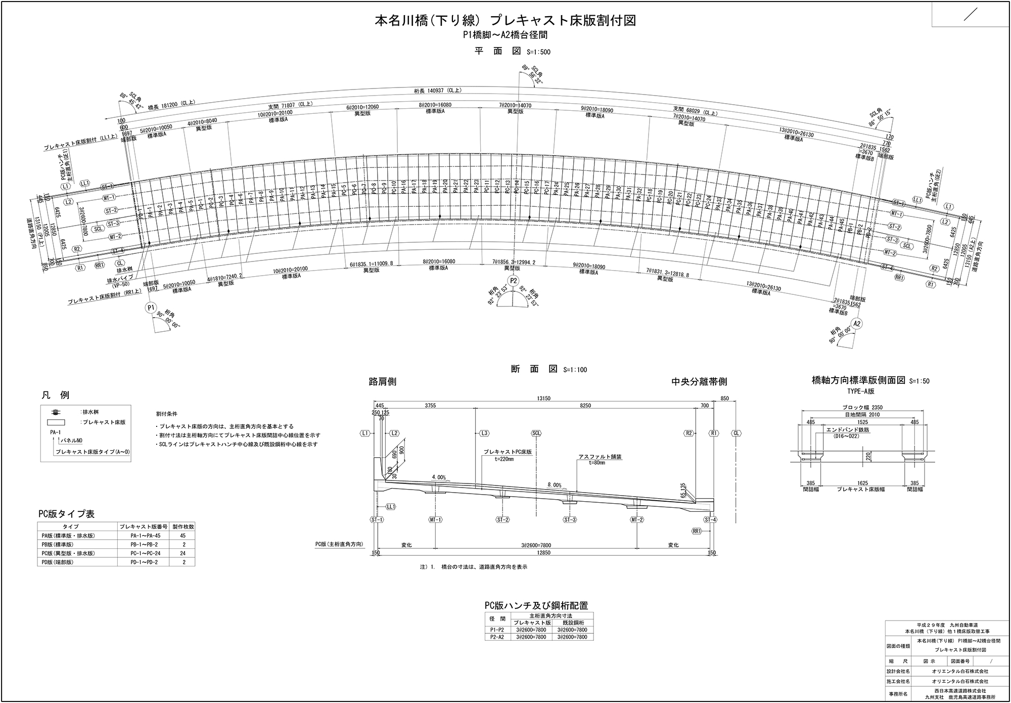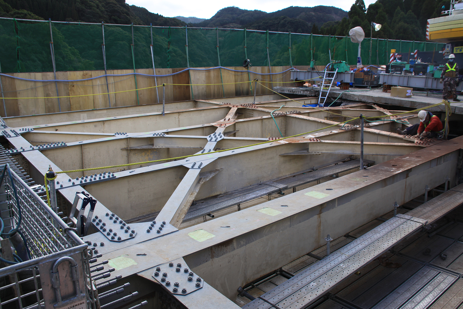 元請はオリエンタル白石(床版取替及び耐震補強)、一次下請は日本道路(橋面舗装)。一次下請はトラスト工業(床版撤去および架設)、野崎クレーン(重機)、鹿児島架設(足場)、ポリテクノ(防水工)。(2019年4月16日掲載)