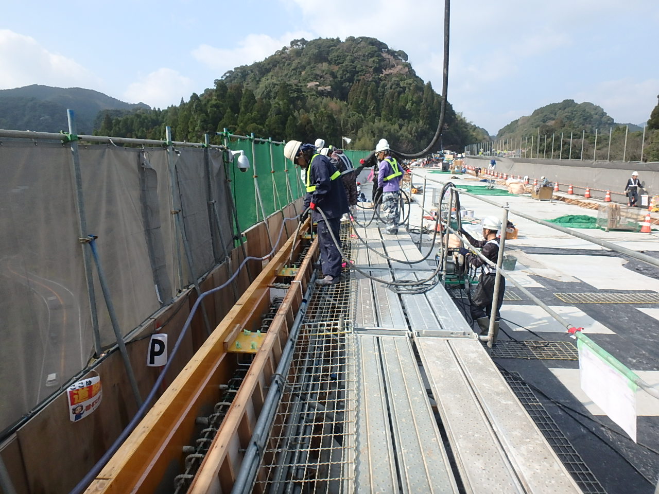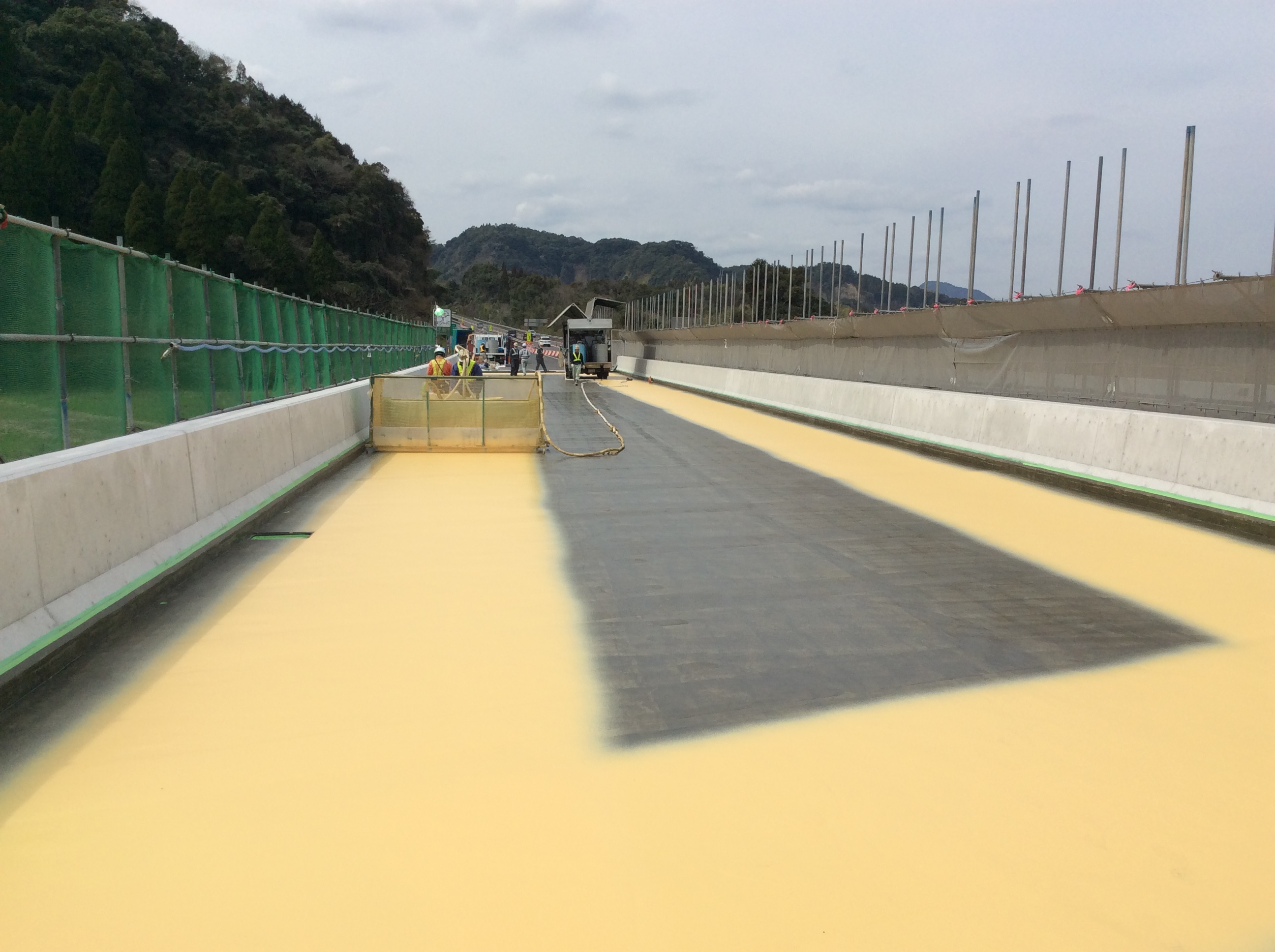 床版・高欄の施工完了後は、床版防水および舗装に移る。高性能床版防水はノバレタンES工法を採用する。特殊要因としては、この時期は雨が多いこと、風向きによっては桜島の火山灰が落ちてくることから、路面清掃や表面含水率の計測を細やかに行い施工する必要がある。また、舗装厚は標準で80mm(レベリング層40mm:FB13、表層40mm:高機能舗装)であるが、特に本名川橋では登坂車線で勾配が4%程度変化するため、一部では舗装を厚めに施工せざるを得ない箇所も出てくるようだ。床版防水および舗装施工は両橋全体で約2,700㎡。