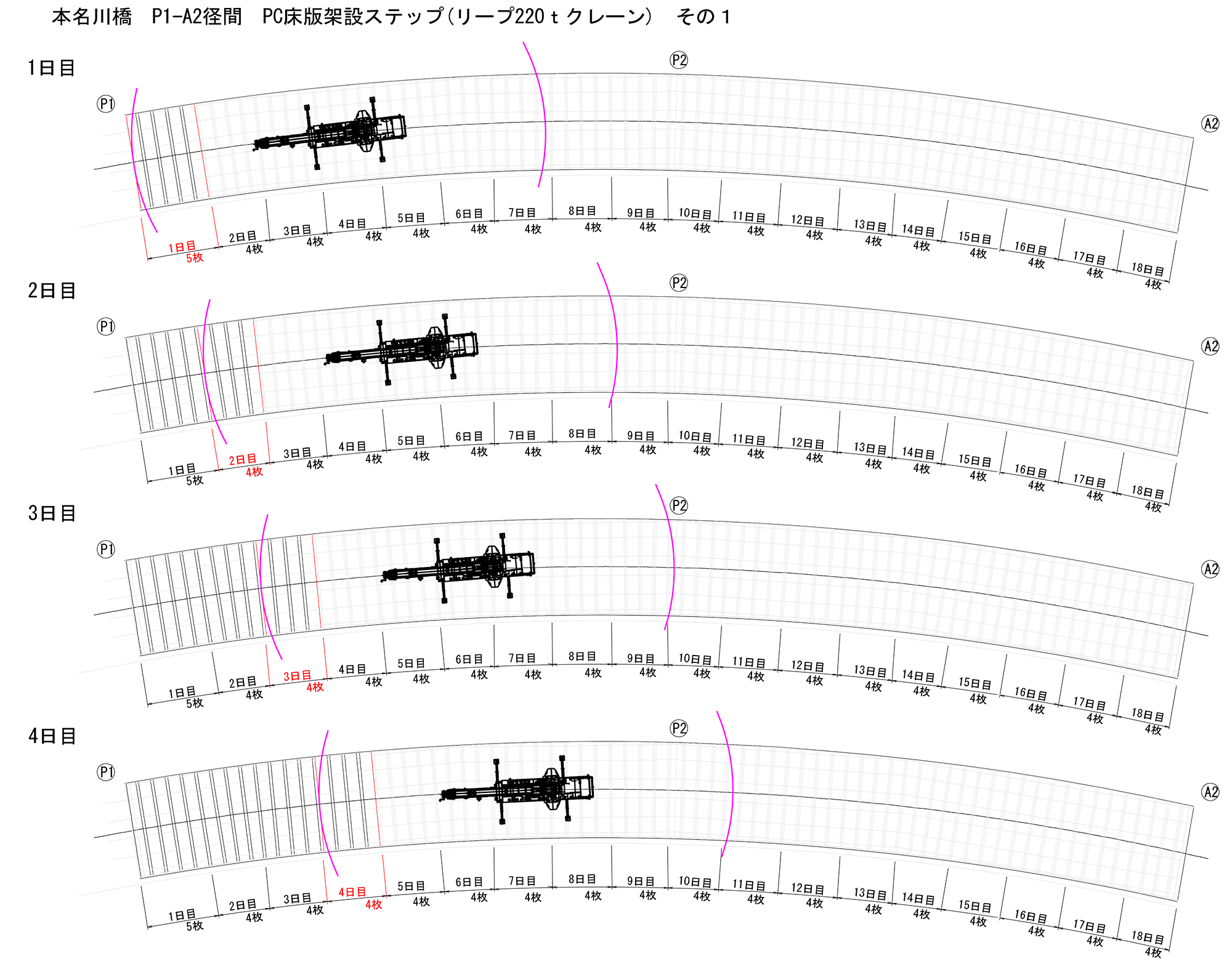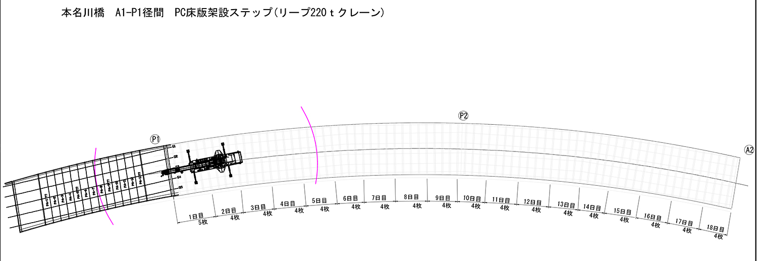 本名川橋P1-P2間 プレキャストPC床版架設ステップ図