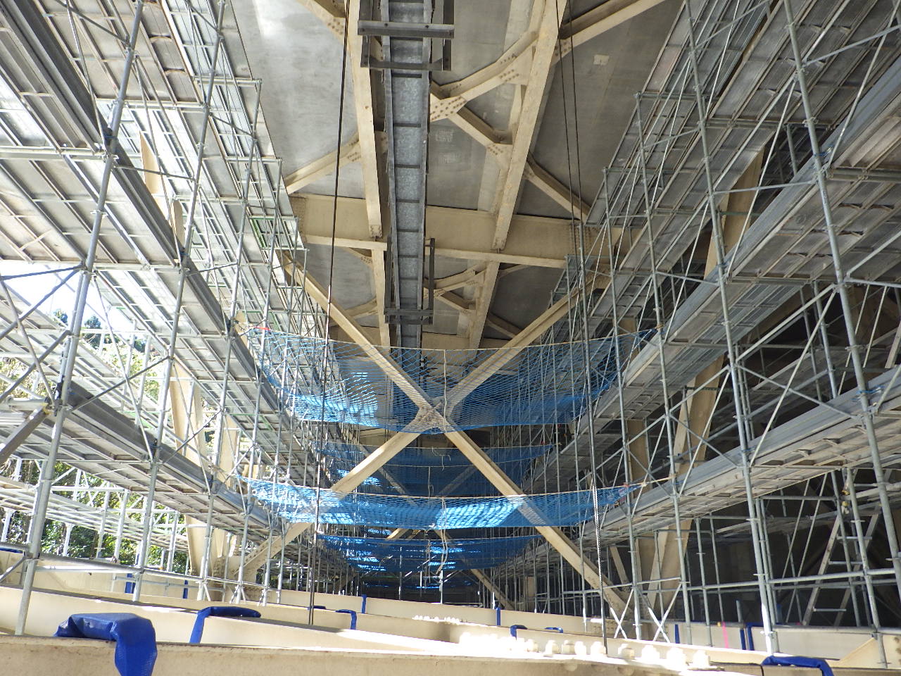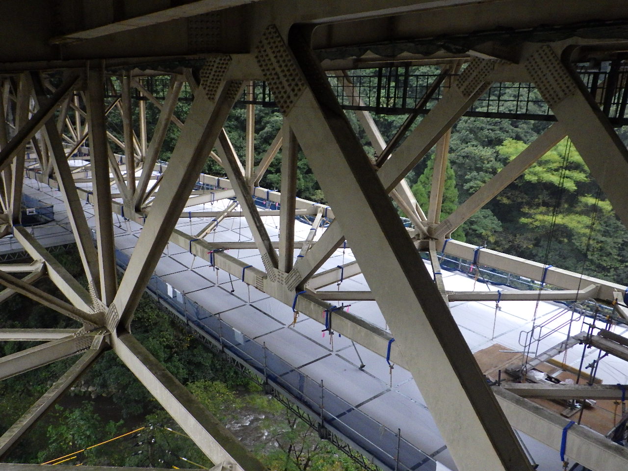 床版取替後は、耐震補強や桁の塗り替えに移る。思川橋は既設の鋼製支承をゴム支承に交換する。また約1,600㎡を塗り替える。既設塗膜の膜厚は平均400μmで鉛を含有している。1種ケレンで施工する。