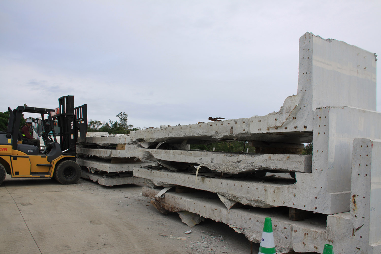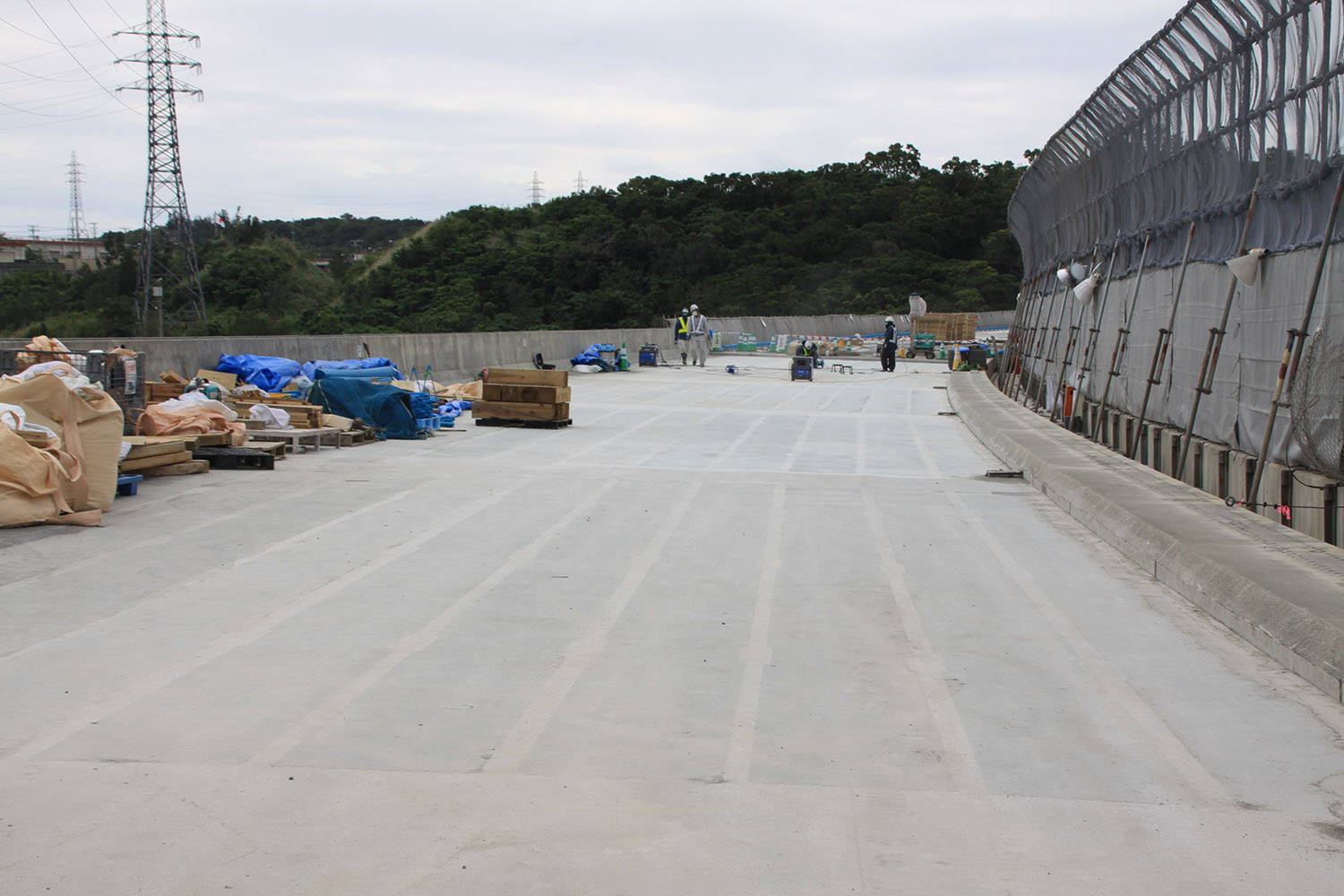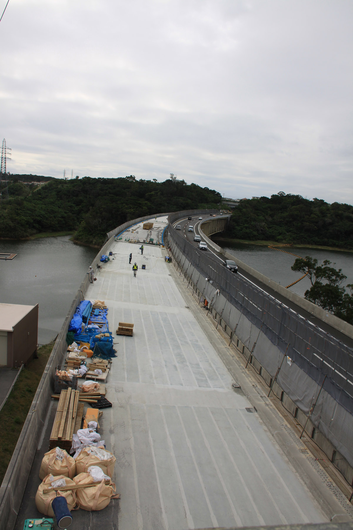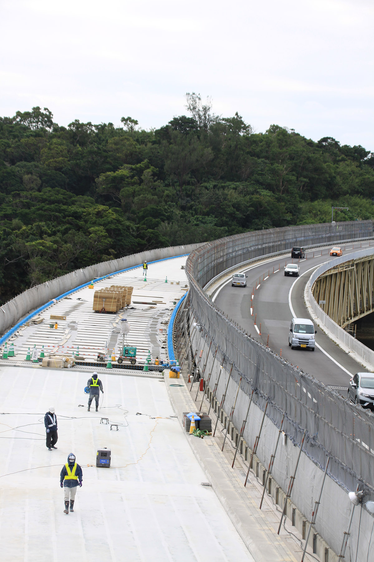 沖縄自動車道の北部区間は、沖縄海洋博(1975年7月20日~76年1月18日まで開催)のために施工期間約2年の突貫工事で施工された。コンクリート中の塩分総量規制前に建設されており、十分に除塩されていない(かつ空梅雨だった)海砂をコンクリートの細骨材として使用したことにより、既設のIBグレーチング床版において劣化や床版上面の浮きが見られる状況となっていた。今次床版も内在塩分量を調査した結果、1.7~2.3㎏/㎡に達していた。取替区間の床版はいずれもグレーチング床版であり、床版厚は210mmで増厚はしていない。