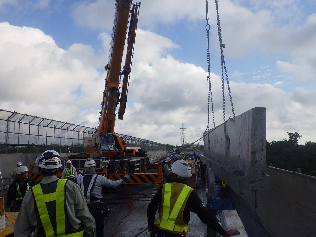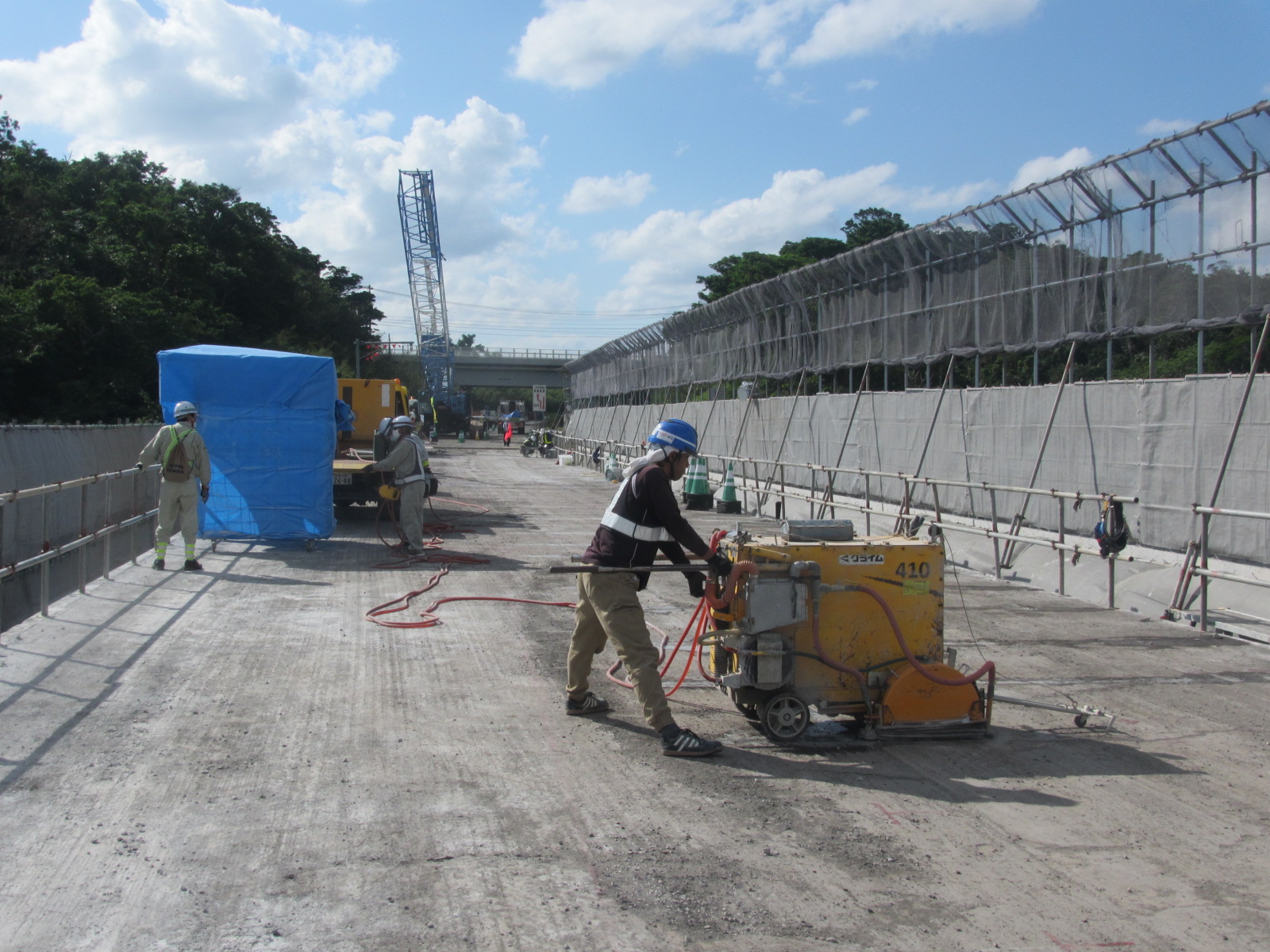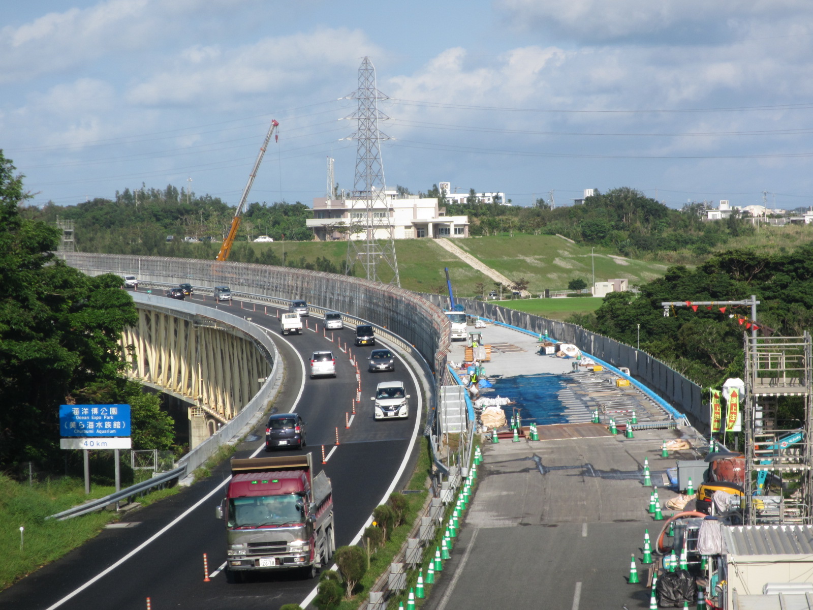沖縄自動車道の北部区間は、沖縄海洋博(1975年7月20日~76年1月18日まで開催)のために施工期間約2年の突貫工事で施工された。コンクリート中の塩分総量規制前に建設されており、十分に除塩されていない(かつ空梅雨だった)海砂をコンクリートの細骨材として使用したことにより、既設のIBグレーチング床版において劣化や床版上面の浮きが見られる状況となっていた。今次床版も内在塩分量を調査した結果、1.7~2.3㎏/㎡に達していた。取替区間の床版はいずれもグレーチング床版であり、床版厚は210mmで増厚はしていない。