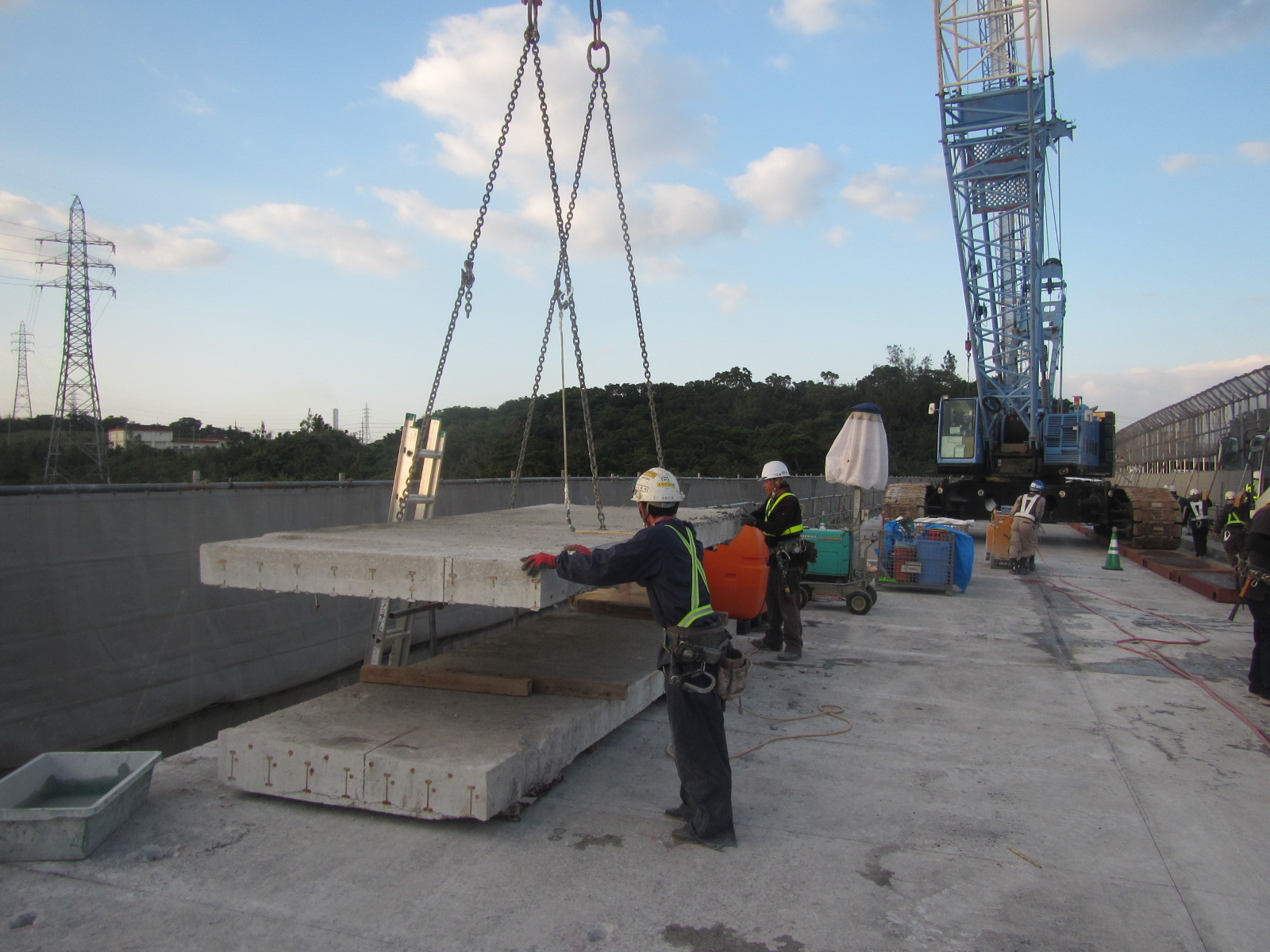 まず撤去である。足場を設置後(クイックデッキを採用)、路肩部の壁高欄と中央分離帯の地覆は、それぞれ8mの長さで切断し先行して撤去した。床版の撤去寸法は代表的なもので4.3×2.0mであるが、橋軸直角方向のコンクリートカッター切断時、鋼桁の添接板を避けた位置で切断するため、寸法は少しずつ変わっている。切断後は、油圧ジャッキを用いてうき剥がし、120t吊クローラークレーンを2台使用して、撤去・架設していった。一部区間では上空に高圧線が配置されていることから門型架設機を使用して施工していった。撤去版の数量および重量は億首川橋で486枚(2,038t)、明治山第一橋で230枚(1,120t)に及んでいる。