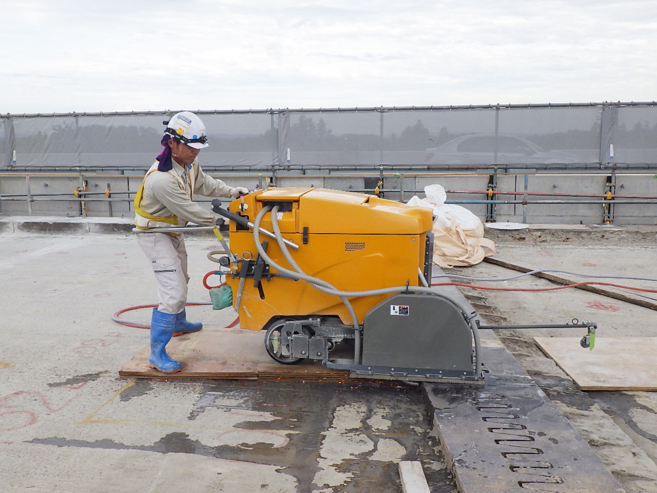 既設床版の橋軸直角方向の切断は2.2m間隔で施工した。これはクレーンを配置する前にコンクリートカッターにより事前に施工している。橋軸方向は中間桁の中心で2分割に切断する(6,050mmと5,620mm)が、これはクレーンを配置した後にそのつど施工した。撤去重量はそれぞれ約9.6tと8.8t。