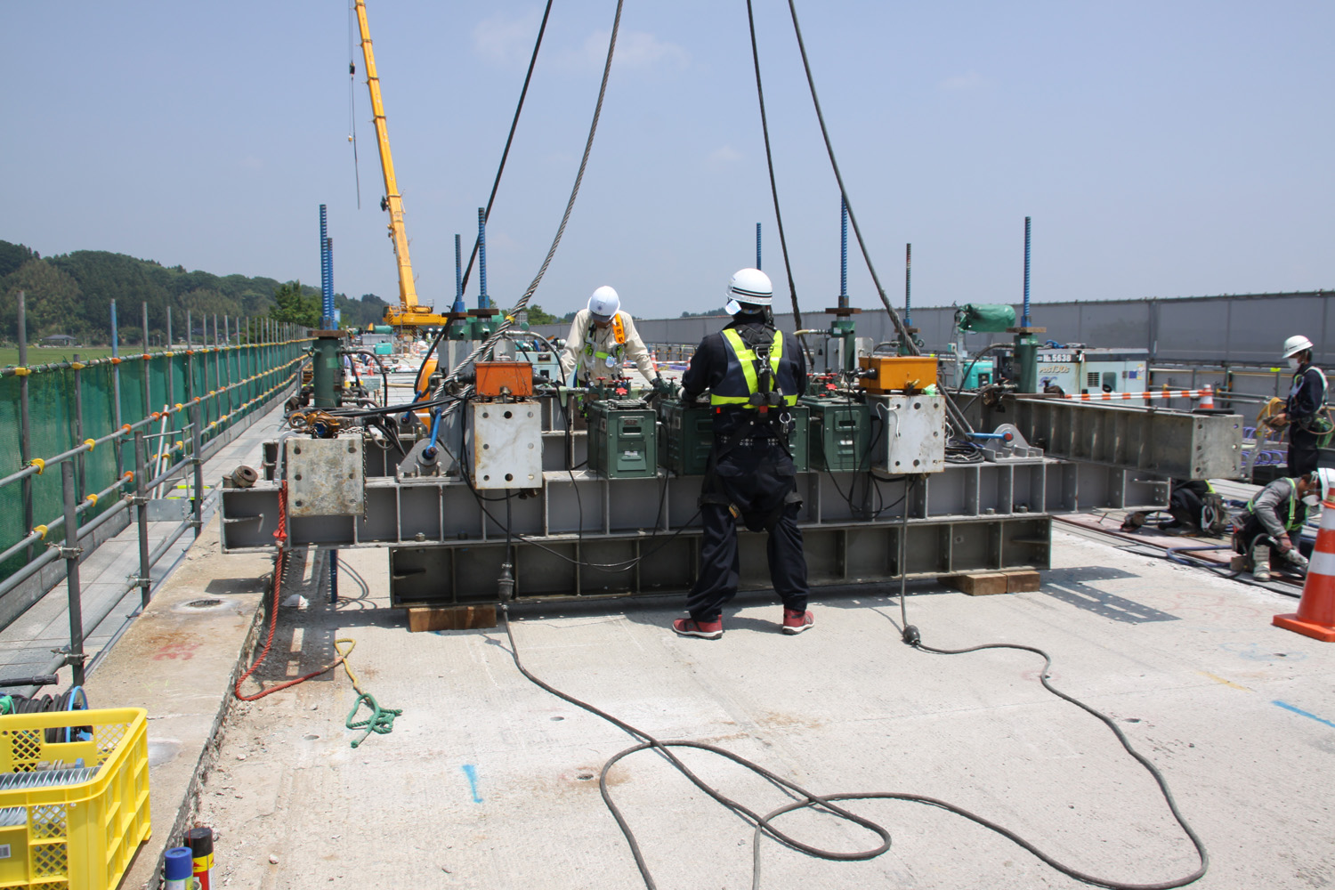 伸縮装置の切断/油圧ジャッキの数を従来の2列4基配置から4列8基配置に倍増し、慎重に剥離作業を行った