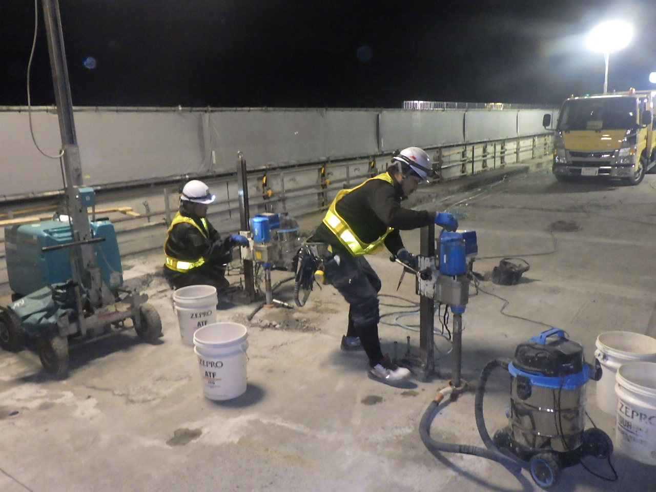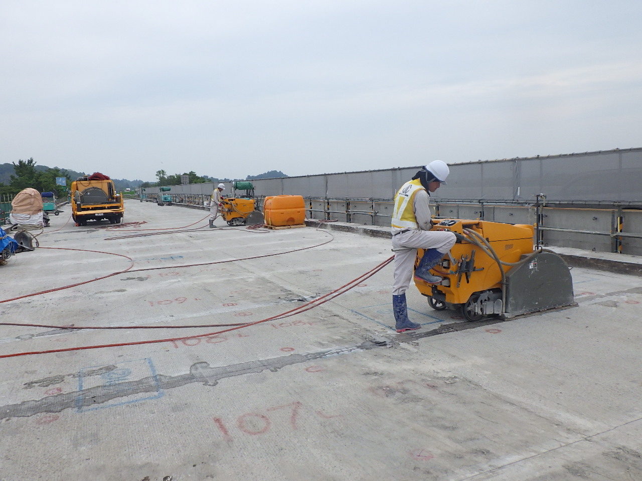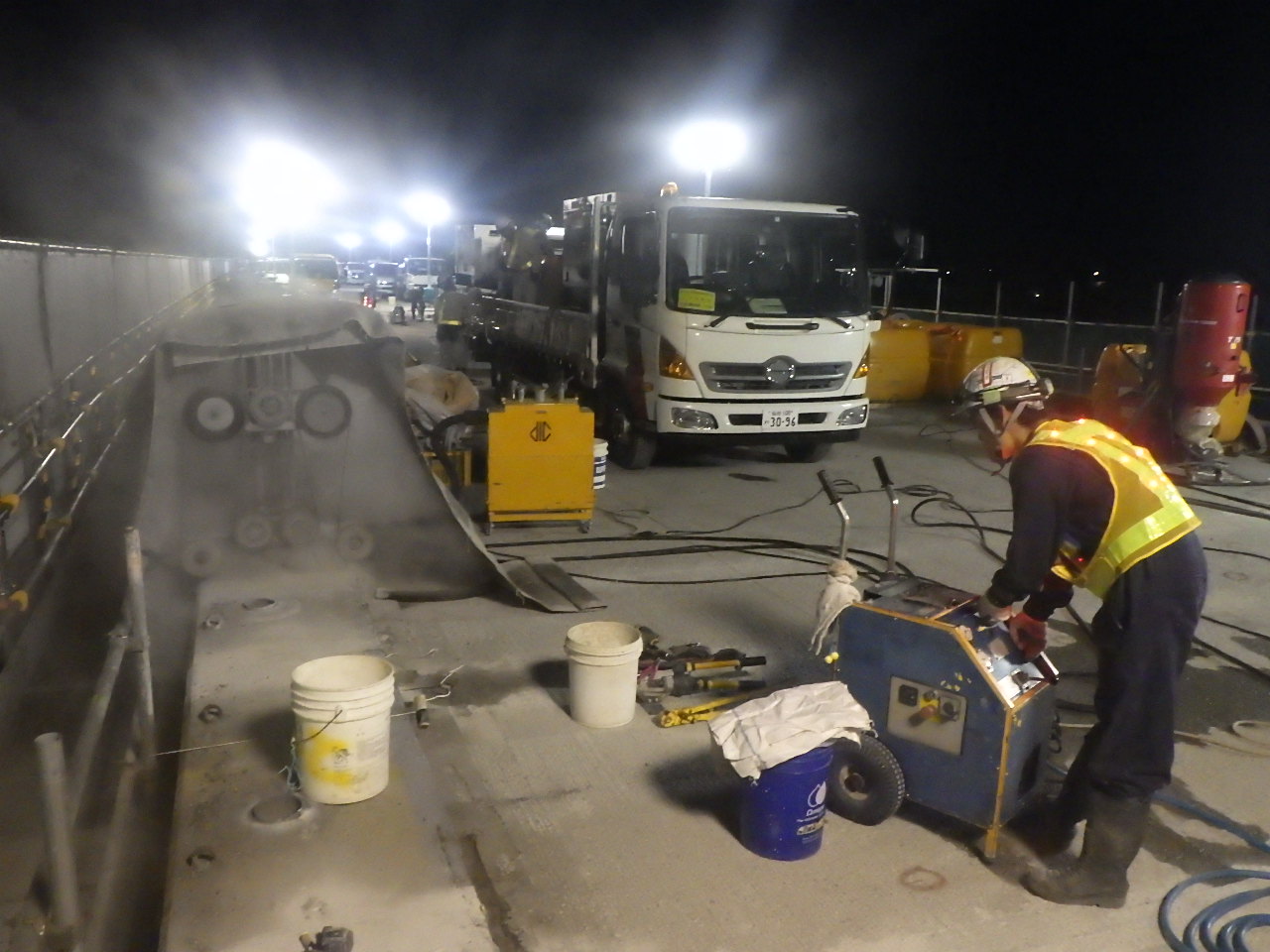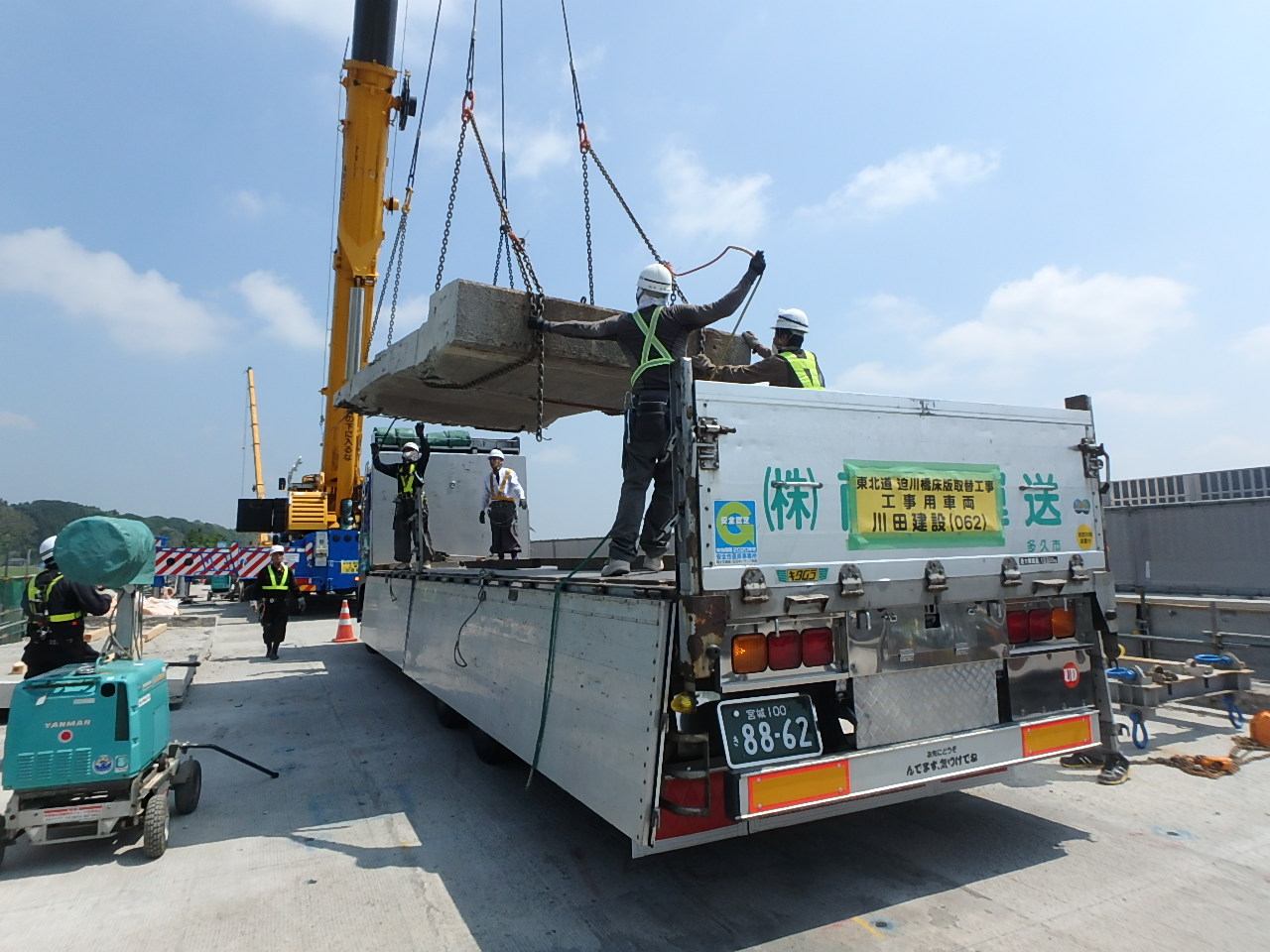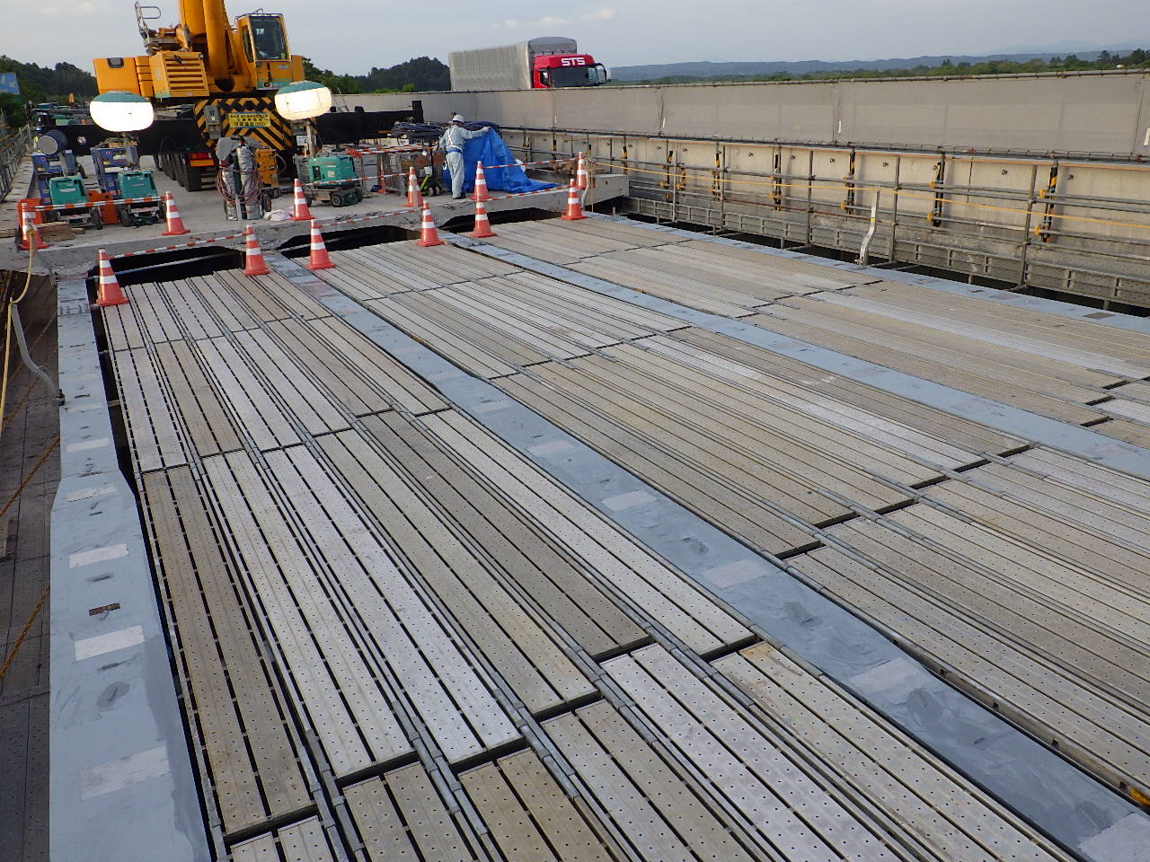 撤去時において難しいのが床版剥離作業だ。下り線の床版は劣化が激しい。強引に剥がすと吊り上げ時にコンクリートの剥落、最悪の場合には割れを生じ、作業員や対向車線に被害をもたらす危険性がある。そのため専用の剥離装置に装備する油圧ジャッキの数を従来の2列4基配置から4列8基配置に倍増し、慎重に剥離作業を行った。その後220tクレーンで既設床版を吊り上げ、上り線と逆側に旋回させ、トラックに積み込んで撤去した。撤去数量は192枚に及んだ。