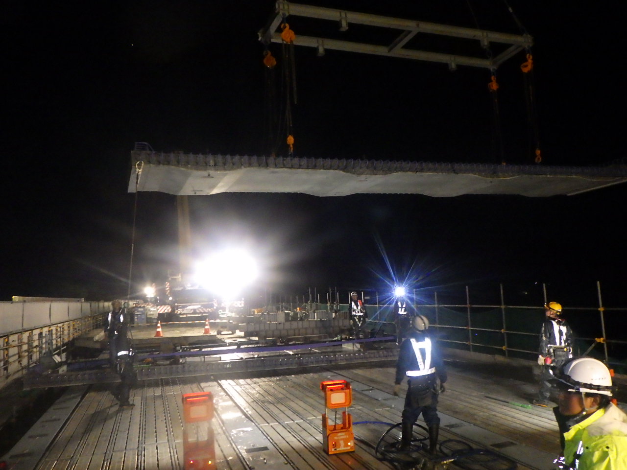 ケレン及び塗布作業が完了した後、新設PC床版を架設する。1日当たり片方で7枚設置する。設置するパネルの寸法(標準板)は橋軸方向1,860mm×橋軸直角方向11,400mmで床版厚は220mm、重量は13.2t(端部は寸法が多少変わるため15.0t)で、総計96枚(1,265t)を架設する。設置後、主桁ずれ止め用のスタッドジベルを溶植し、間詰鉄筋を挿入する。