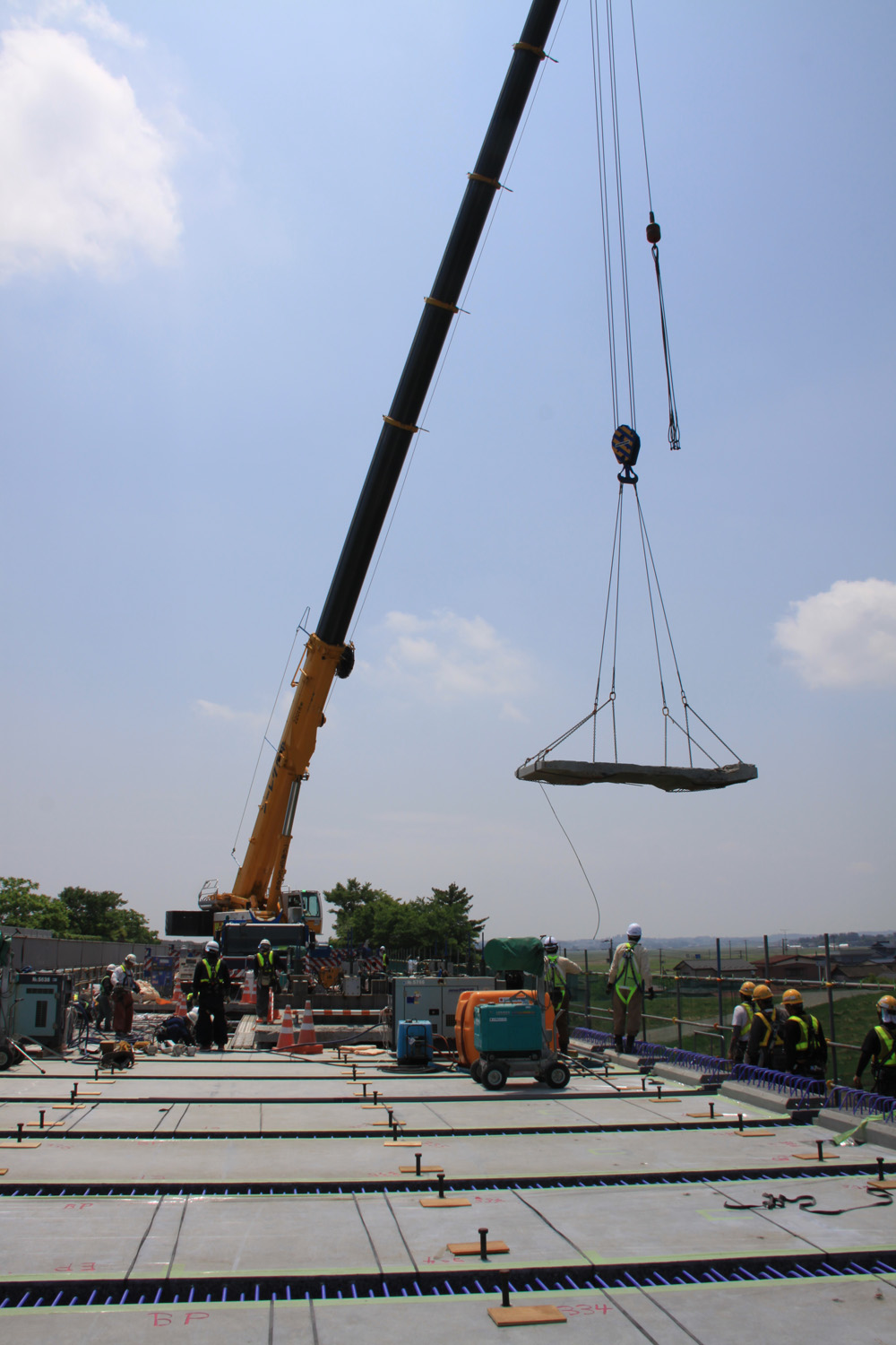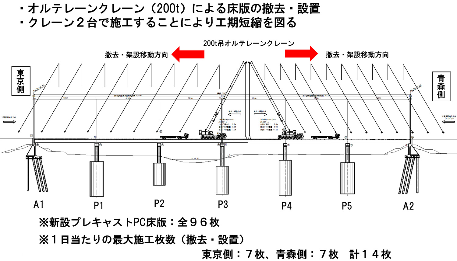 床版の撤去・設置はA1、A2側に220tオールテーレンクレーンを配置して、架け違い部のP3橋脚から両端へ開いていく形で施工した。同橋の最外側は高欄ではなくガードレールを設置しており、その撤去は規制を始めた後、先行して行った。高欄の先行切断がなかっただけでも施工上の負担は大分軽減されている。