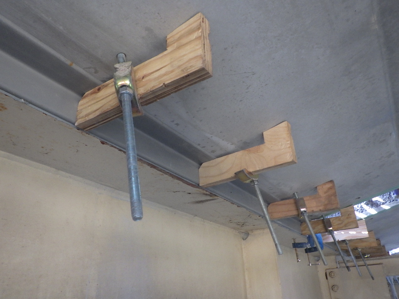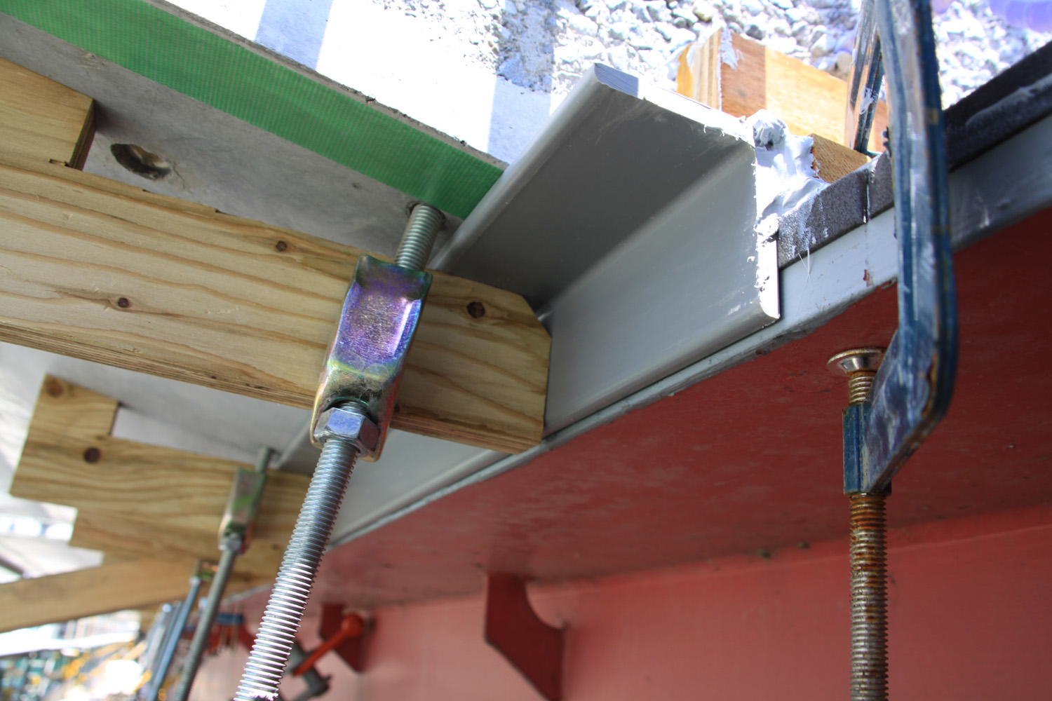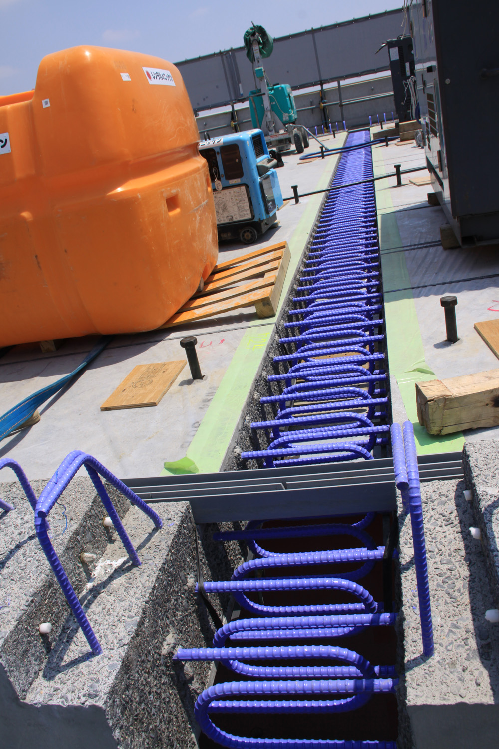床版設置の翌日、無収縮モルタルを打設し、床版と上フランジを一体化させるが、その時に使っているのが塩ビアングル枠と呼ばれる型枠だ。