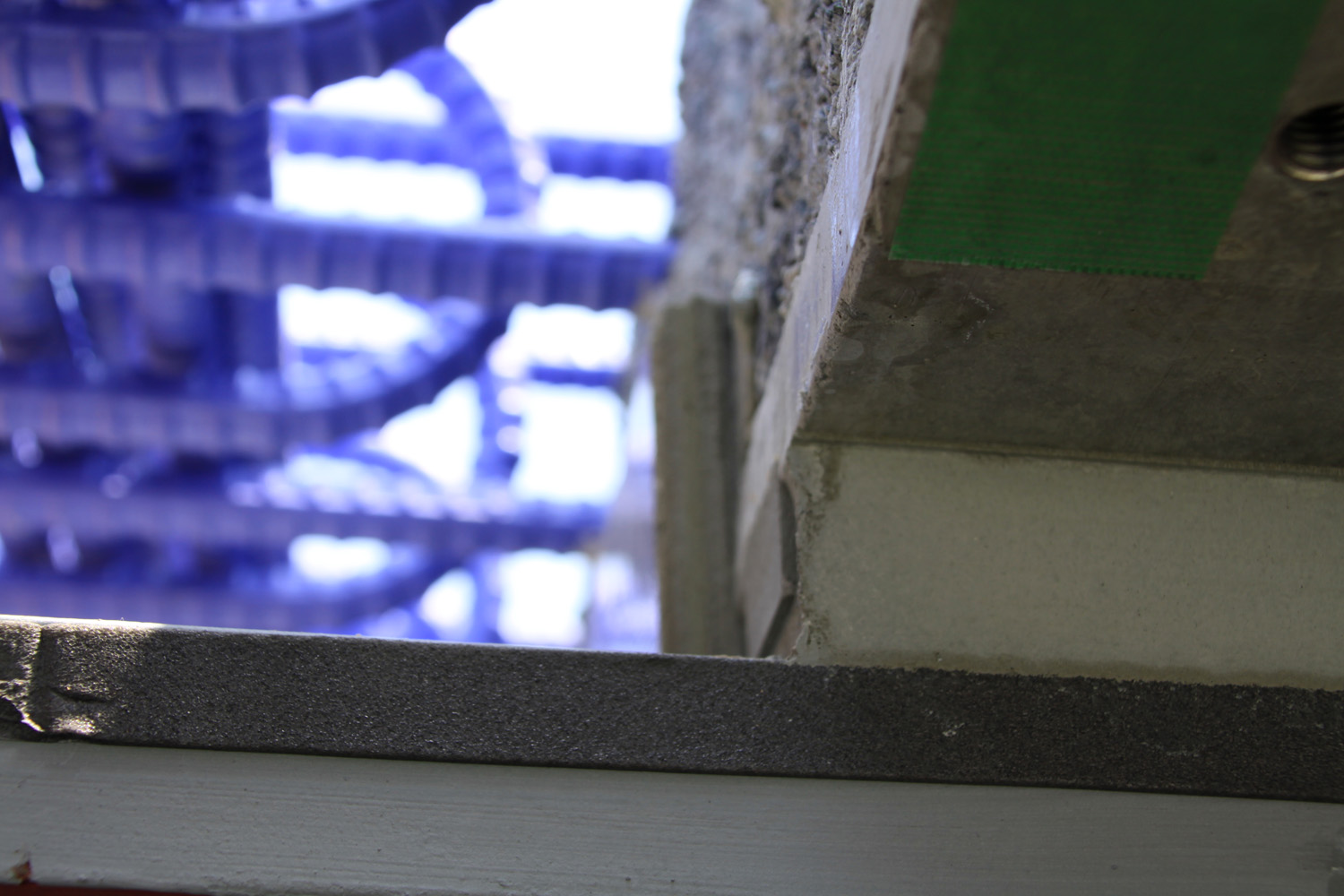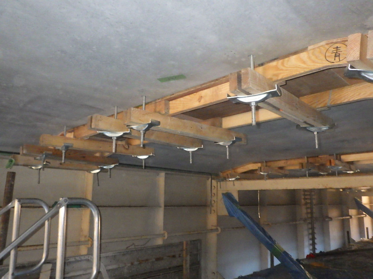 濃い灰色のテープが止水膨張テープ/木製の型枠を作り、同所からの溢出によりモルタルの充填を確認する