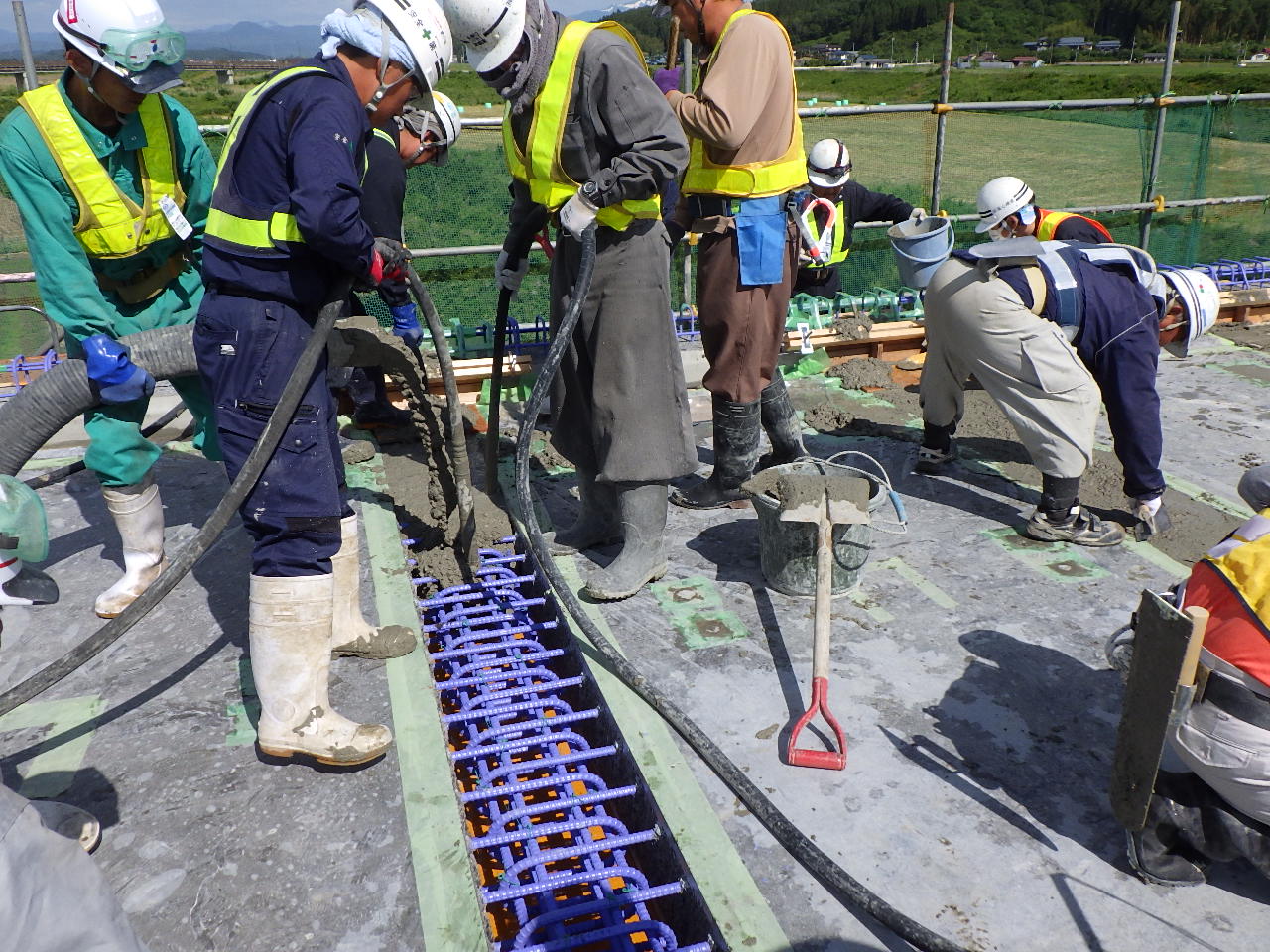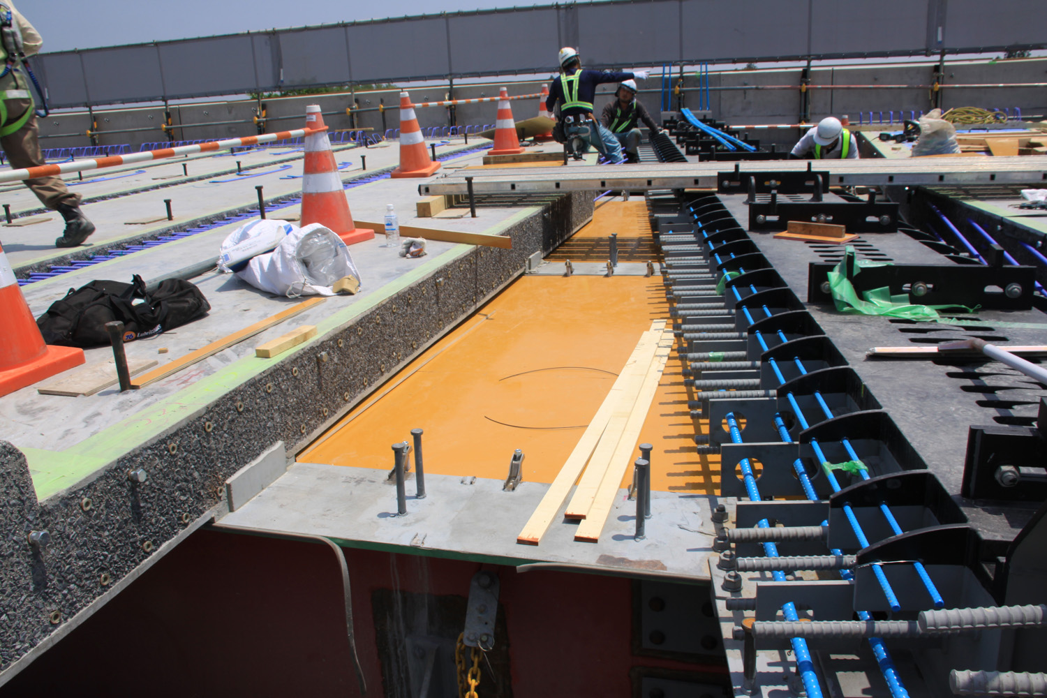床版間の継手はループ継手を使っており、間詰幅は340mmに達する。間詰厚は床版部と同じく220mm。同現場では当初アゴありの床版で発注されていたが、現在の設計要領に合わせてアゴなしの床版に変更したため、吊り型枠を用いた。間詰コンクリート及び端部の現場打コンクリートの打設はクレーンなどの段取りを考慮して、全パネル設置後にまとめて施工した。