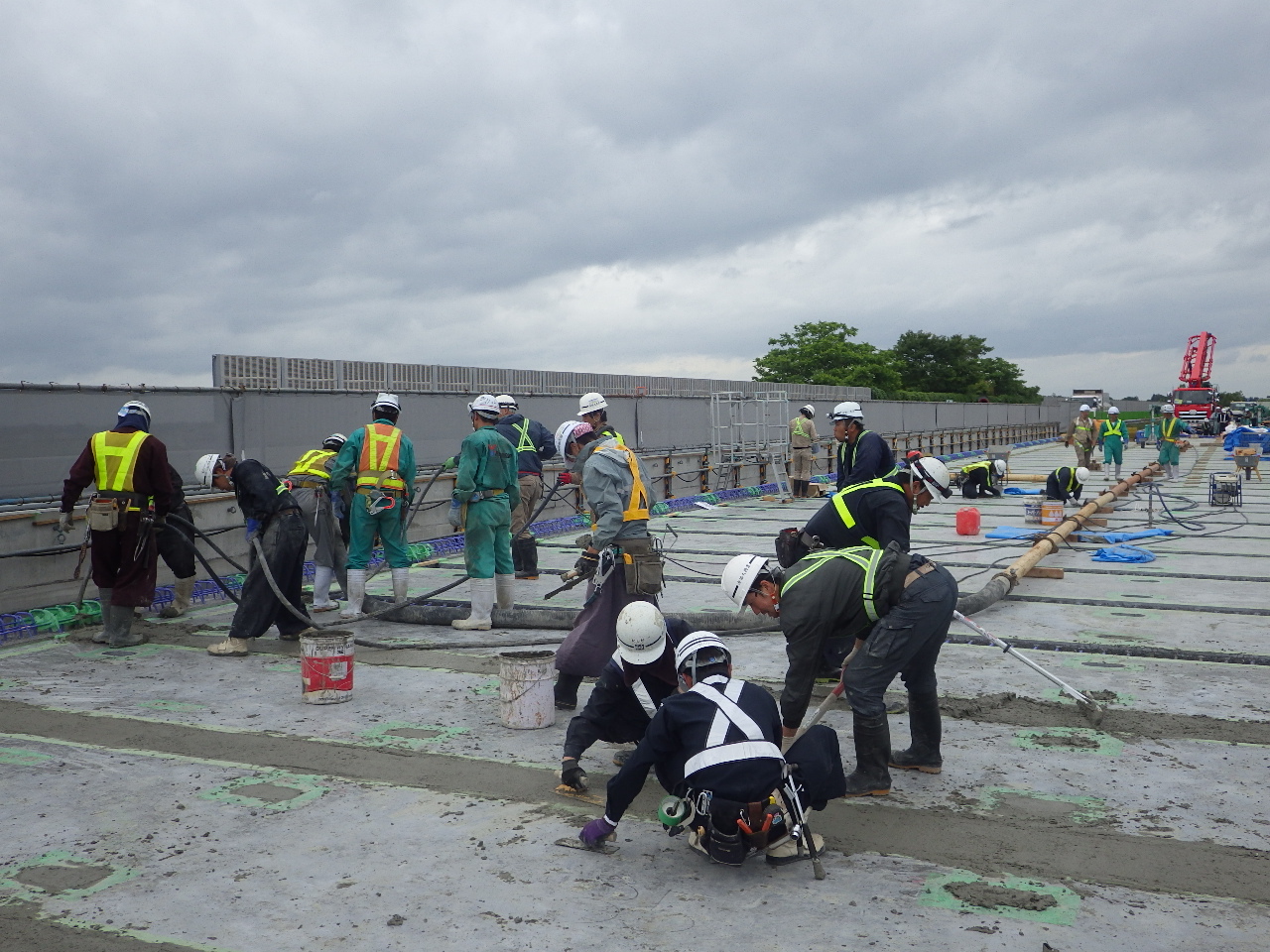 雨天時には仮設屋根を用いて施工し、工期のずれが出ないように努めている。