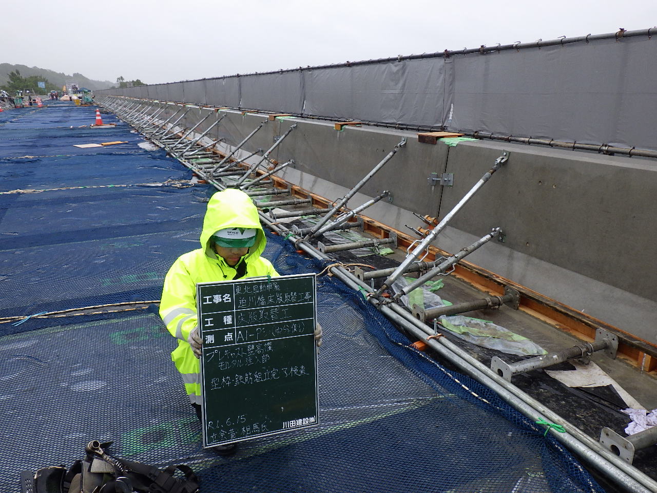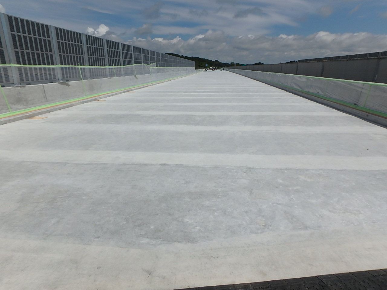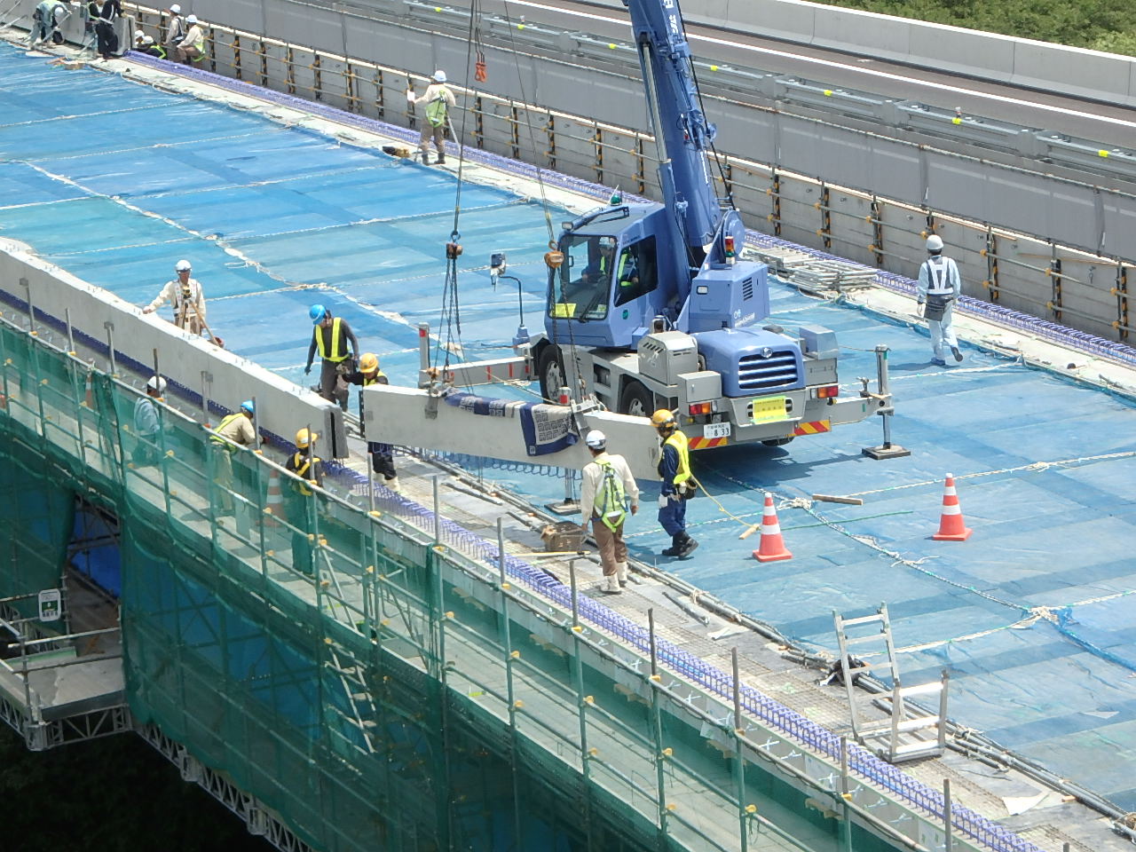 プレキャストPC床版の製作にあたっては、工場製作中にもタンピングを行い、気泡を減らすように努めた。さらに蒸気養生して耐久性を向上させた。さらに防水の付着性向上のため表面を研磨し、後工程に配慮した。また、施工中は床版上面にビニル状の保護シートを貼って作業によって傷や汚れがつかないように配慮している。鉄筋も防食性を高めるためプレキャストPC床版の橋軸方向および壁高欄との継手部、床版継手部、両端の現場打ち部は全てエポキシ樹脂塗装鉄筋を採用している。さらに間詰部とP3橋脚上の現場打ち部には早強コンクリート、早期に強度発現が必要な端部の場所打ち部では普通ポルトランドセメントを使用した設計基準強度30N/m㎡のコンクリートに「速硬性混和材Facet(ファセット)」を後添加したコンクリートを用いることで、プレキャスト床版部と同様に最終的に強度が50N/mm2になるようにし、端部が弱点になることを防いでいる。