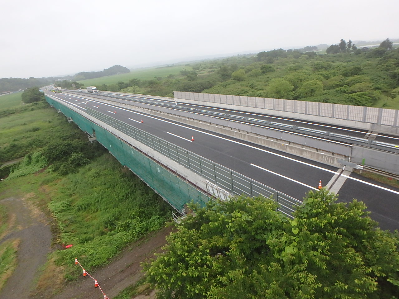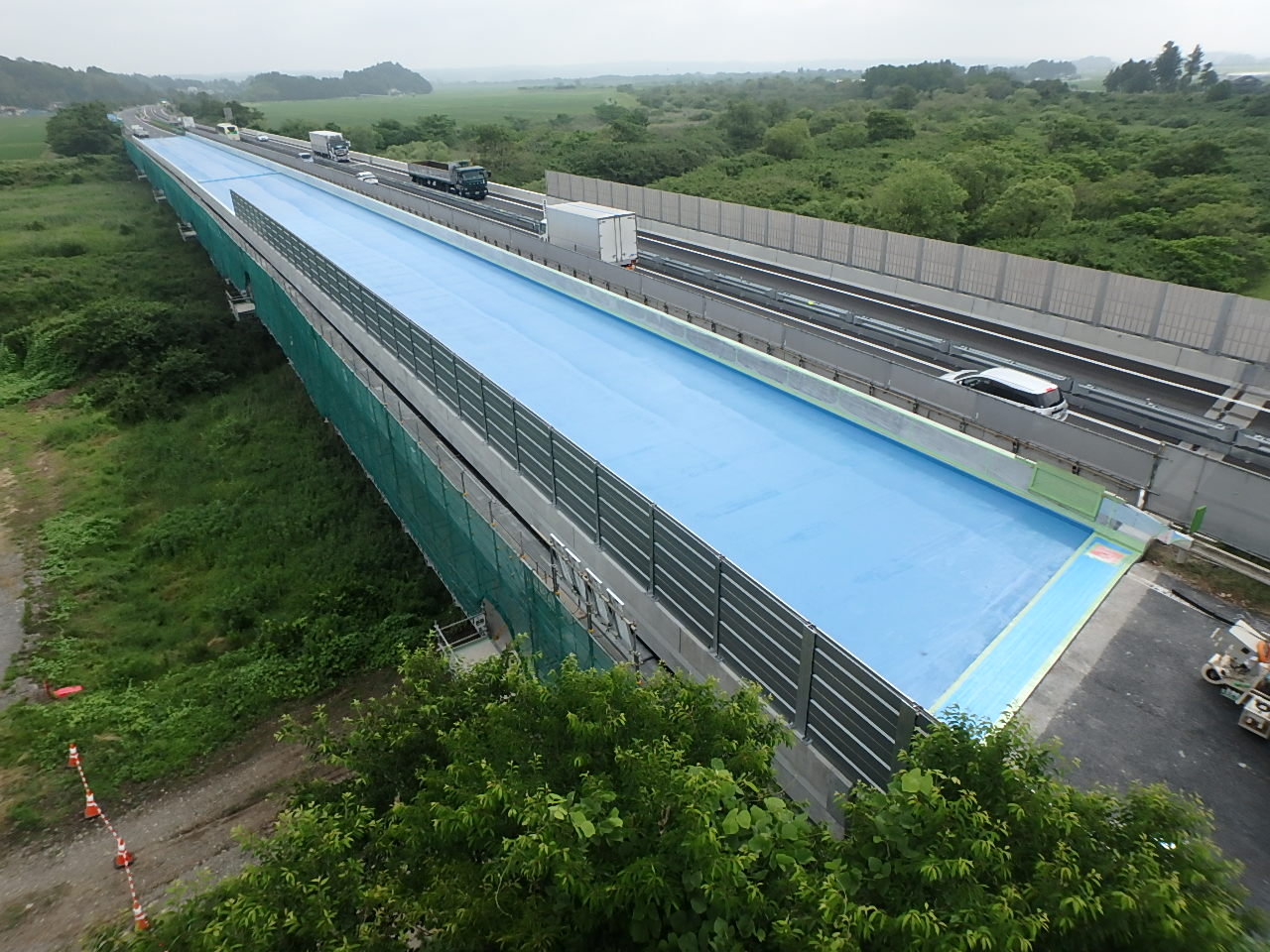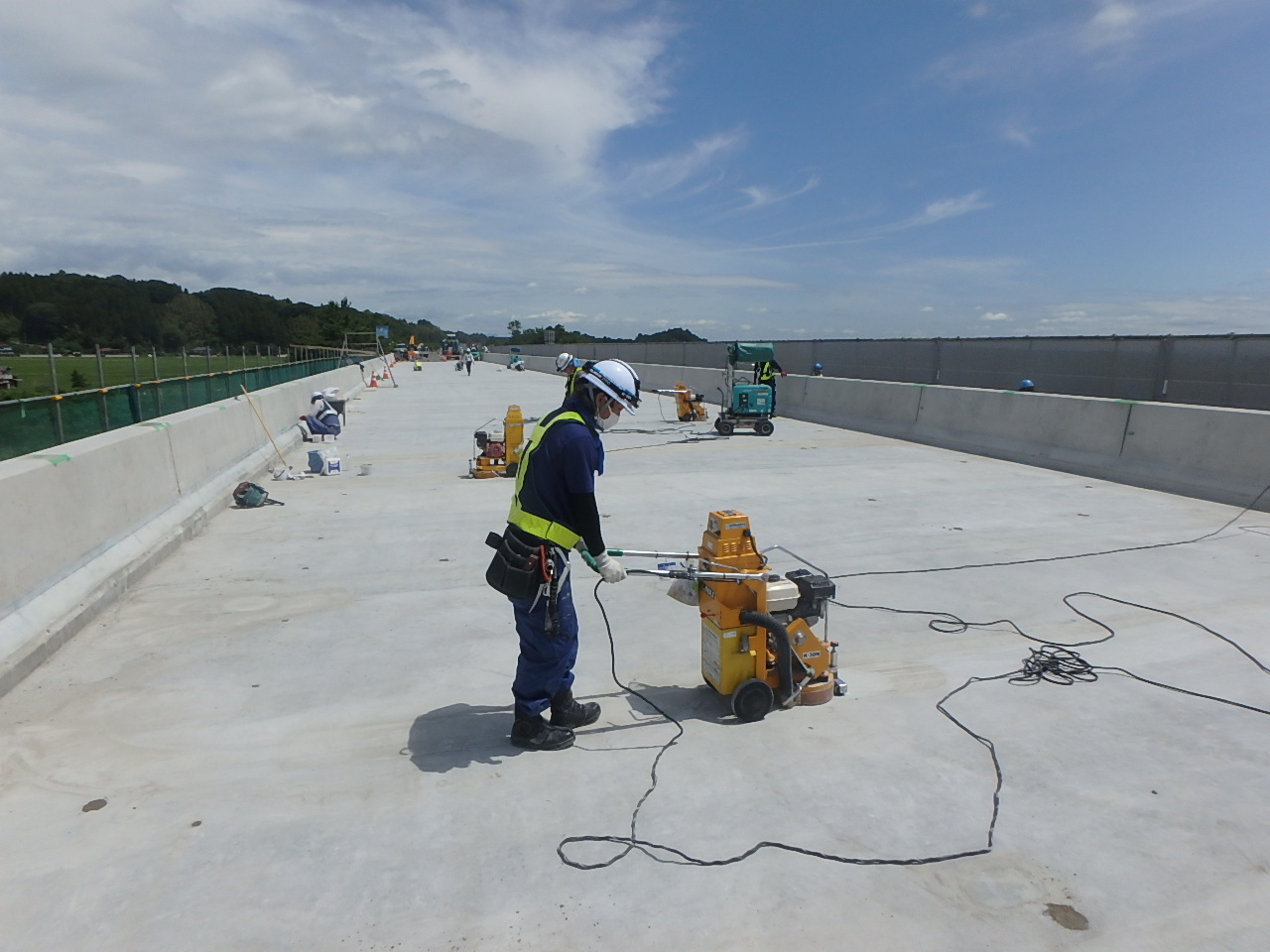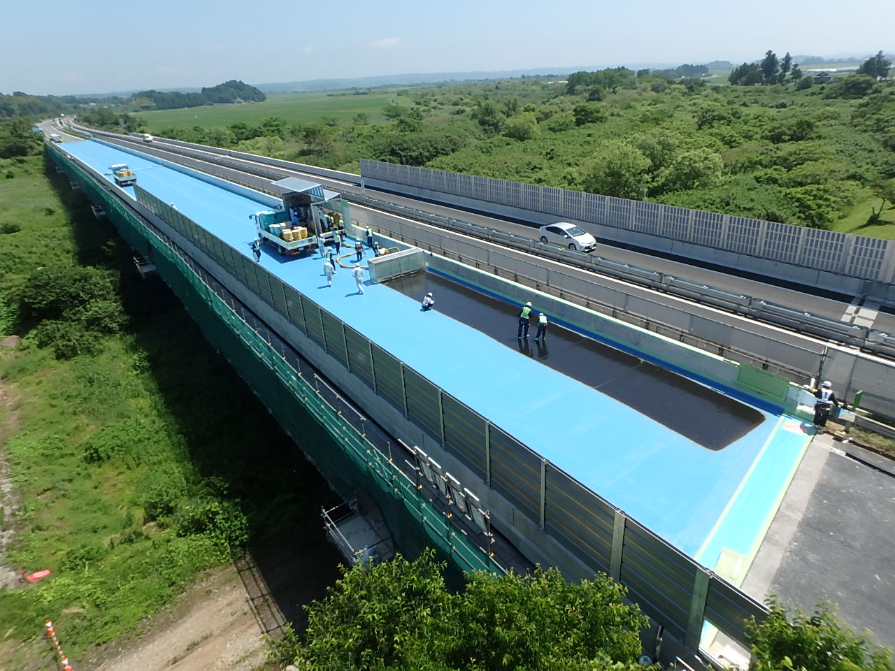 床版防水は高性能床版防水(グレードⅡ)を採用する。迫川橋では耐久性の高いアスファルトウレタン系の『HQハイブレンAU工法』を吹付け施工した。床版と防水層の接着剤にはエポキシプライマー、防水材としてはアスファルトウレタン系の樹脂を床版面と地覆立ち上がりまで施工する。舗装と防水層の接着層にはポリマー改質アスファルト接着剤、次いで珪砂を散布する。また地覆立ち上がり部には端部保護材としてウレタン系の樹脂を塗布した。その後の舗装は規定通り、基層にFB13、表層に高機能舗装Ⅱ型を使用している。なお舗装はホットジョイントにて施工した。