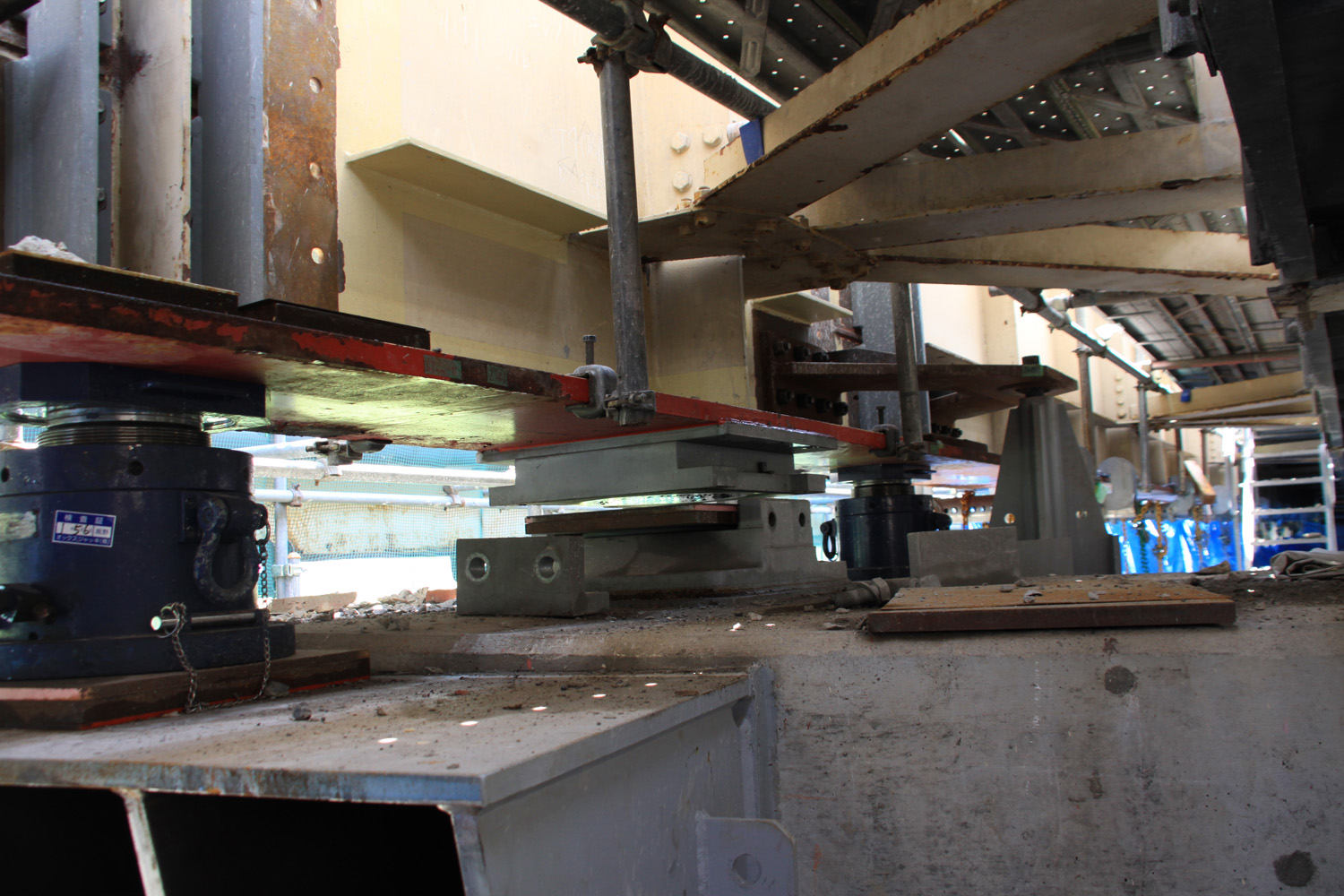 同現場では、床版のほかに、支承の交換(鋼製支承→ゴム支承)を32基、落橋防止装置の設置も行う。その施工性を考慮して、足場には先行床施工式フロア型システム吊り足場『クイックデッキ』を採用している。作業床を先行して構築できるため足場から乗り出して作業することが不要になるため安全性が高いのが特徴。施工の面においても、吊り材間隔が広く、開口部段差が無い足場であり、作業効率・安全性が高く、「今回工事のように支承取替を同時に行う場合は、大型ブラケットの取り込みなどで非常に有効」(川田建設)としている。