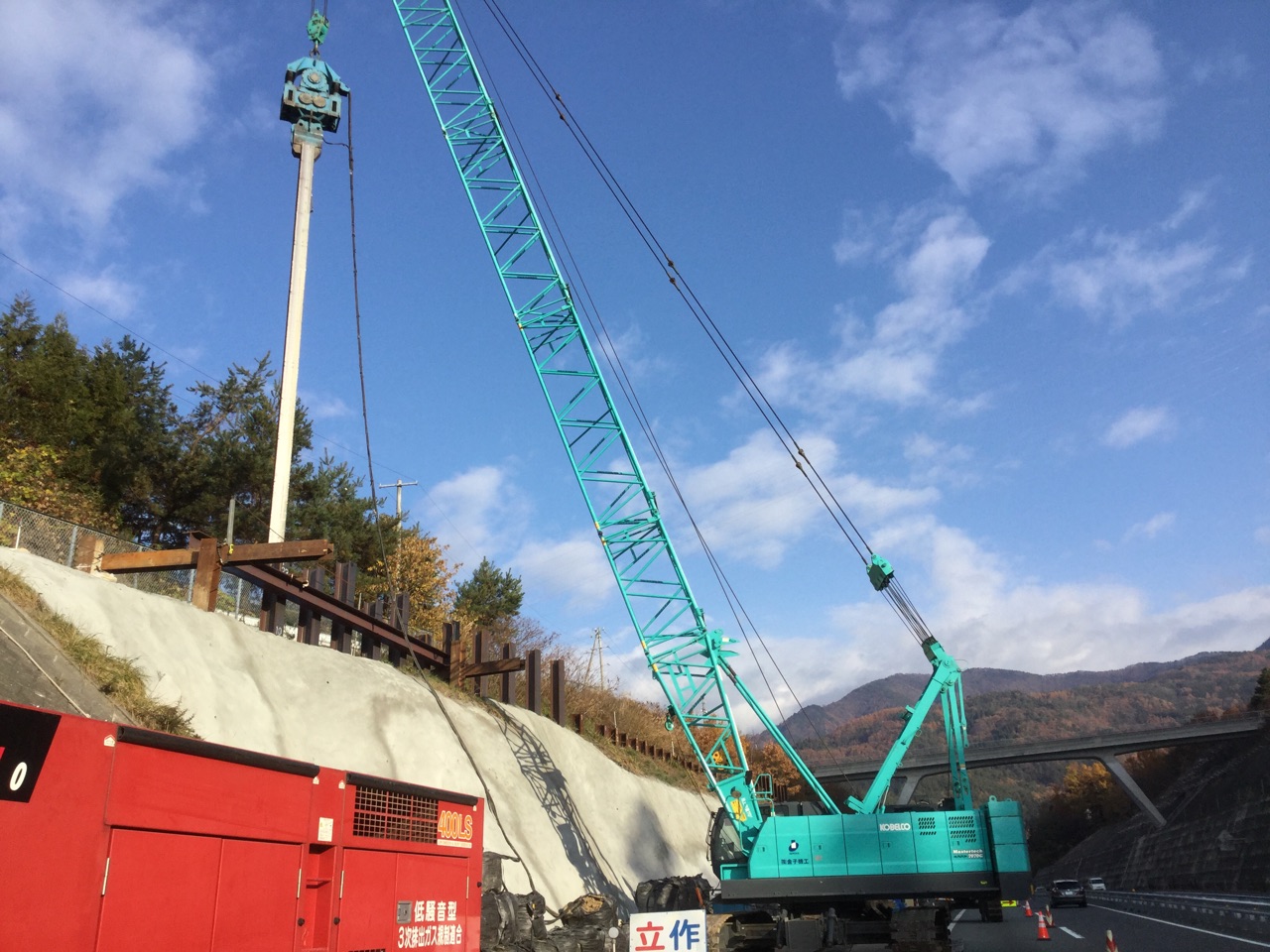 H型鋼(H-350)は、バイブロハンマーをクレーンで吊下げ、振動力をH型鋼に加えて周辺摩擦力・先端支持力を低減させて地中に慣入させる「バイブロ工法」を用いて、166本を長さ9~12mで打設した。坂城町管理の蓬平橋の下は杭頭制限があるため、鋼管(D508)を8mの長さで9本打設している。