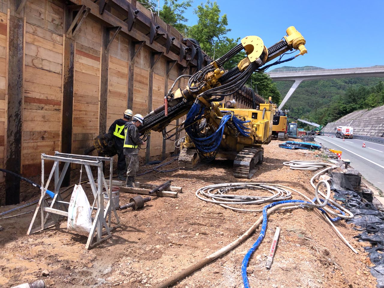 その後、横矢板、グラウンドアンカー工の施工に着手し、φ115mmのグラウンドアンカーを1段目に168本(L=10.5~15.0m)、2段目に76本(L=9.0~12.0m)を6月下旬までに打設した。