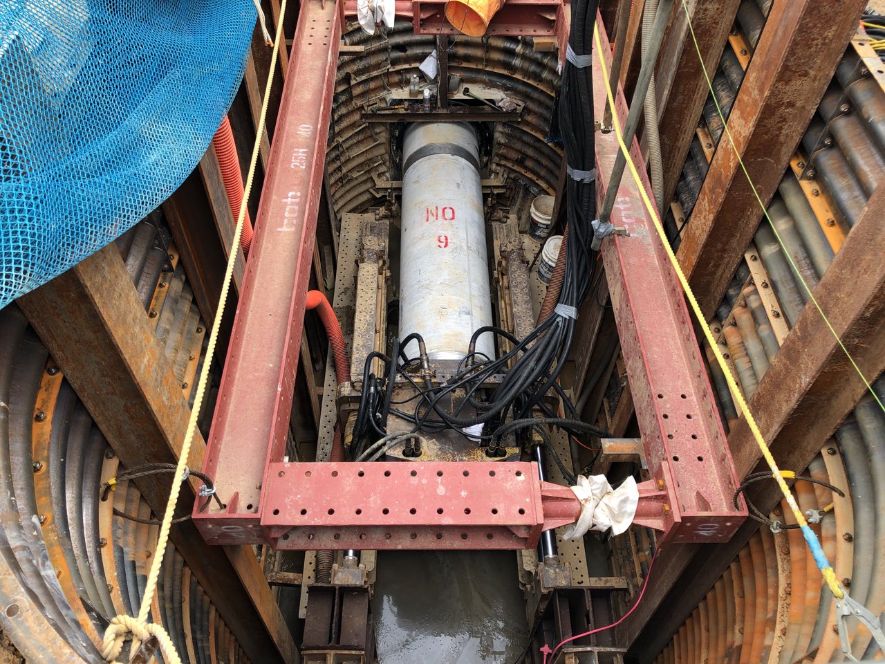 門型カルバートの基礎は鋼管杭で、中壁部はφ1,500mmを170本、側壁部はφ1,000mmを436本圧入する計画になっている。長さは当初計画ではセンター部が最大約18m、側壁部が最大約13mだが、本設での杭長決定に際し先端支持力を確認するために、現場で「鋼管基礎杭急速載荷試験施工」を1月から6月まで実施した。全工事終了後に門型カルバートに電気を供給する電気室の場所を試験ヤードとして鋼管杭6本(φ1000 L=13m、17m、21m φ1500 L=13m、17m、21m)圧入し、先端支持力の計測を行った。