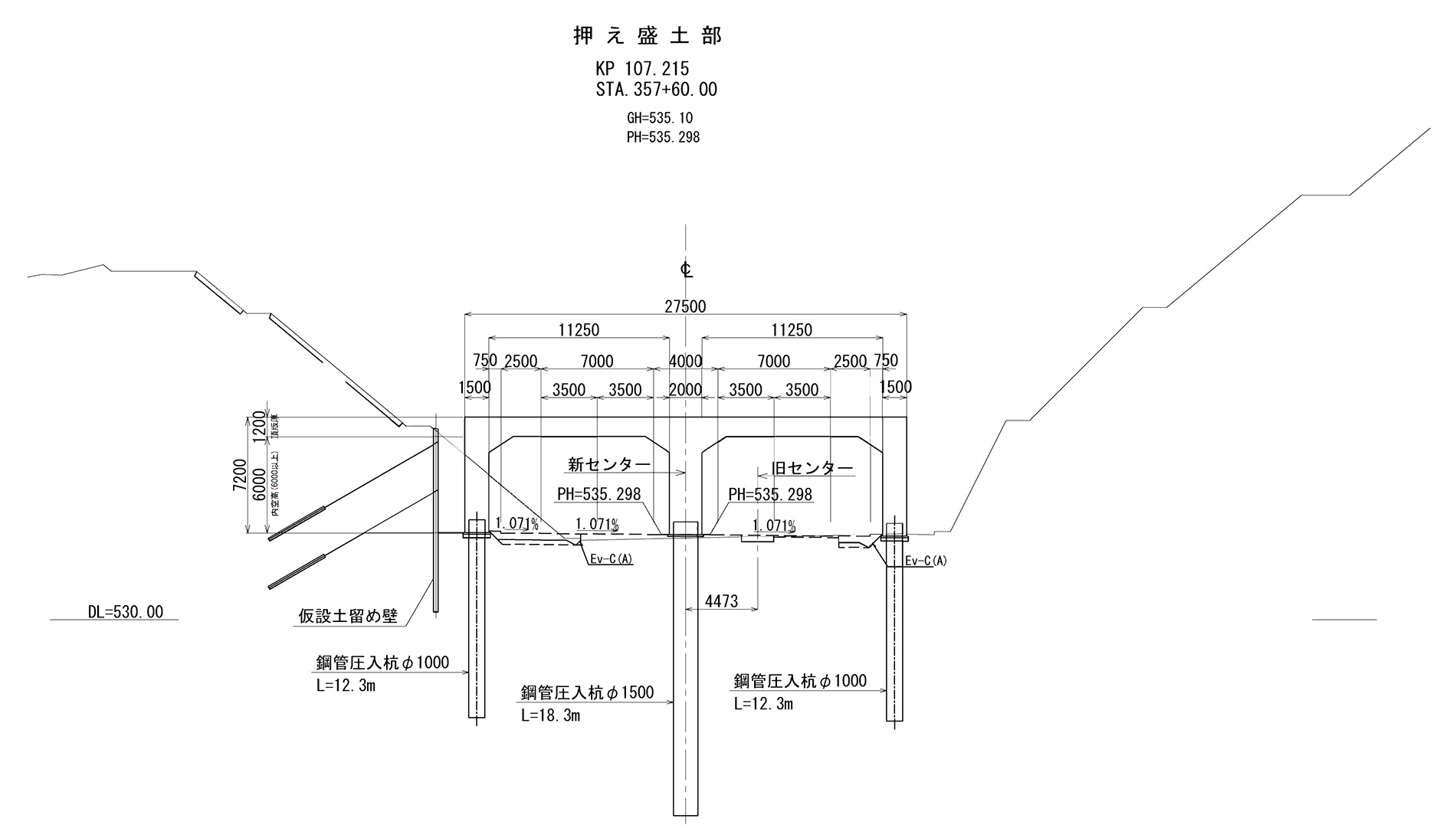 鋼管基礎杭の試験施工(大柴功治撮影)/門型カルバート断面図