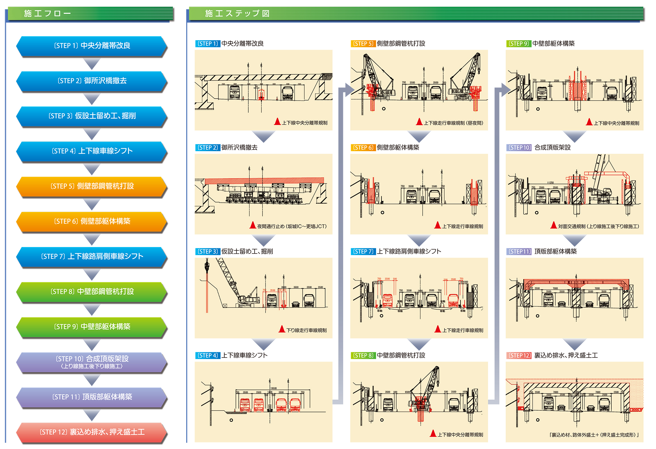 その後は、鋼管杭圧入が完了した箇所から躯体構築を行い、2021年には合成頂版の架設を予定している。頂版部の躯体構築後に、約18万m3の押さえ盛土工を実施して工事が完了する。全工程を通して車線規制期間が長く、とくに合成頂版施工時は上下線あわせて約100日間の対面通行規制となる。NEXCO東日本では、情報板やWEB、ポスターなどで規制の周知を図るとともに、WEBカメラなどを活用して交通安全の確保に努めている。また、夕方には渋滞が発生する可能性があるために、早めに規制解除を行うといった対策も行っている。