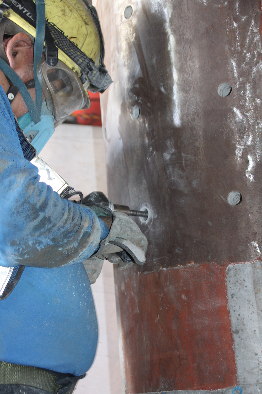 記者が取材に入った際は、P1側の橋脚補強を進めていた。補強はまず既存橋脚をドリルで削孔し、さらにコンクリートが詰まっている個所についてはワンサイドボルトを設置するため、拡張ナット状の隙間を確保すべくダイヤモンドバーと呼ばれる器材(写真)をφ125用のディスクグラインダー用機器のヘッドに装着し、ドリル削孔した孔に突っ込んで拡張していく。ダイヤモンドバーは偏芯搖動するように作られており、ストレートに孔に突っ込んだ後、施工者が上下左右に動かすことより、孔径を大きくしていく。中にコンクリート粉が詰まると施工できないため、その都度内部をバキュームして粉を吸い取り、またダイヤモンドバーで削孔し、最終的に形状を確認する専用の機材を挿入し、ワンサイドボルトの施工が可能かどうかを確かめる。「1本あたり30分はかかる」(元請のショーボンド建設)ため1人1日当たりの施工数は「15本程度」。橋脚2基合わせてこうした孔を1,200本施工せねばならず、相当に骨が折れる作業だ。また、施工時は車道に切粉が飛ばないように養生しながら施工していた。削孔から拡張までは「少なくとも1か月はかかる」(同社)見込みだ。上側削孔時は高所作業車を用いるため、1車線規制しての施工となる。