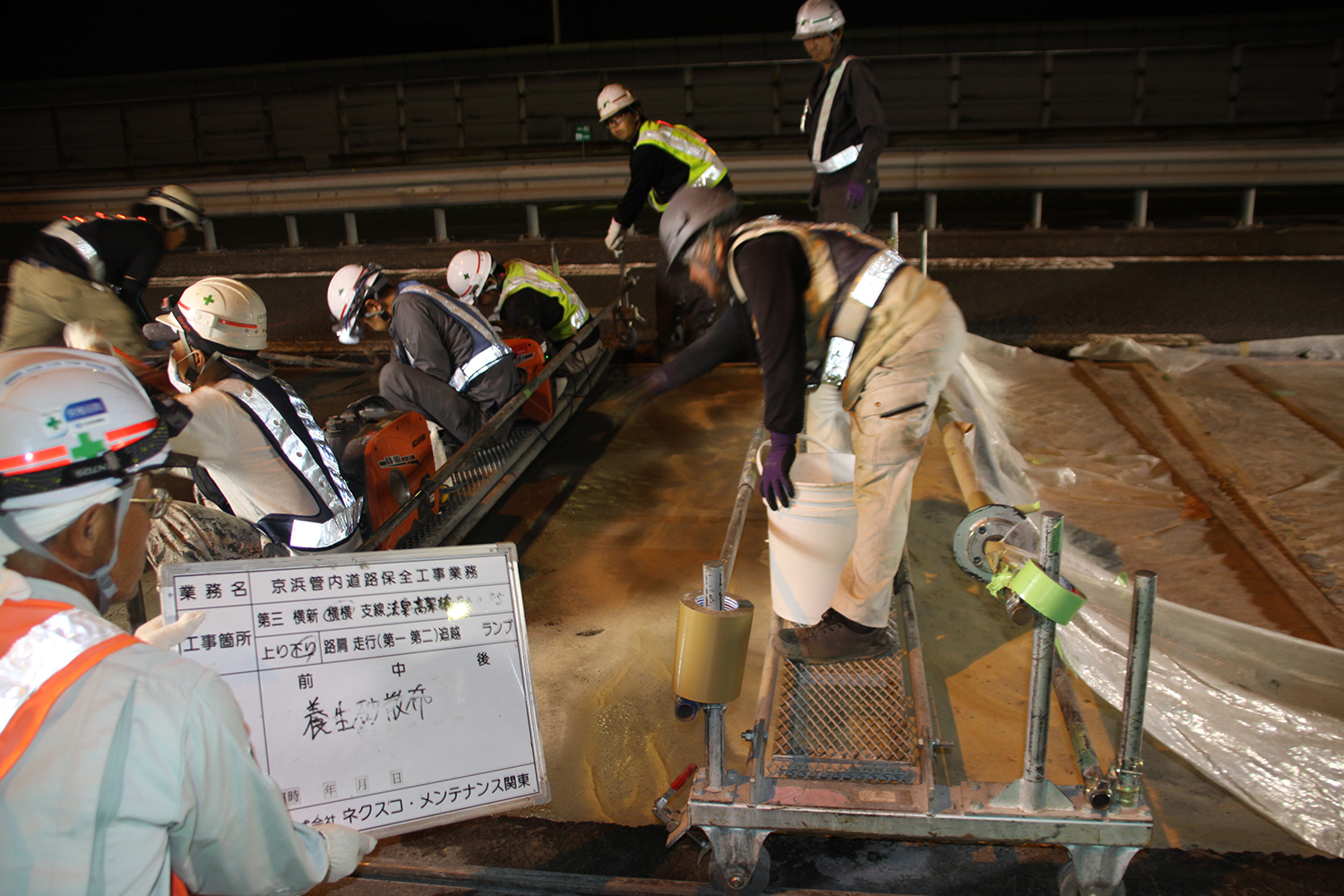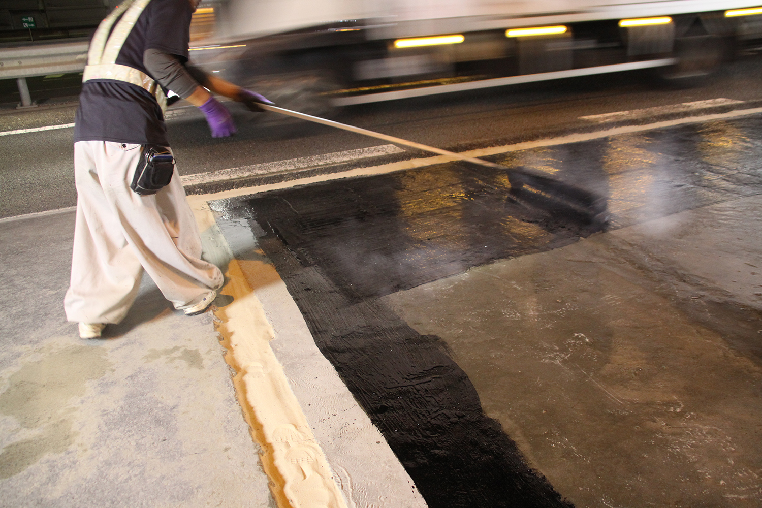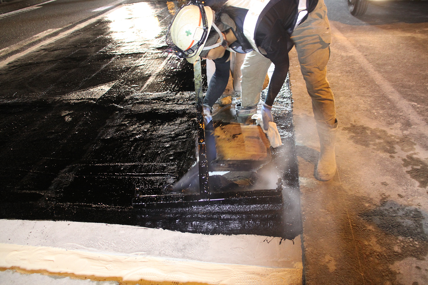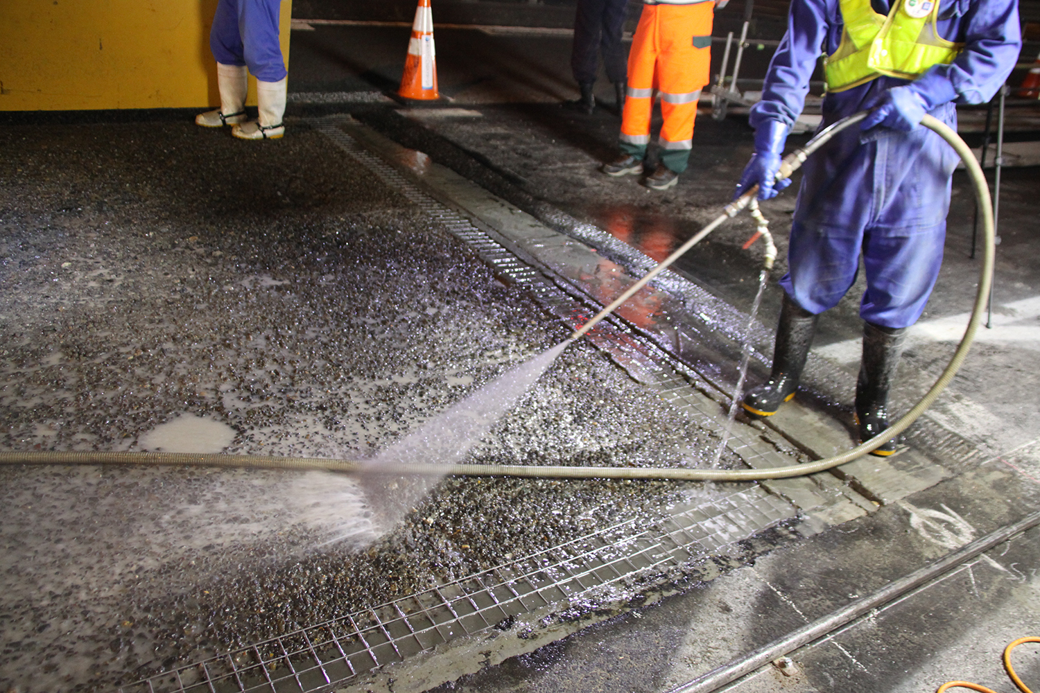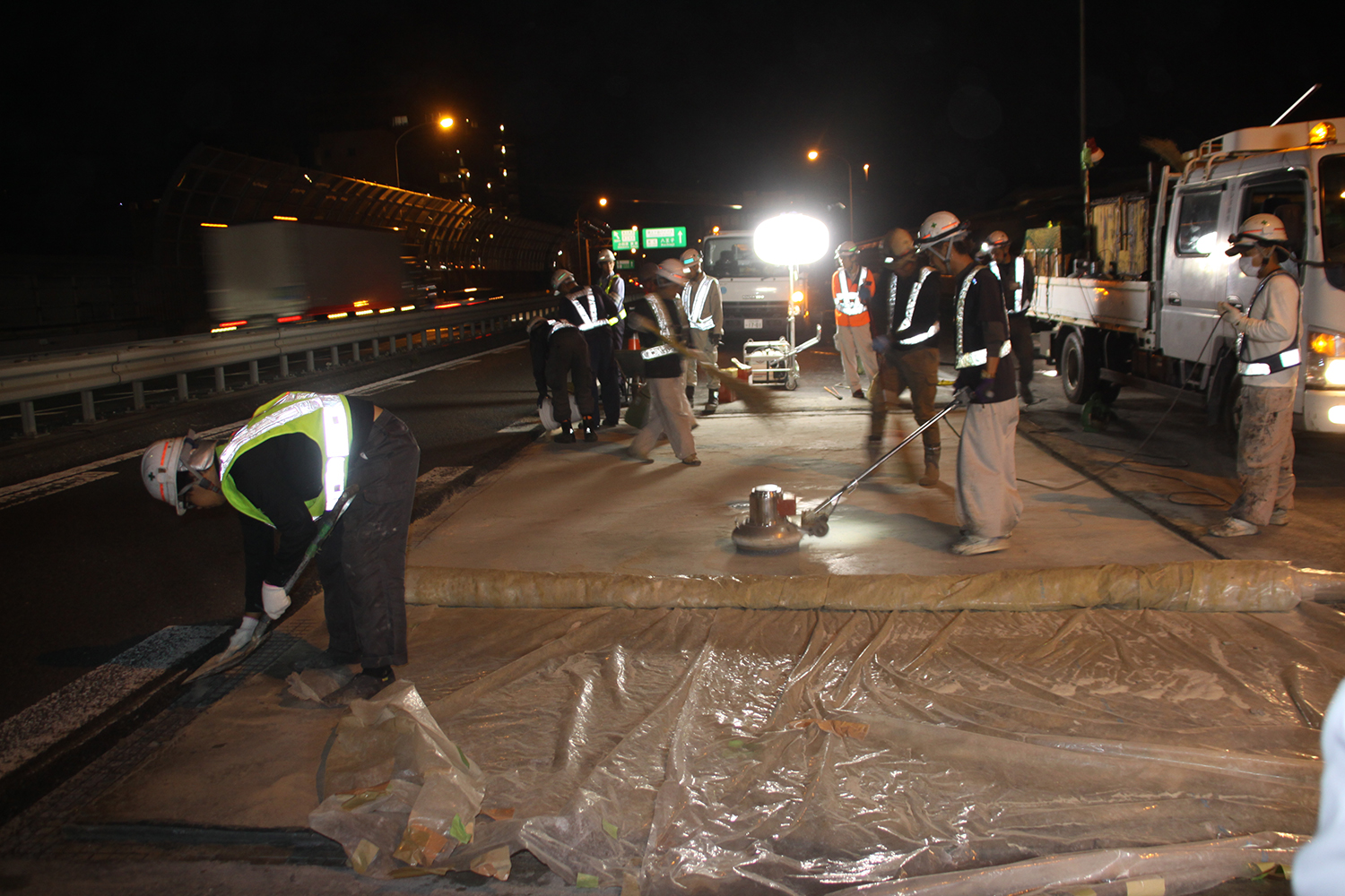 1.5時間ほど養生した後、24Nの初期強度が出ていることを確認した上で、まず養生珪砂をポリッシャーなどで研掃して除去する。次いでプライマー及び舗装との接着用樹脂を塗布しアスファルトフィニッシャー用の珪砂を撒き、舗装して完成させた。なお橋軸直角、橋軸部の外縁部(約300mm幅)にはプライマーおよび接着樹脂を塗布せず、ワイヤーメッシュを配置してその上に珪砂を多めに撒いて舗装を載せる。この部分は「仮舗装と考えており、次の夜以降の施工で舗装が容易に撤去できるようにしている」(㈱サンブリッジ)もの。床版防水に伴う既設床版上面の養生や防水層及びその後の養生が省略できることが、1夜間規制での舗装切削からWJ、床版補修、舗装再設置を完了の実現を可能とした。