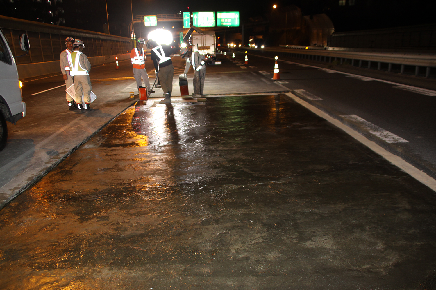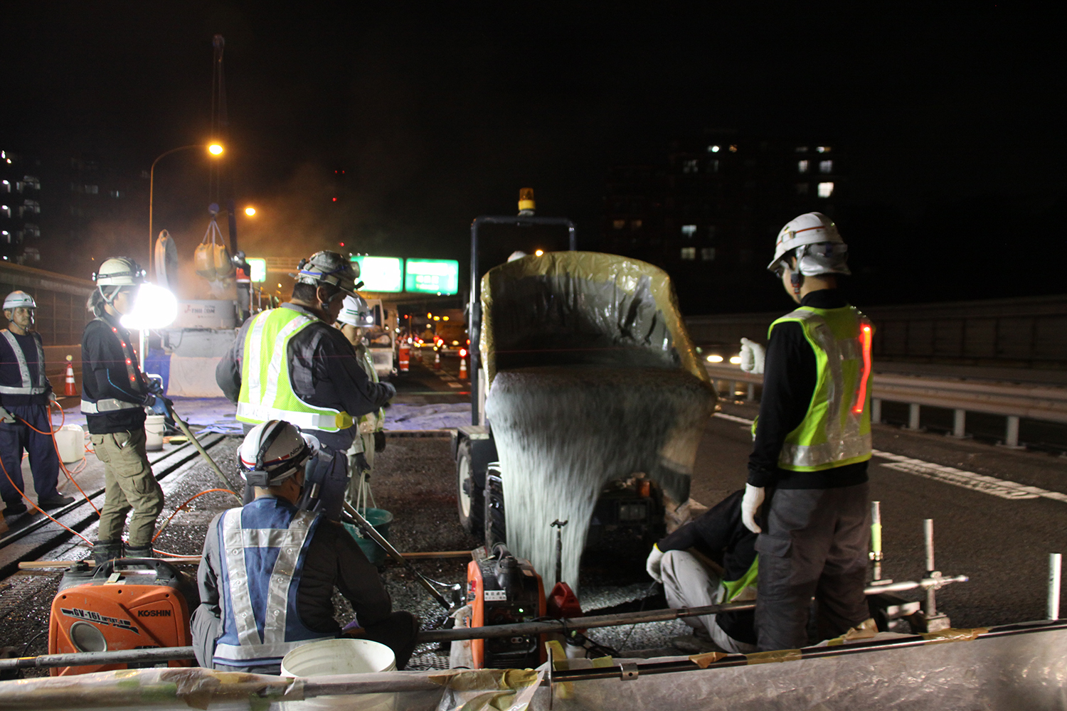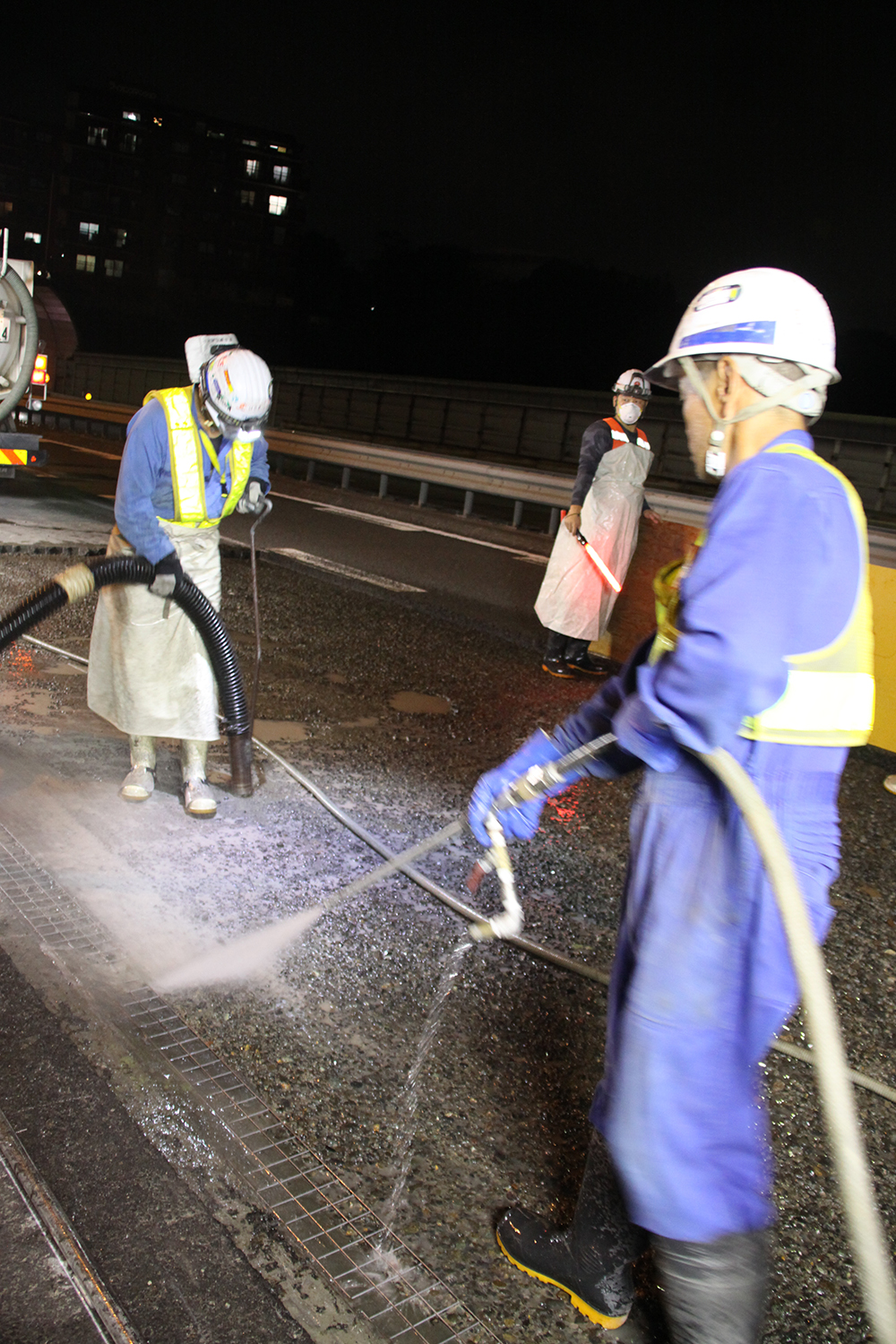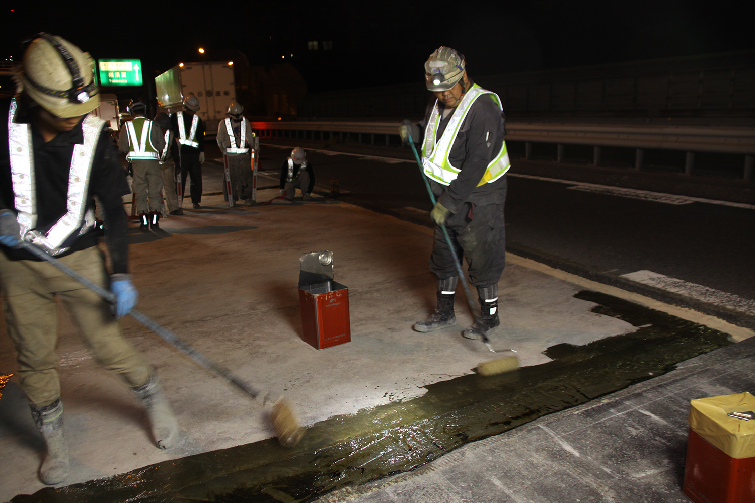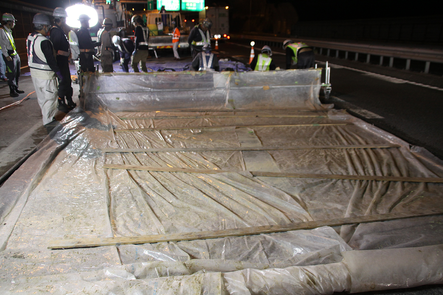 1.5時間ほど養生した後、24Nの初期強度が出ていることを確認した上で、まず養生珪砂をポリッシャーなどで研掃して除去する。次いでプライマー及び舗装との接着用樹脂を塗布しアスファルトフィニッシャー用の珪砂を撒き、舗装して完成させた。なお橋軸直角、橋軸部の外縁部(約300mm幅)にはプライマーおよび接着樹脂を塗布せず、ワイヤーメッシュを配置してその上に珪砂を多めに撒いて舗装を載せる。この部分は「仮舗装と考えており、次の夜以降の施工で舗装が容易に撤去できるようにしている」(㈱サンブリッジ)もの。床版防水に伴う既設床版上面の養生や防水層及びその後の養生が省略できることが、1夜間規制での舗装切削からWJ、床版補修、舗装再設置を完了の実現を可能とした。