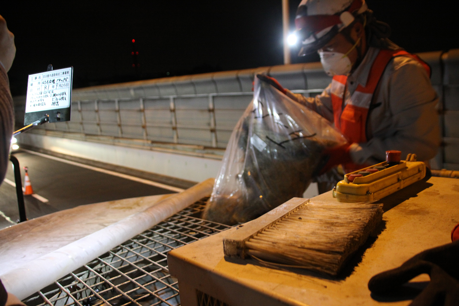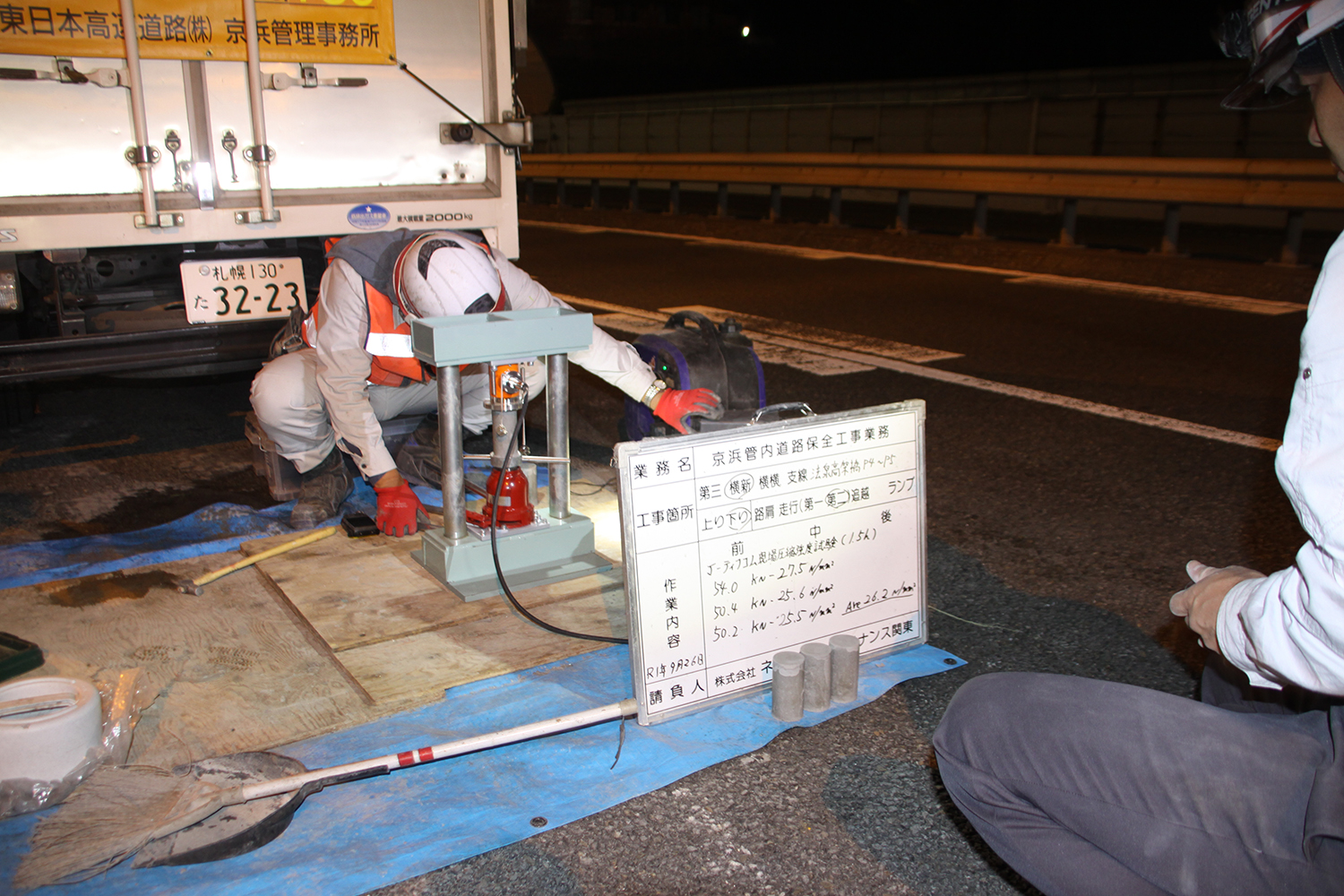 元請は㈱ネクスコ・メンテナンス関東。一次下請は㈱サンブリッジ、二次下請はコンクリートコーリング㈱、日レキ特殊工事㈱など。床版の電磁波レーダーを用いた点検は㈱ネクスコ東日本エンジニアリング、一次下請はジオ・サーチ㈱。(2019年10月21日掲載、井手迫瑞樹)