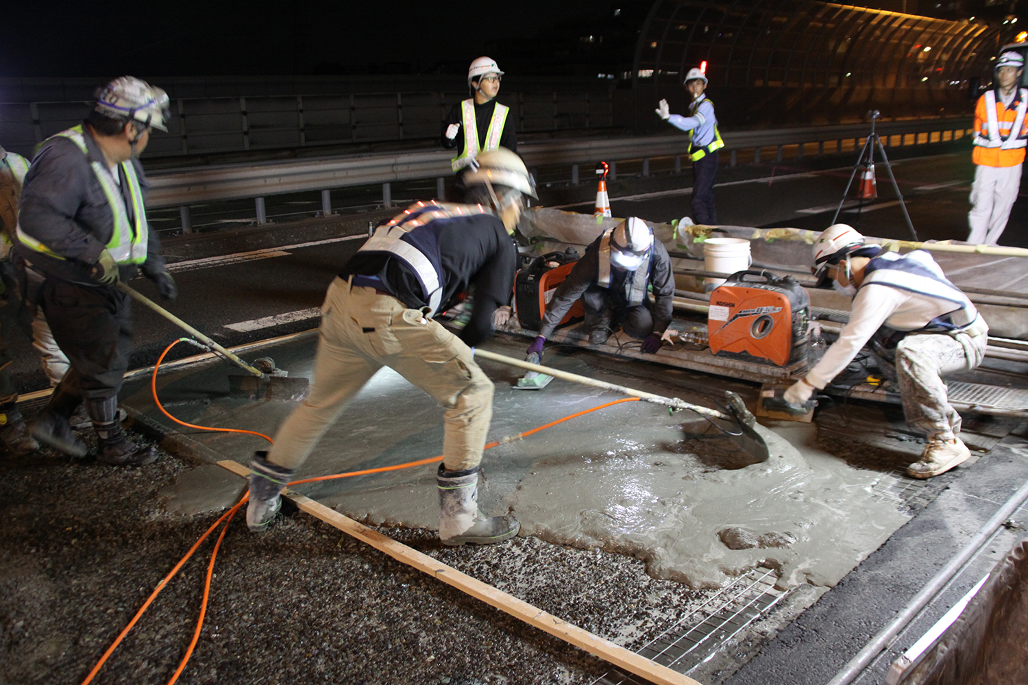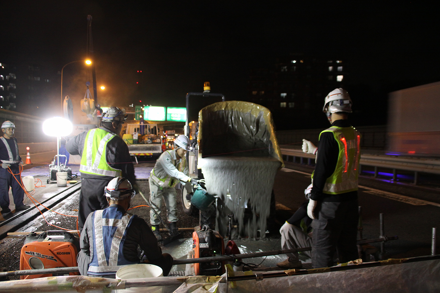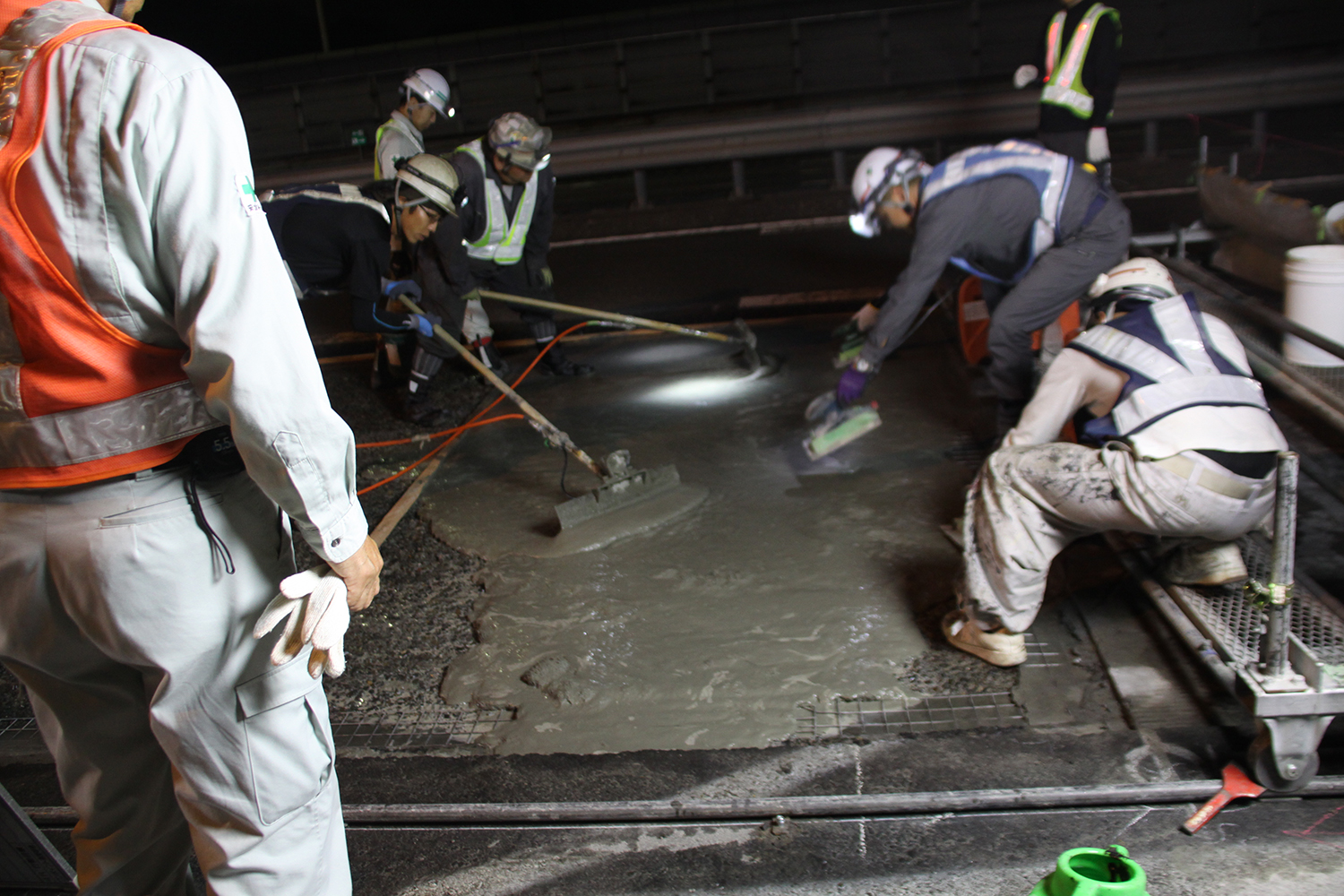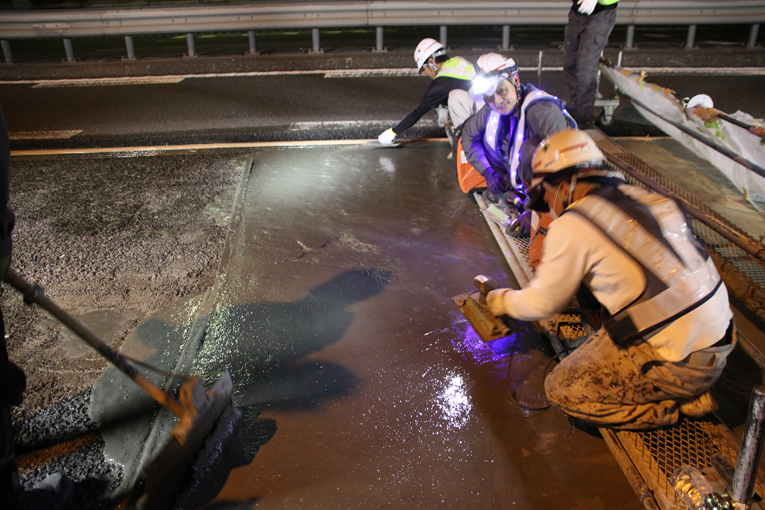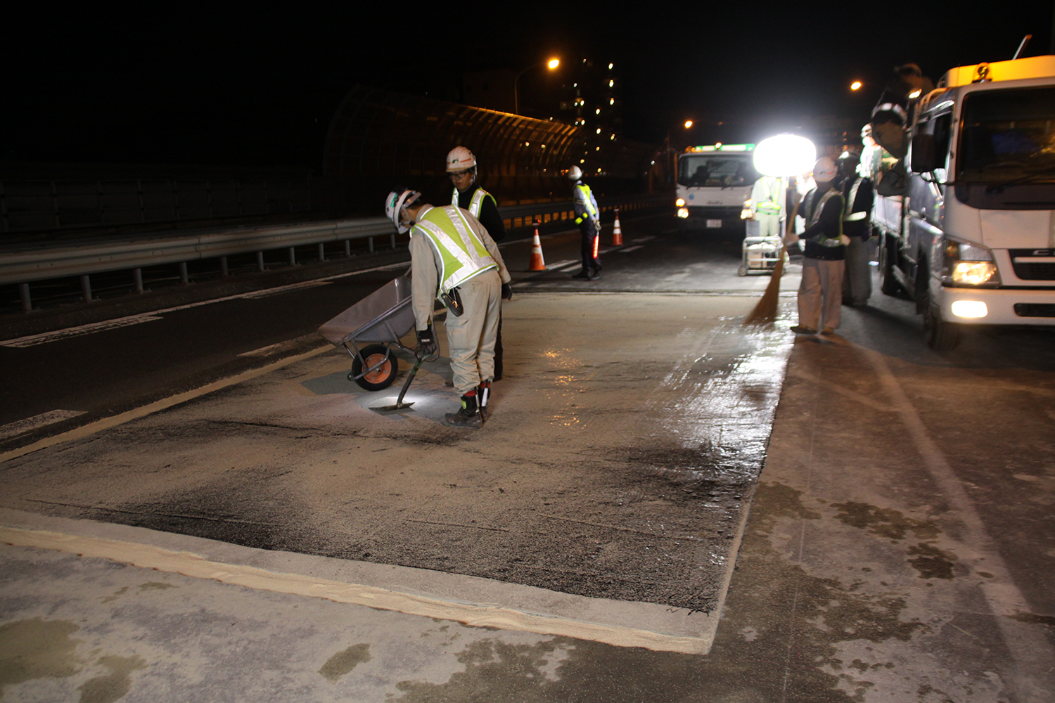 材料は練り混ぜ時に殆ど水を入れないにもかかわらず、ドロッとしたスライム性状を示す。しかし非常に粘りがあることから、敷均しは多少力を要する。打設品質を向上するため、バイブレーションや敷均しは全て外側か作業構台から施工する。作業構台は、施工箇所の橋軸直角を跨ぐように配置され、一方は仮設置されたレール上、もう一方は舗装上にそのまま車輪が配置され、両方を人が押す形で運用されていた。構台上には人が乗って左官仕上げや膜厚管理を行い、さらに施工が完了した個所は、養生用の珪砂を巻いた上に養生水を散布して、備え付けてあるビニール製フィルムを展開して養生する。打継面はワイヤーメッシュを設置しているが、これは混入している鋼繊維の連続性を確保するため、その補強として設置しているもの。