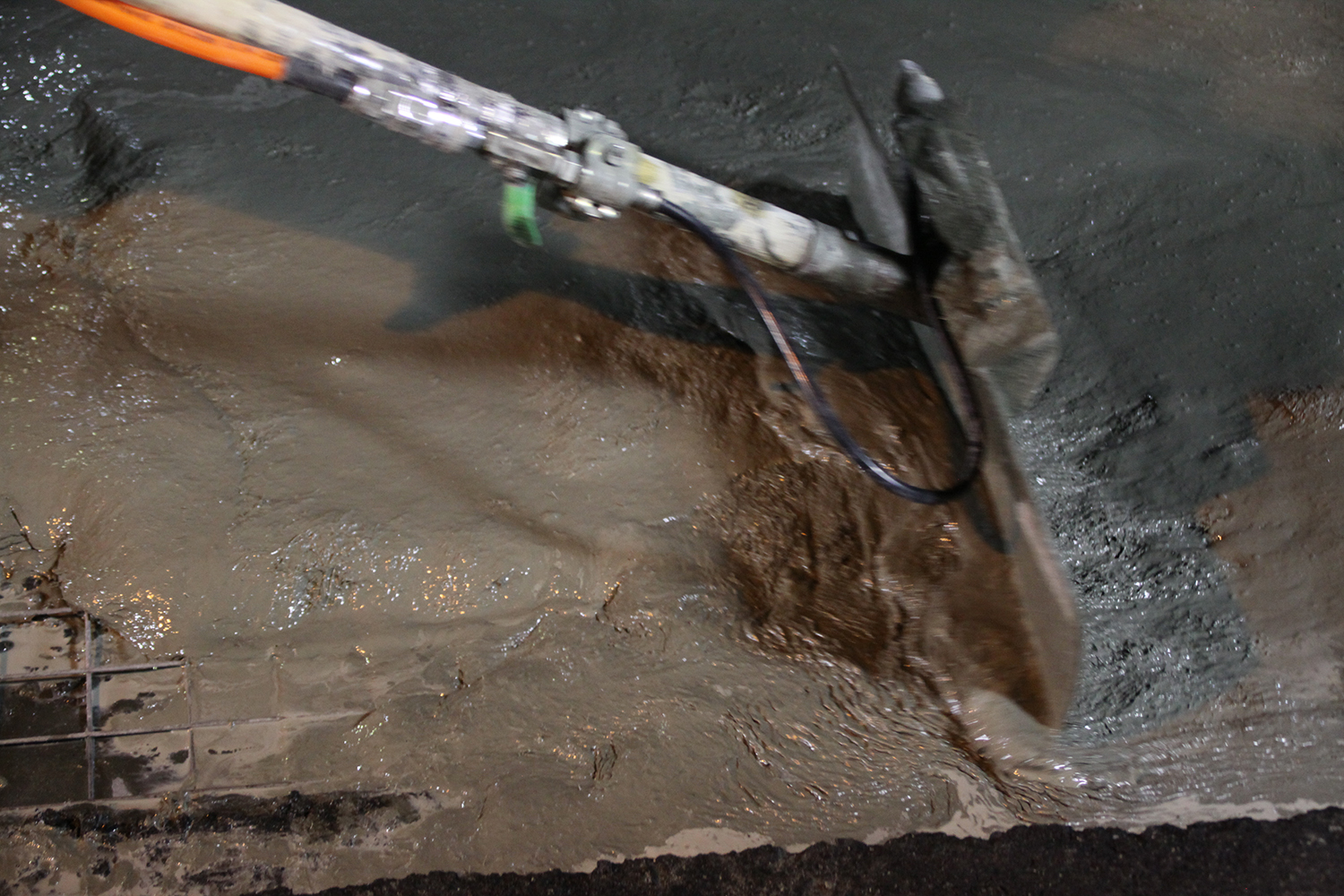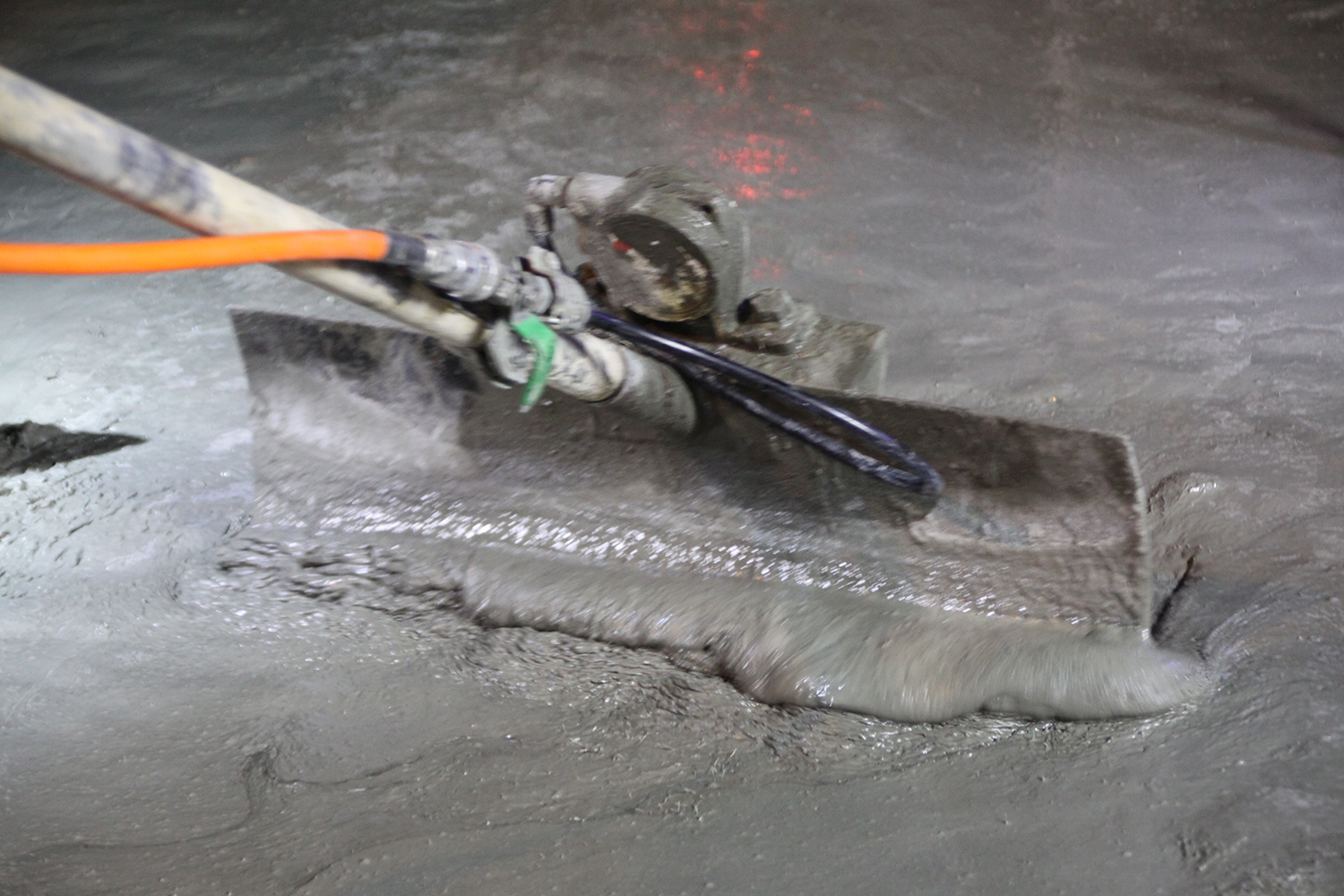 WJ施工後は、多少浮いている箇所を除去し、ガラやノロをバキュームなどで清掃し、さらに洗浄散水を行い、その後にJ-THIFCOMを敷きならしていく。本材料は敷均し前の乾燥養生やプライマーなどの塗布は一切必要としない。また、打設面は水の飽和状態の保持が必要な材料であり、むしろ表面状態は多少の濡れを必要とするため、施工前には散水する必要がある。J-THIFCOMは現場においてセメントや鋼繊維その他を専用の練り混ぜ機に投入して製造する。供給量は1回の練り混ぜで0.25m3で最小膜厚20mmの今現場においては12.5m2に相当する。これを1夜間4~5セット製造する。セット数が多少増減するのは、床版の損傷状況に左右されるため。従来の床版補修のように別途断面修復を行い、不陸を無くした上で打設するのではなく、同材料で不陸ごと埋めていく。