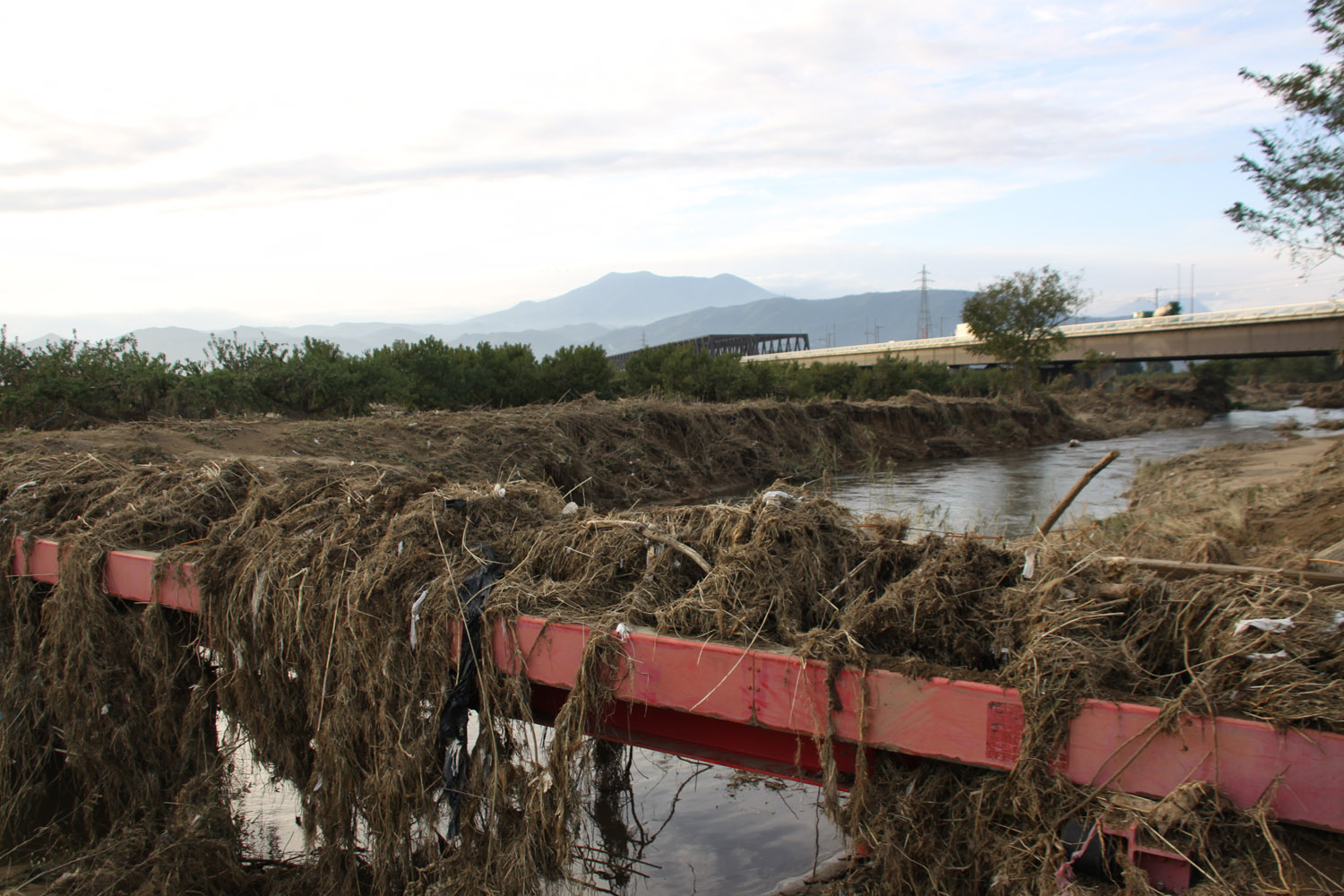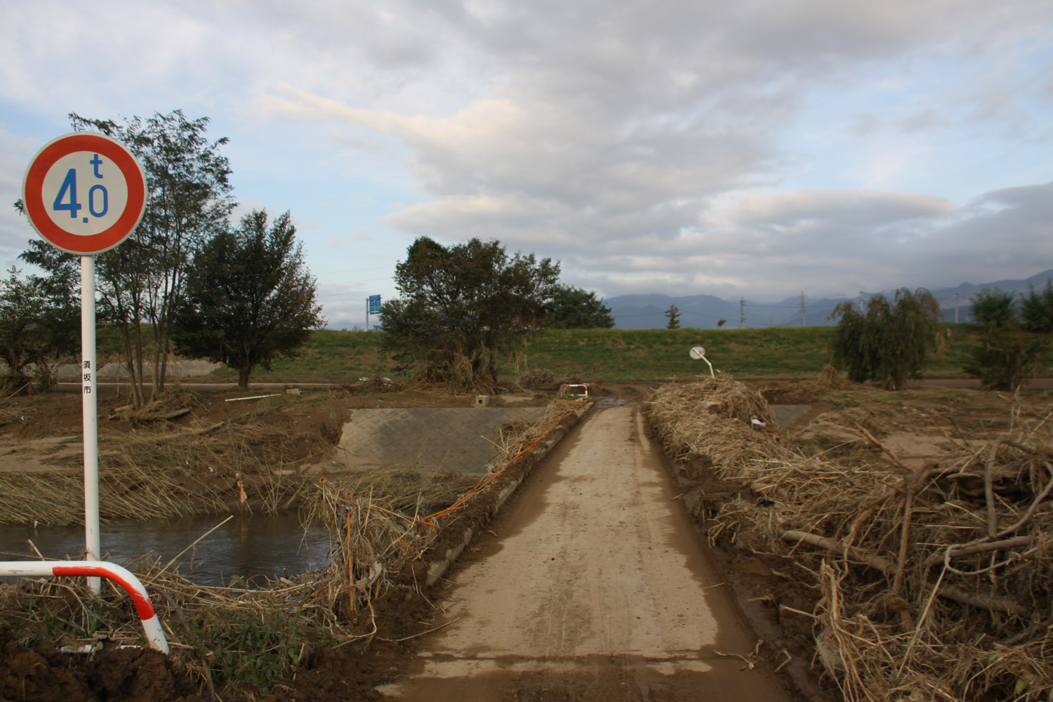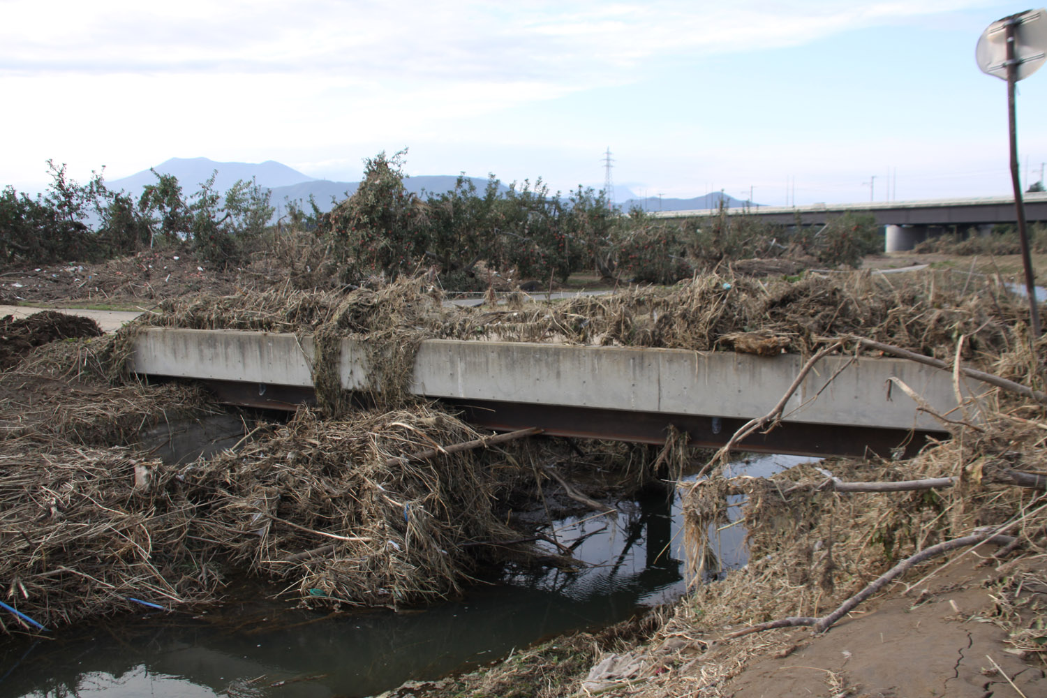 上田市から上田菅平ICで上信越道に乗り、須坂長野東ICで降りて千曲川右岸を進み、支流の新百々川橋を渡り、千曲川の村山橋付近で車を停める。そのあたりでは河川敷がりんご畑となっていたが、木の半分以上が土砂に埋まっていた。また農地を結ぶ小規模橋は、桁が無事であったものの、高欄は吹き飛んでいた。