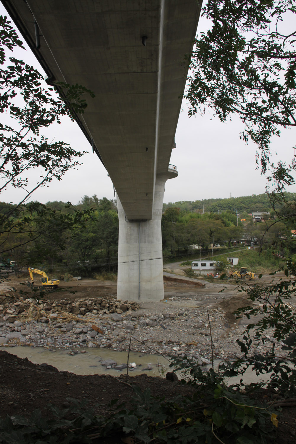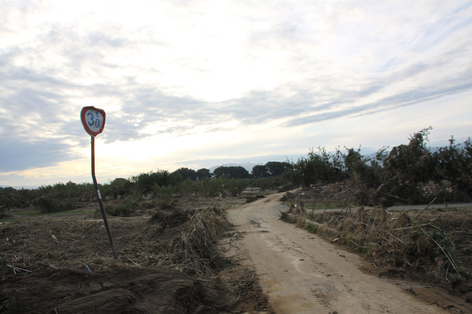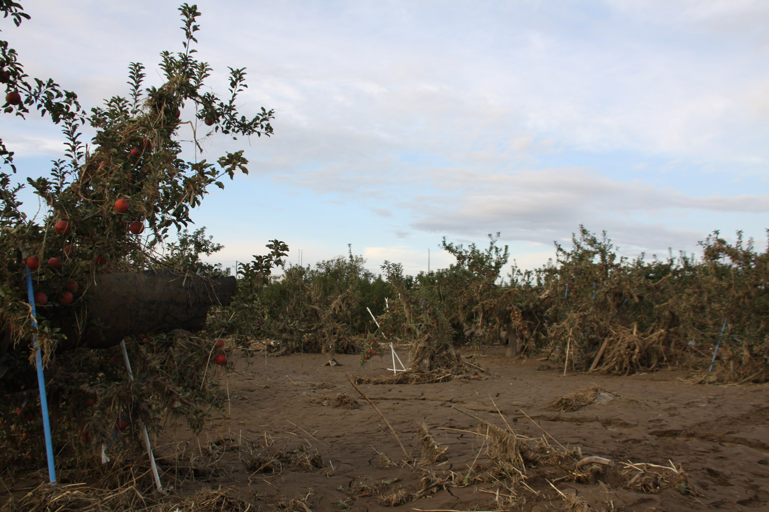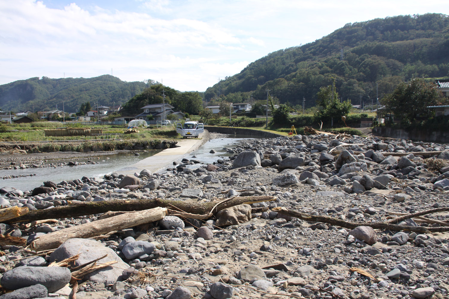 上田市から上田菅平ICで上信越道に乗り、須坂長野東ICで降りて千曲川右岸を進み、支流の新百々川橋を渡り、千曲川の村山橋付近で車を停める。そのあたりでは河川敷がりんご畑となっていたが、木の半分以上が土砂に埋まっていた。また農地を結ぶ小規模橋は、桁が無事であったものの、高欄は吹き飛んでいた。