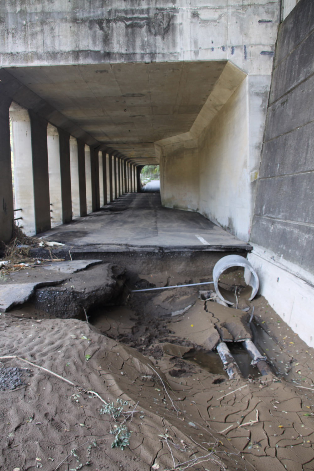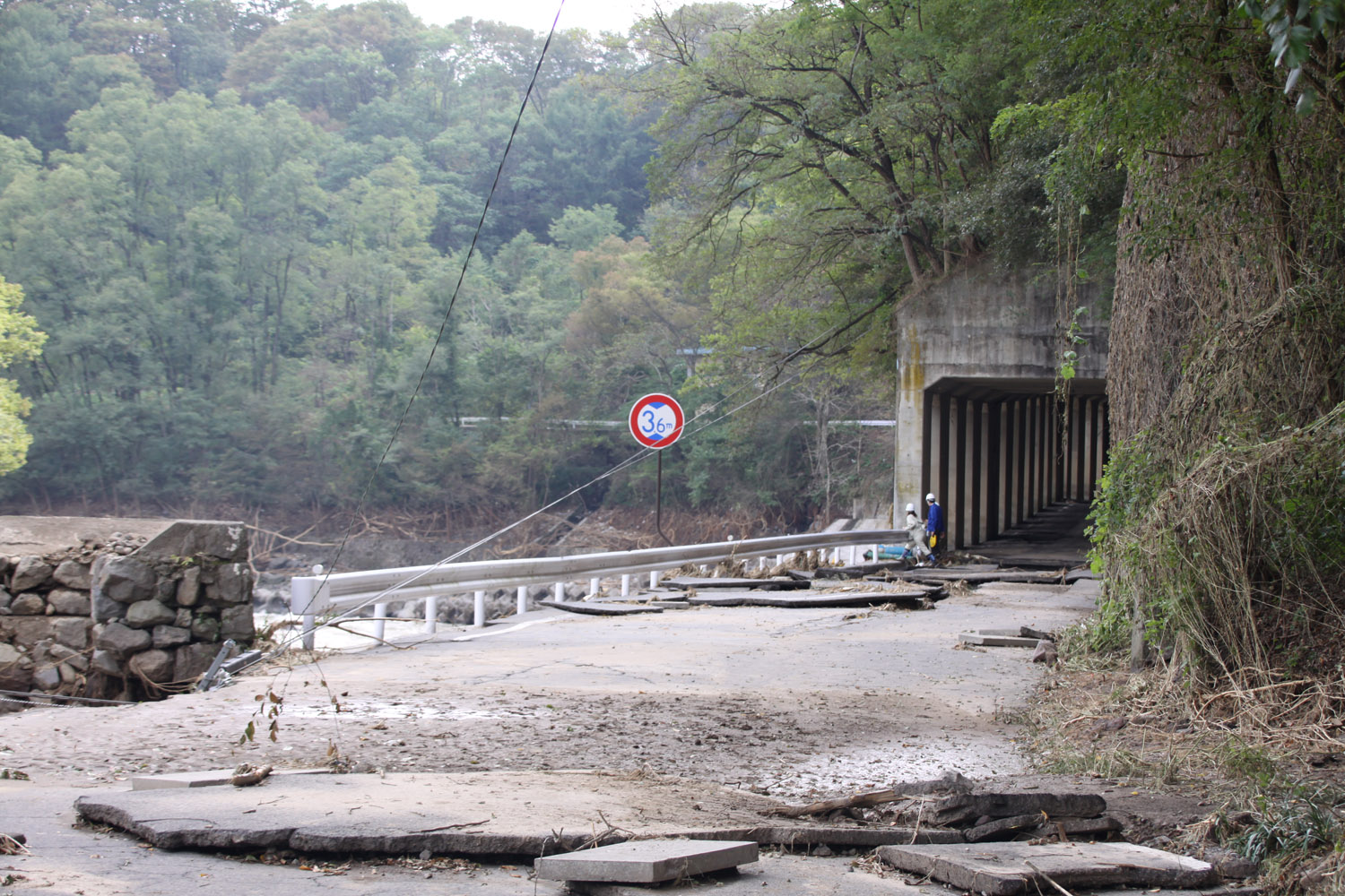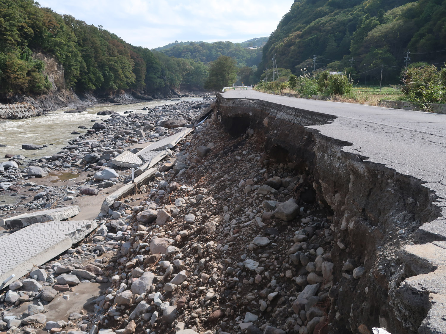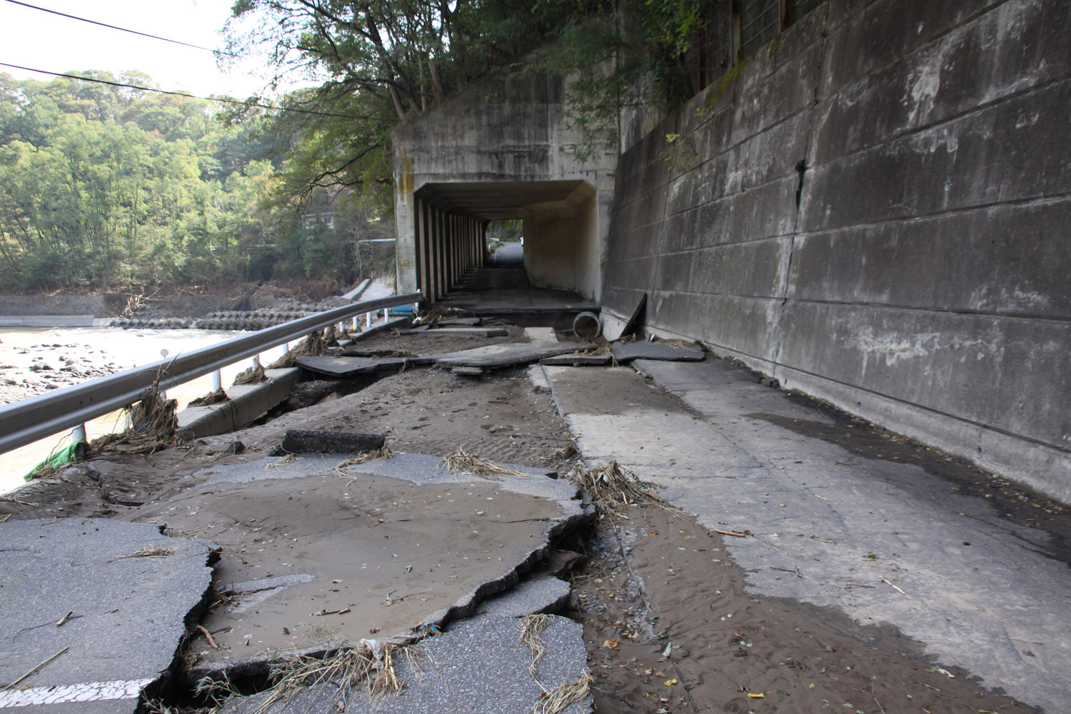 左岸の県道40号に入るが、布引大橋付近で通行止めとなっていた。ロックシェッド内とその出口付近約30mでは千曲川の越水または、堤防の損壊による吸出しによるものか、舗装が浮き上がり、大小のブロックとなって散乱しており、地面が露出していた。シェッドから約100m付近では土砂崩れが発生していて、県道をふさいでいた。泥の堆積は厚く、油断した記者はひざ下付近まで靴がはまり抜け出るのに苦労した。同所には小諸市の水道局の女性技術者が来ていたが、被害の大きさに対して、途方に暮れていた。さらに、その先約150mでは1車線が完全に崩落した状態となっていた。