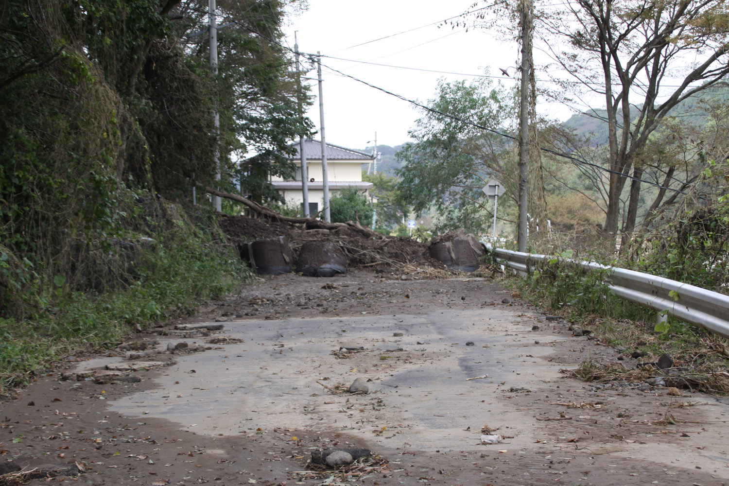 土砂崩れ/堤防が広範囲に崩れ、えぐられて1車線分が崩壊していた
