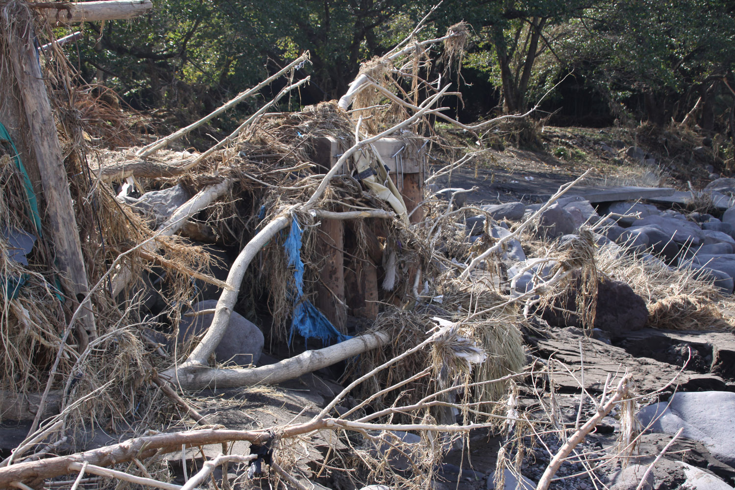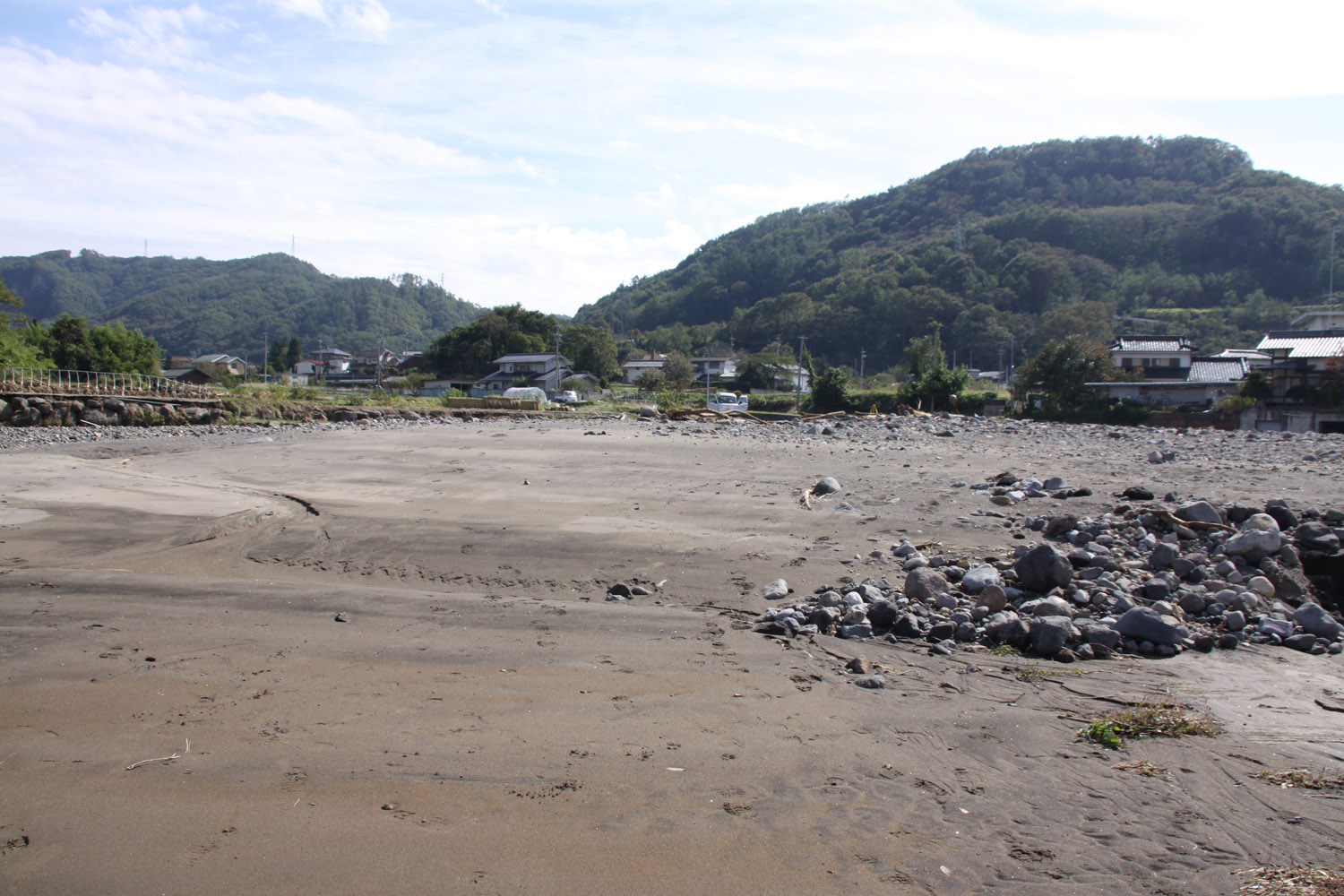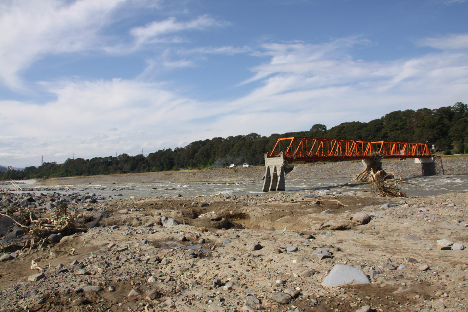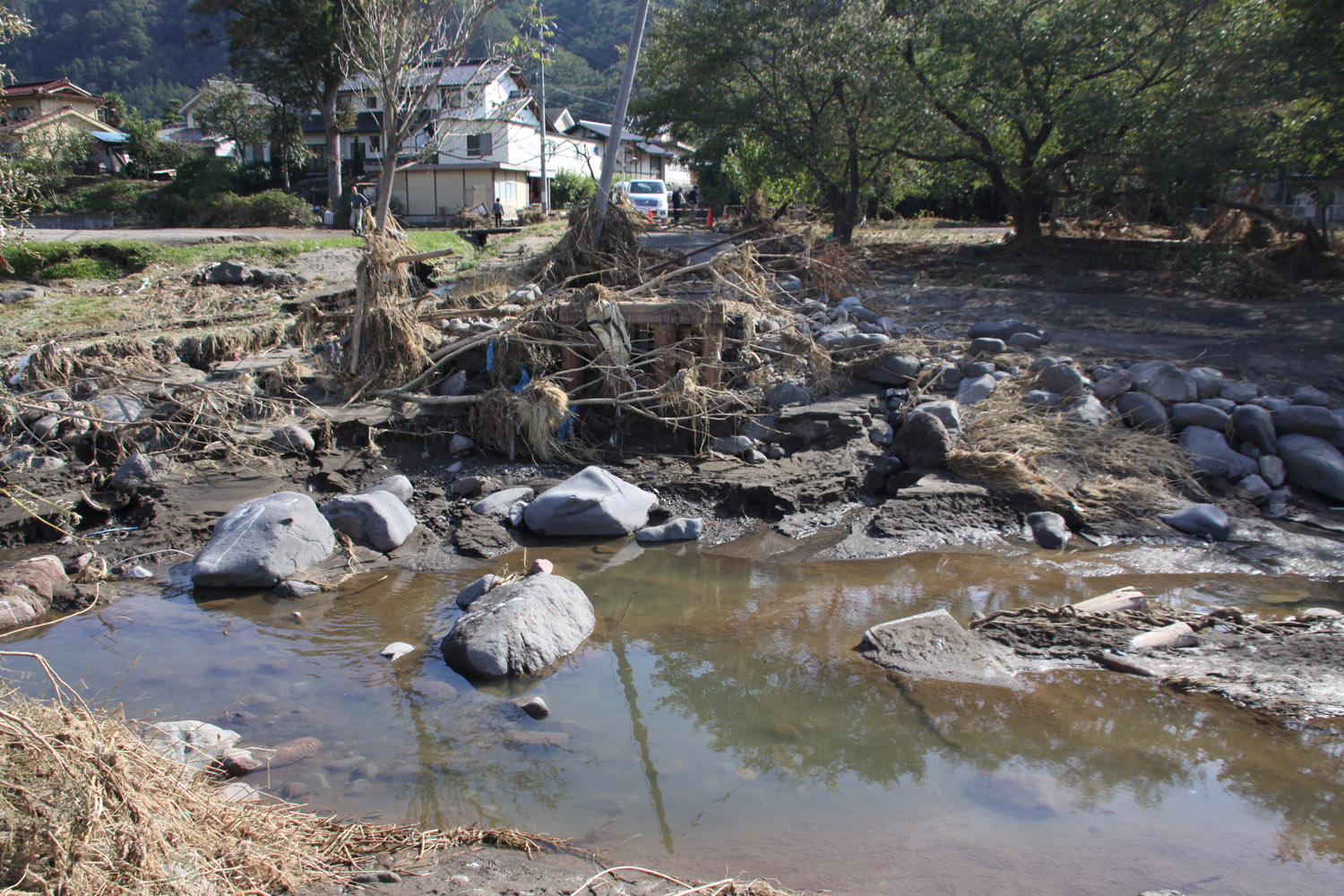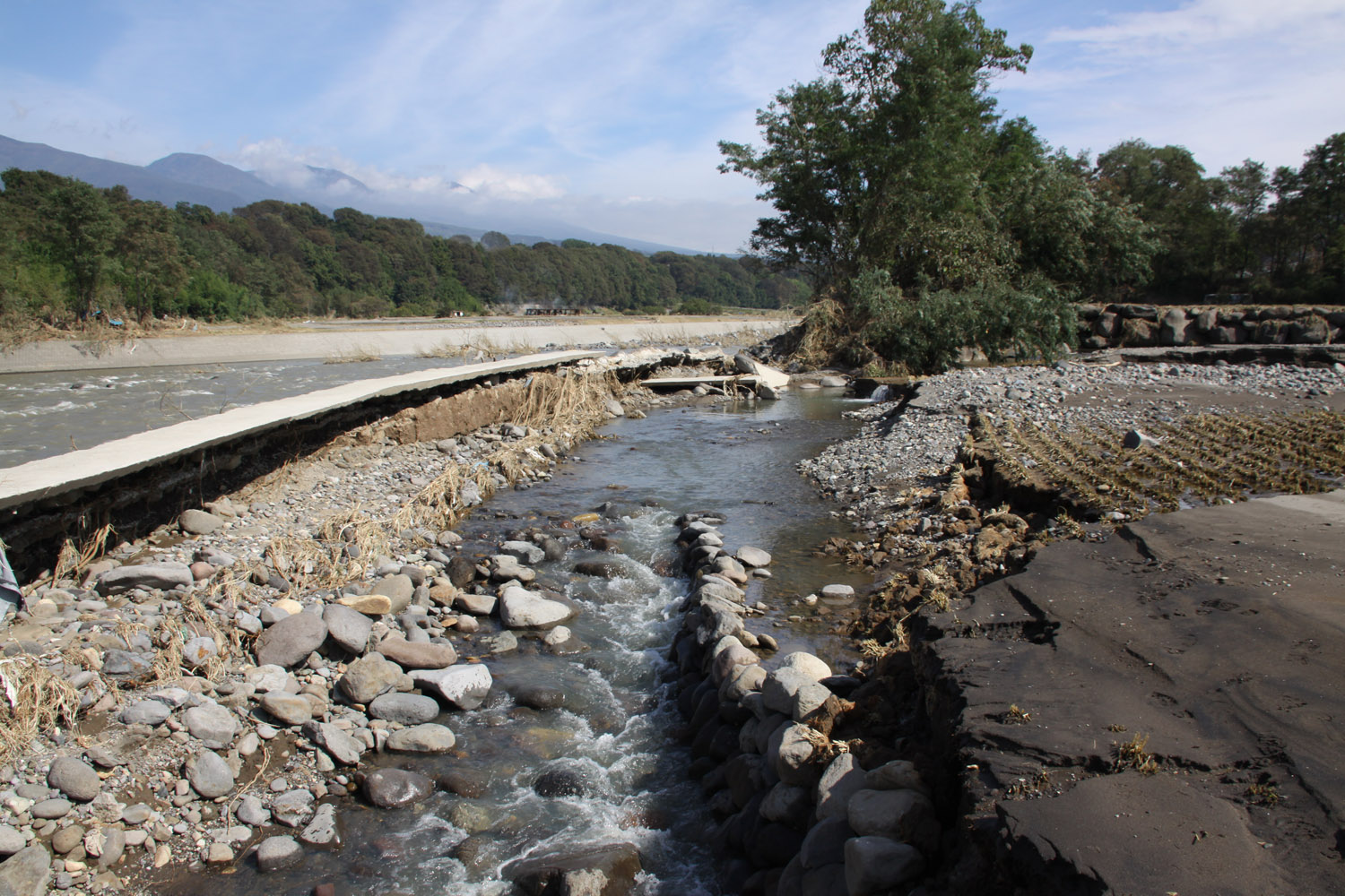 境橋は無事であったものの、その上流左岸は、支流の出口を埋めるように岩や土砂が堆積していた