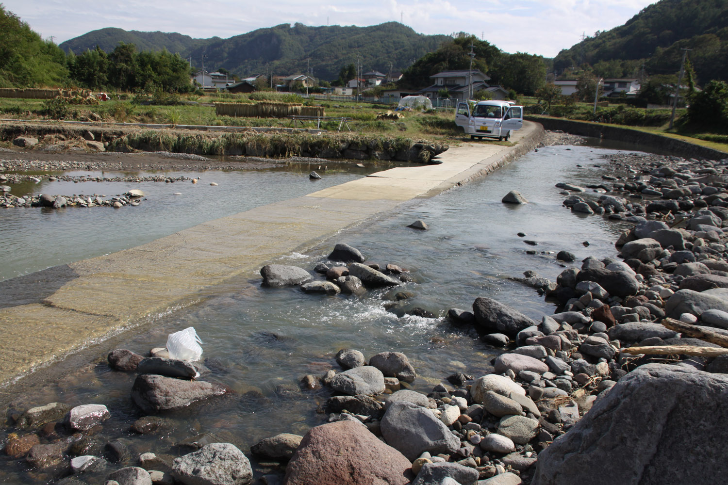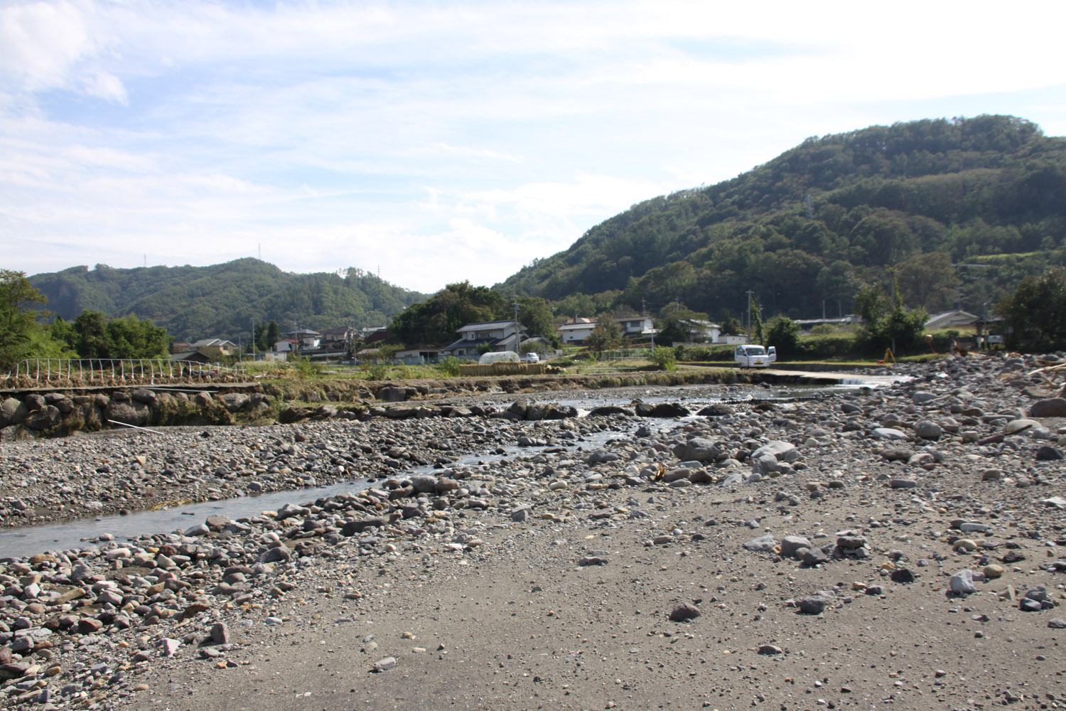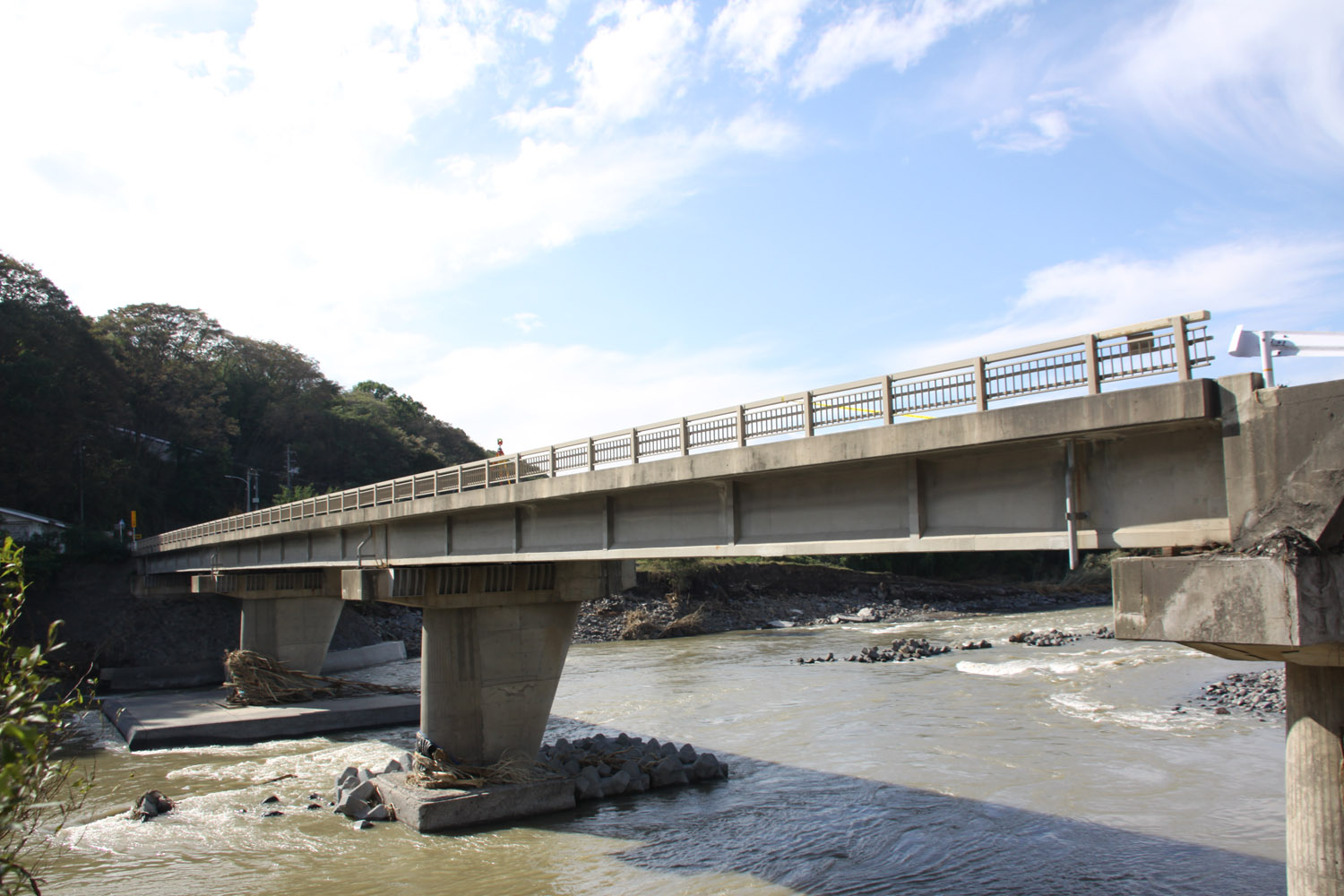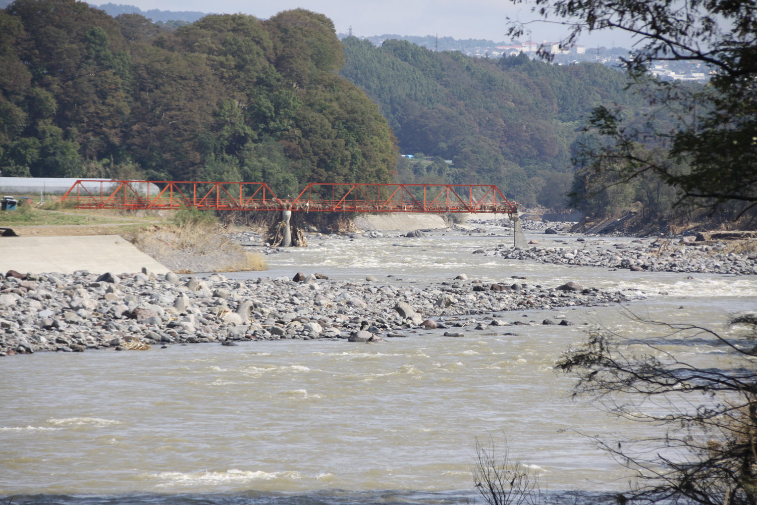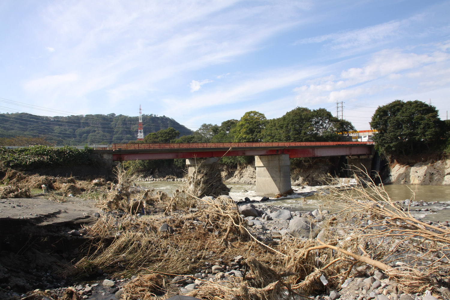 境橋は無事であったものの、その上流左岸は、支流の出口を埋めるように岩や土砂が堆積していた