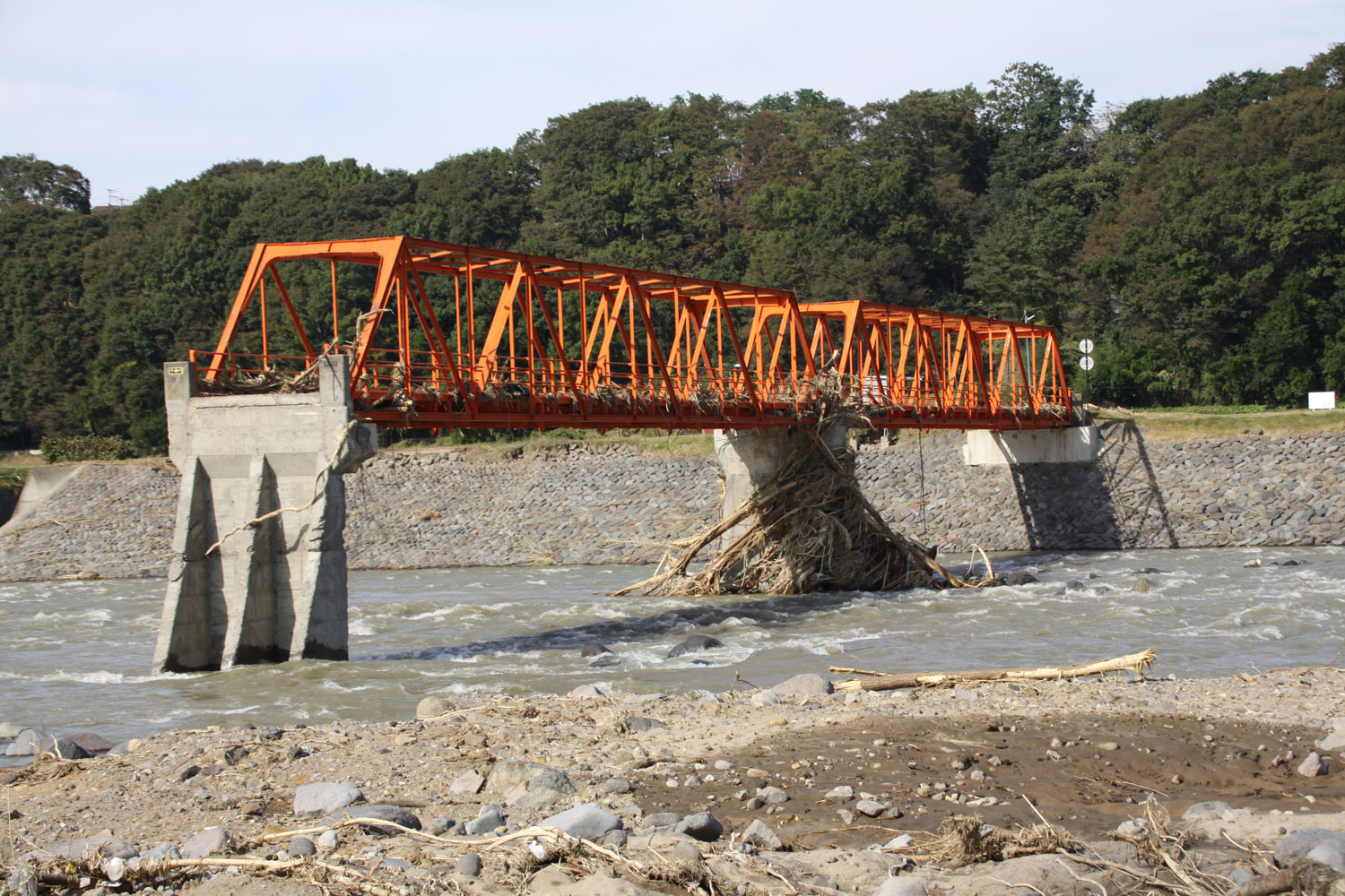 上田電鉄別所線の千曲川橋梁 橋台を失い左岸側の1径間が落ちている