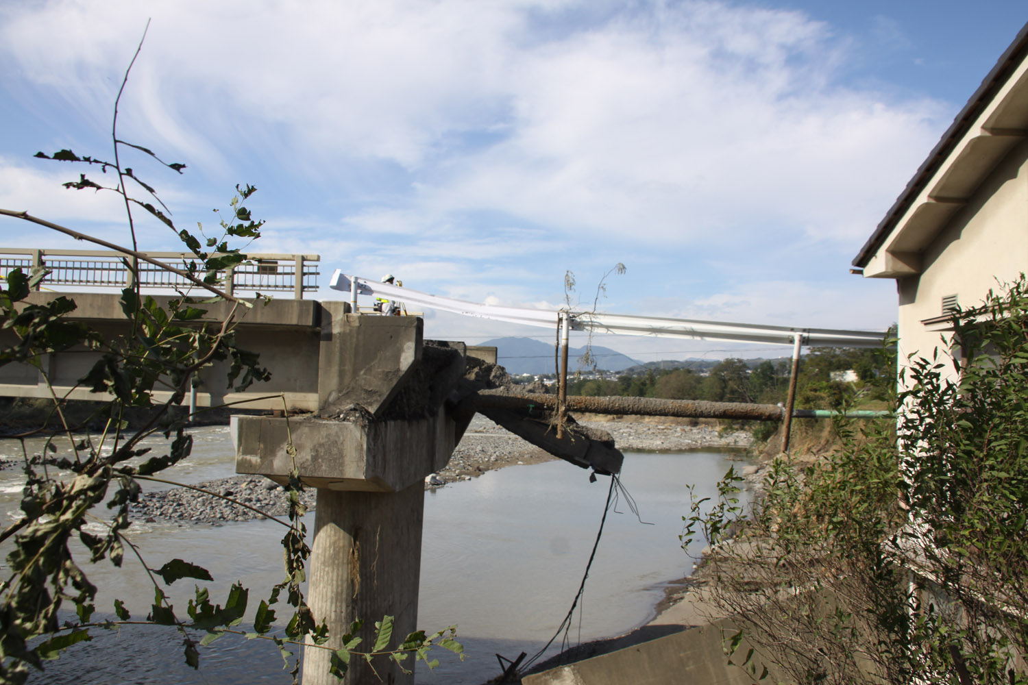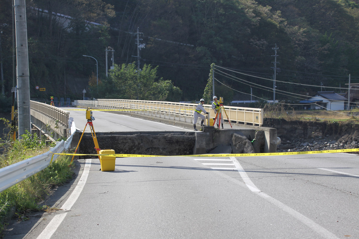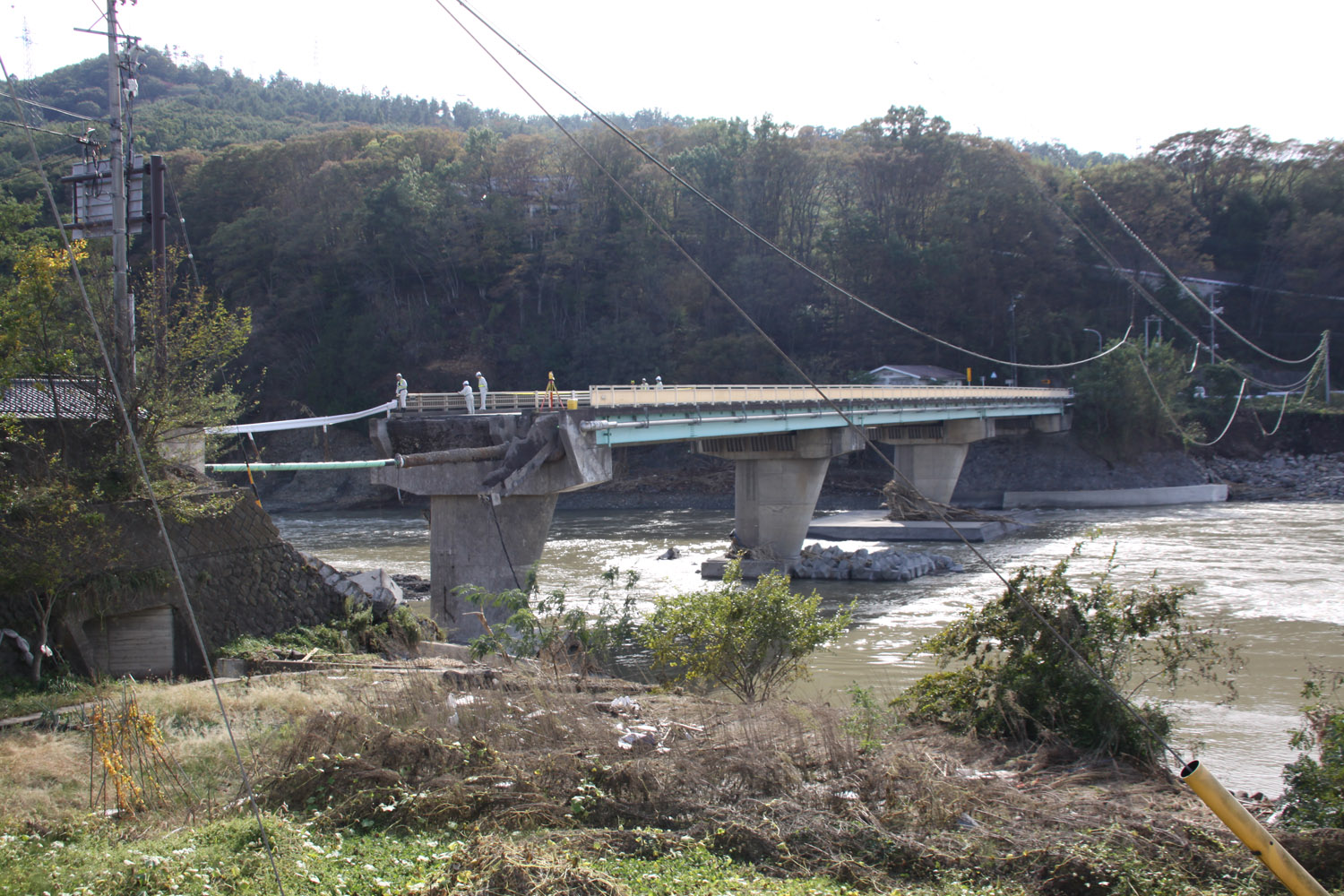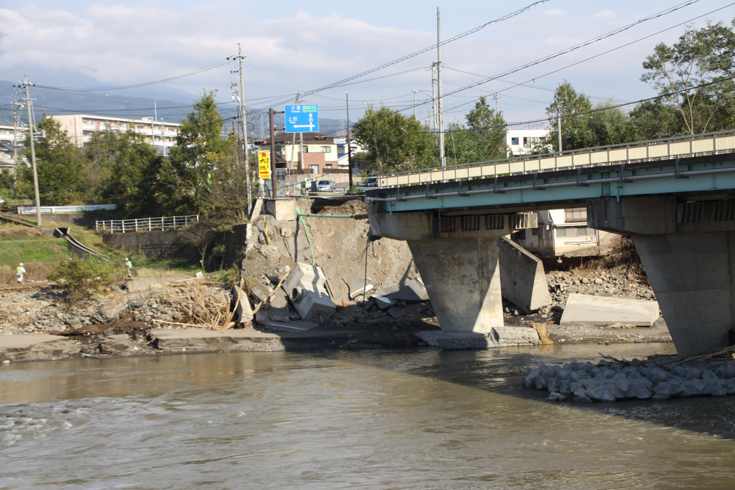 次に、県道81号の田中橋に移動した。田中橋は車道部のPC橋と歩道部の鈑桁橋からなる橋梁で左岸と東御市役所、しなの鉄道田中駅を繋ぐ重要な橋梁だ。しかし右岸の橋台盛土が洗掘により広範囲(10ⅿほど)に流出していた。手前の家は助かっている。どういう流れ方をしたのだろうか。よく見るとPC桁は少し沓座からずれているように見えた。大変な力が働いたことが分かる。現場には損傷状況を調査するための測量にコンサルタントが派遣されていた。