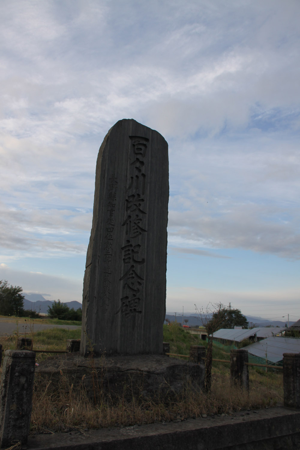 百々川河川敷のりんご畑は大きな被害を受けていた/河川改修碑