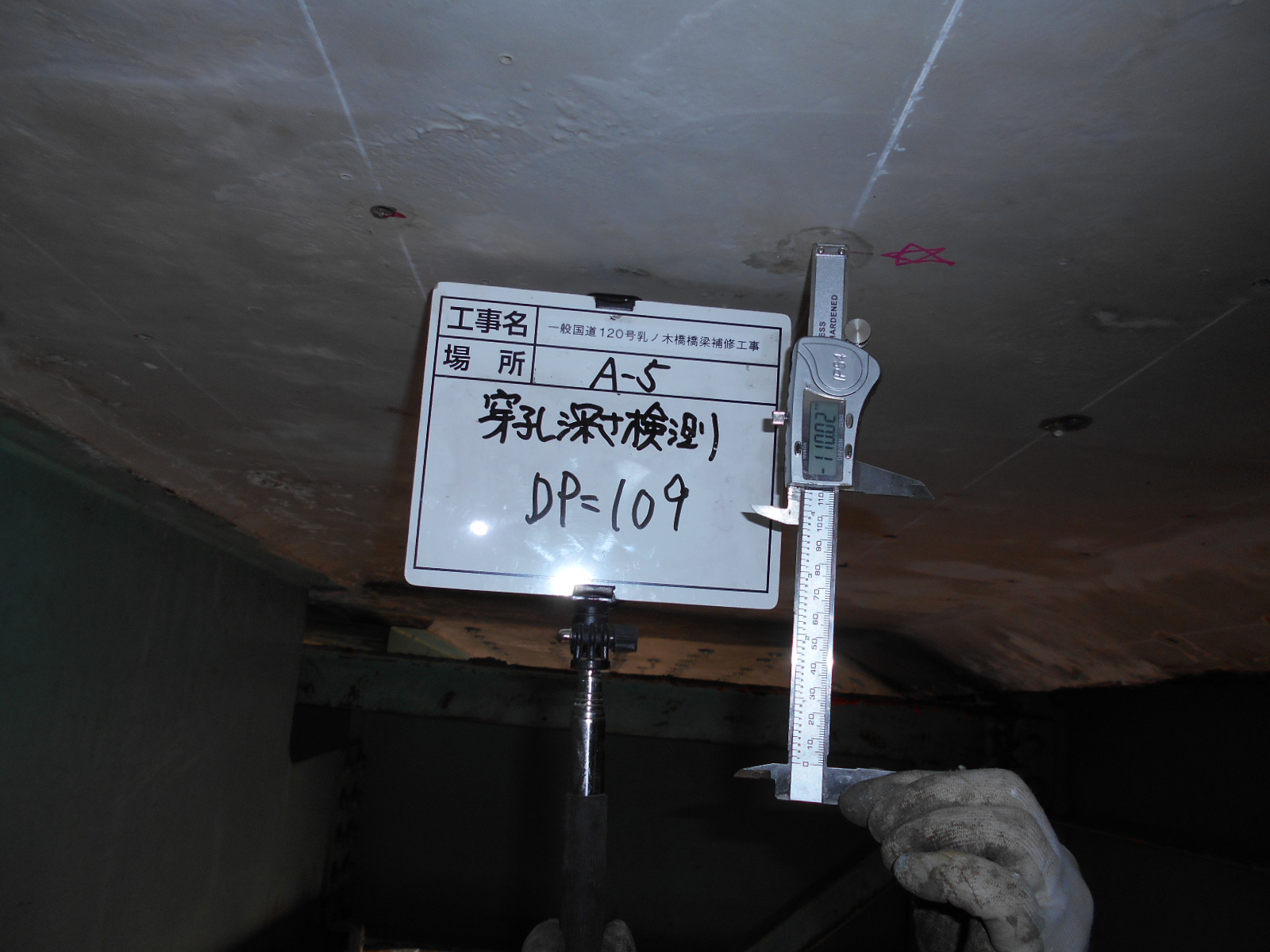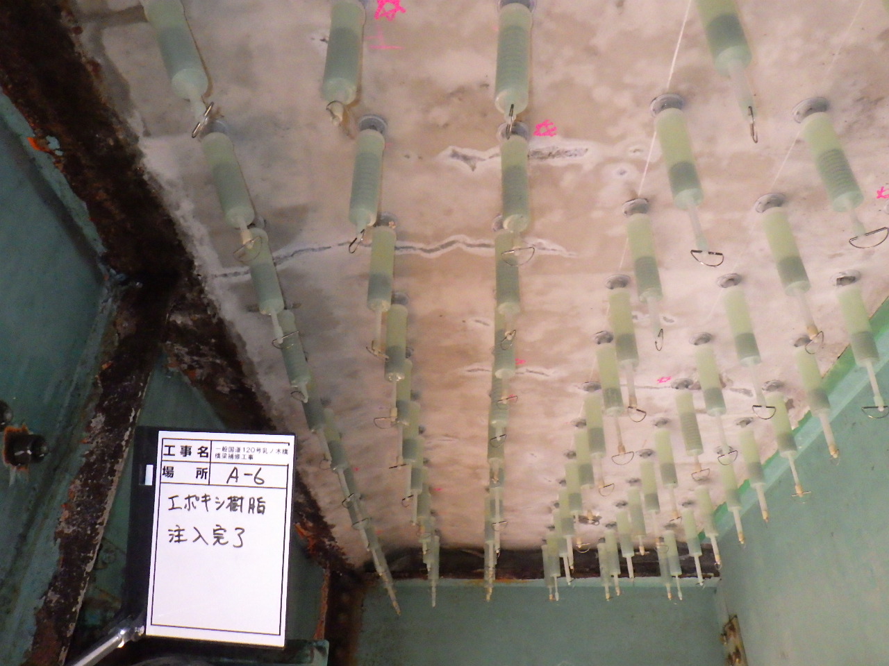 RC床版の0.2mm以上のひび割れは460mに達していたが、コンクリート内部に存在する空気と注入樹脂を置換し、穿孔した穴の内部から放射状に拡散する事により、末端の微細クラックまで充填する事ができるIPH工法による樹脂注入補修した。