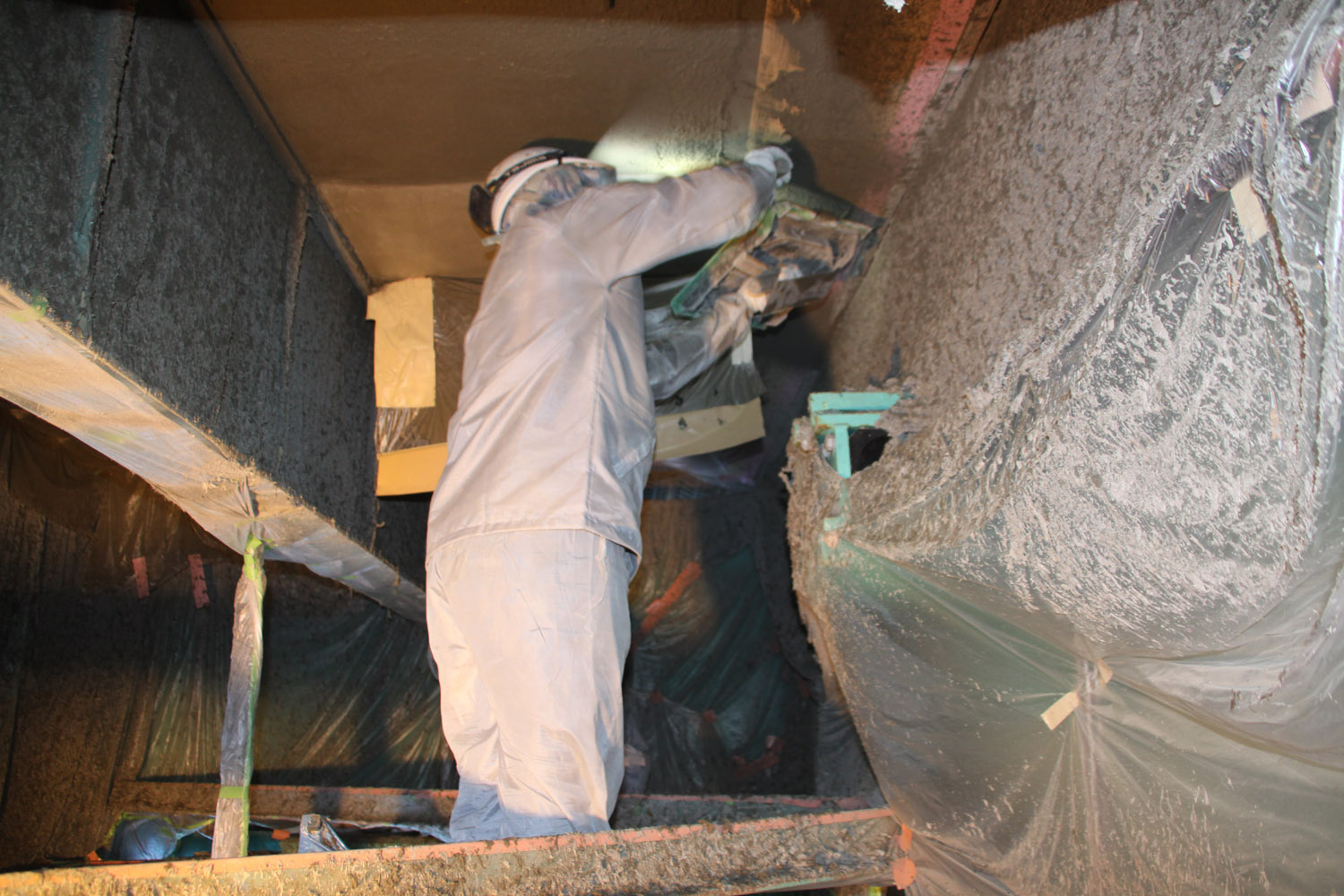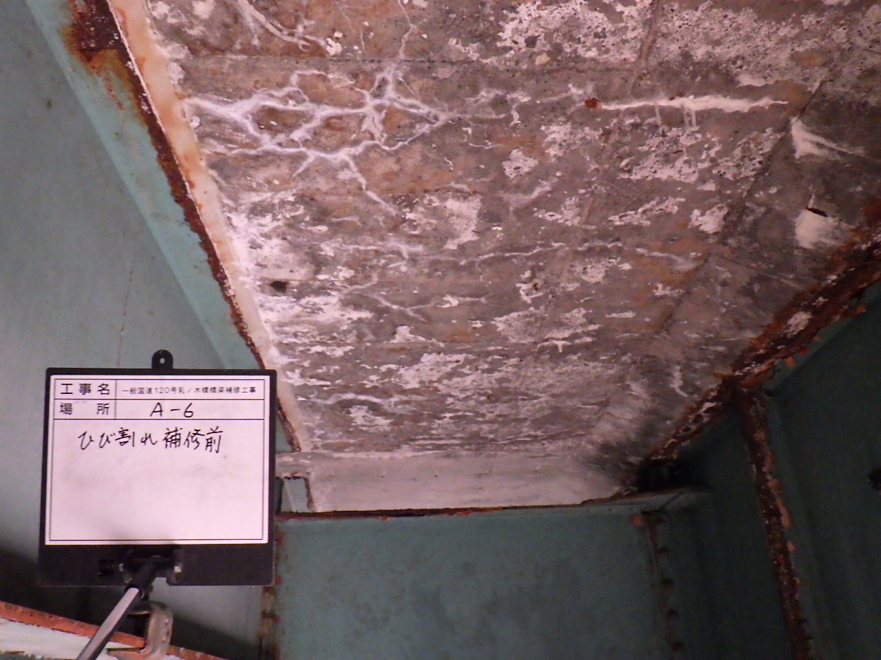 そこで、下面増厚補強を実施するために、先ず、橋面の既設アスファルト舗装のひび割れに止水処理を施し、さらにその上面には防水として仮舗装を行ったうえで、床版の補修に入った。