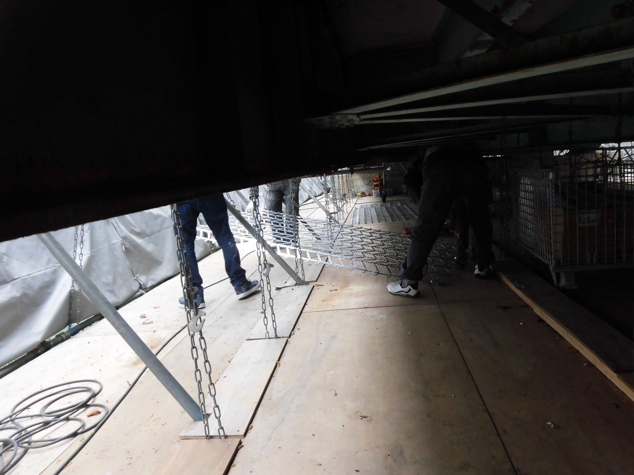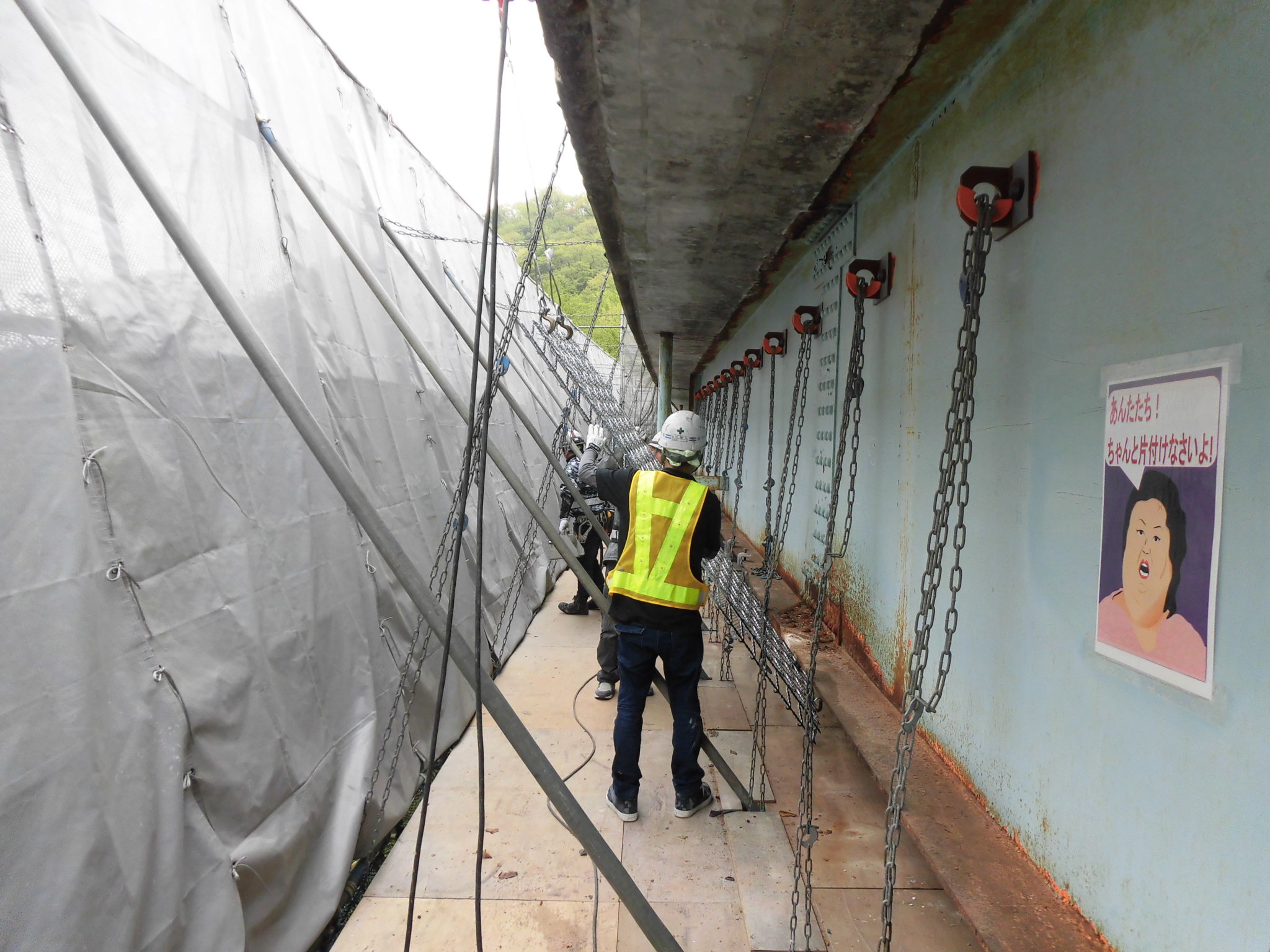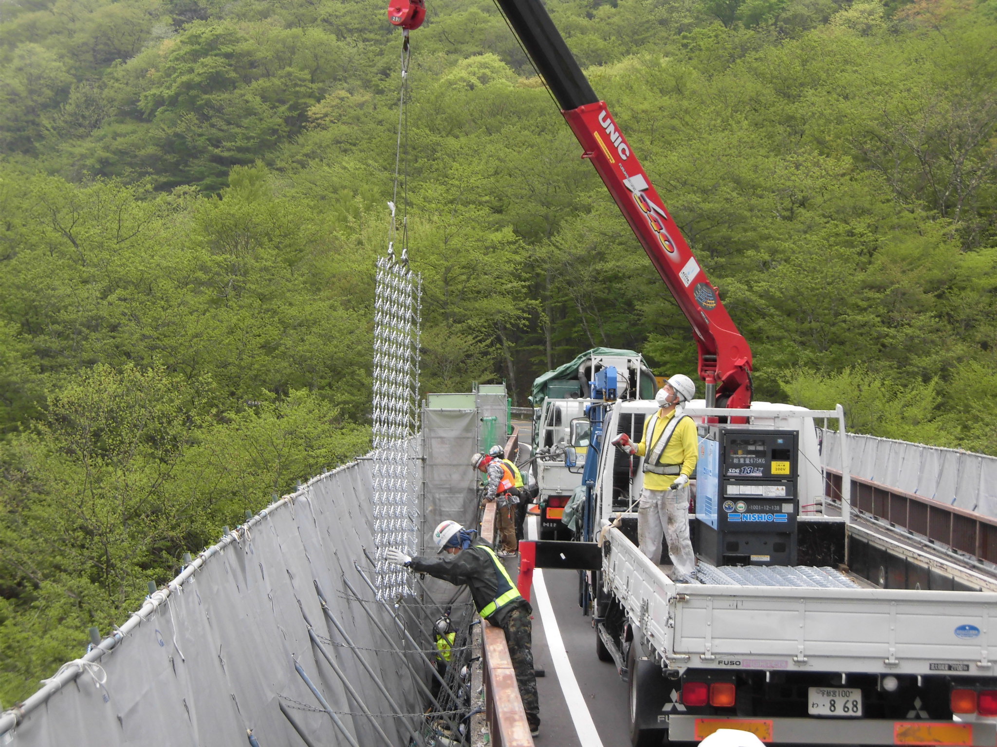 施工法は、1面加工された展張格子筋を橋梁上面から足場に下ろし、専用の軽量ジャッキでRC床版下面に設置する。設置は全て加工されていることから短時間で取り付けが可能となり、施工の合理化・省力化が図られる結果となった。