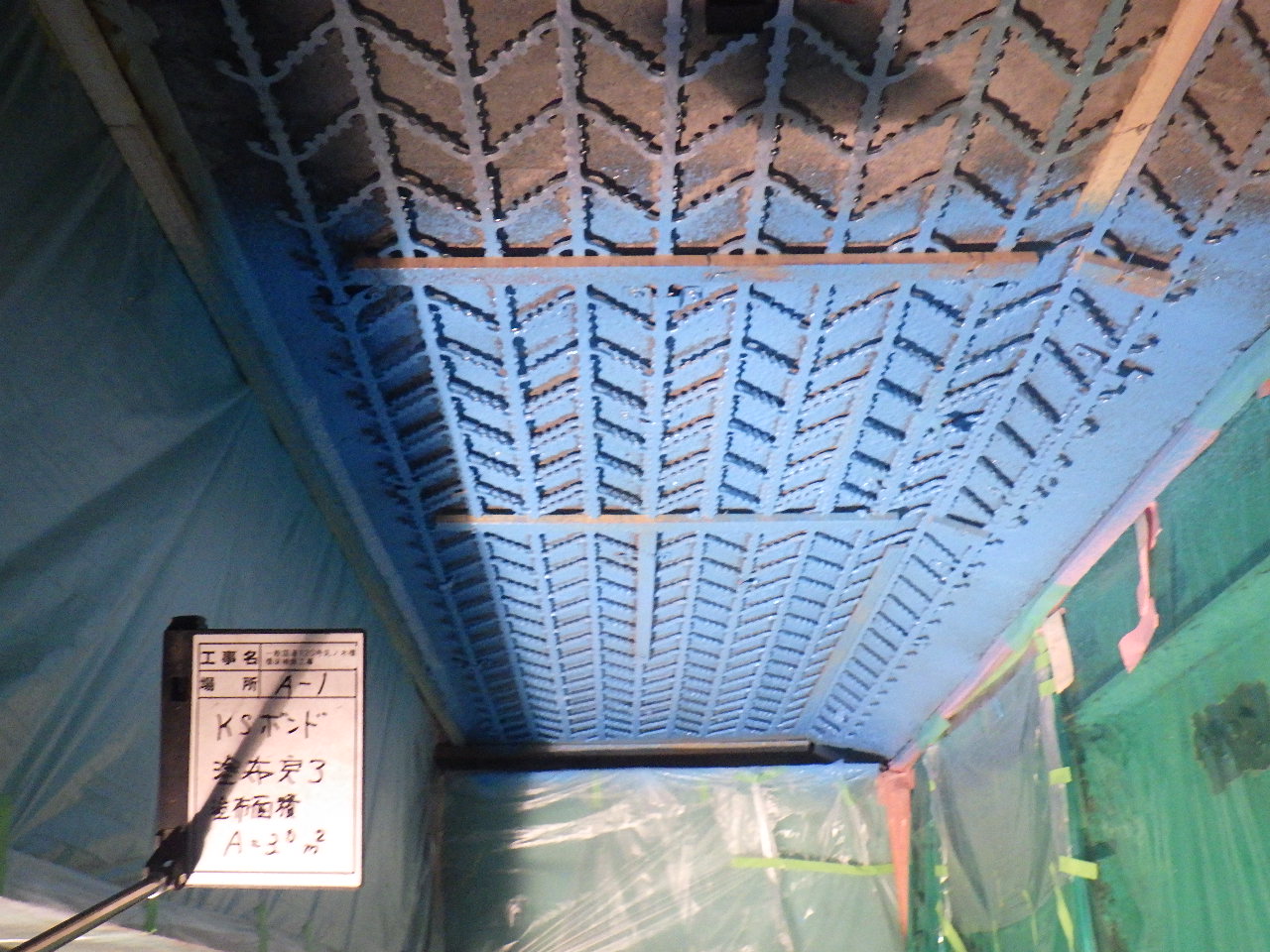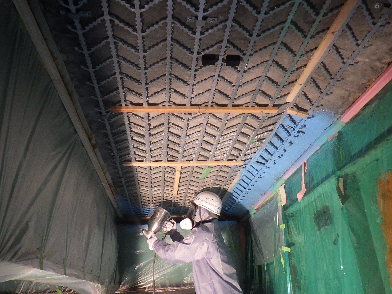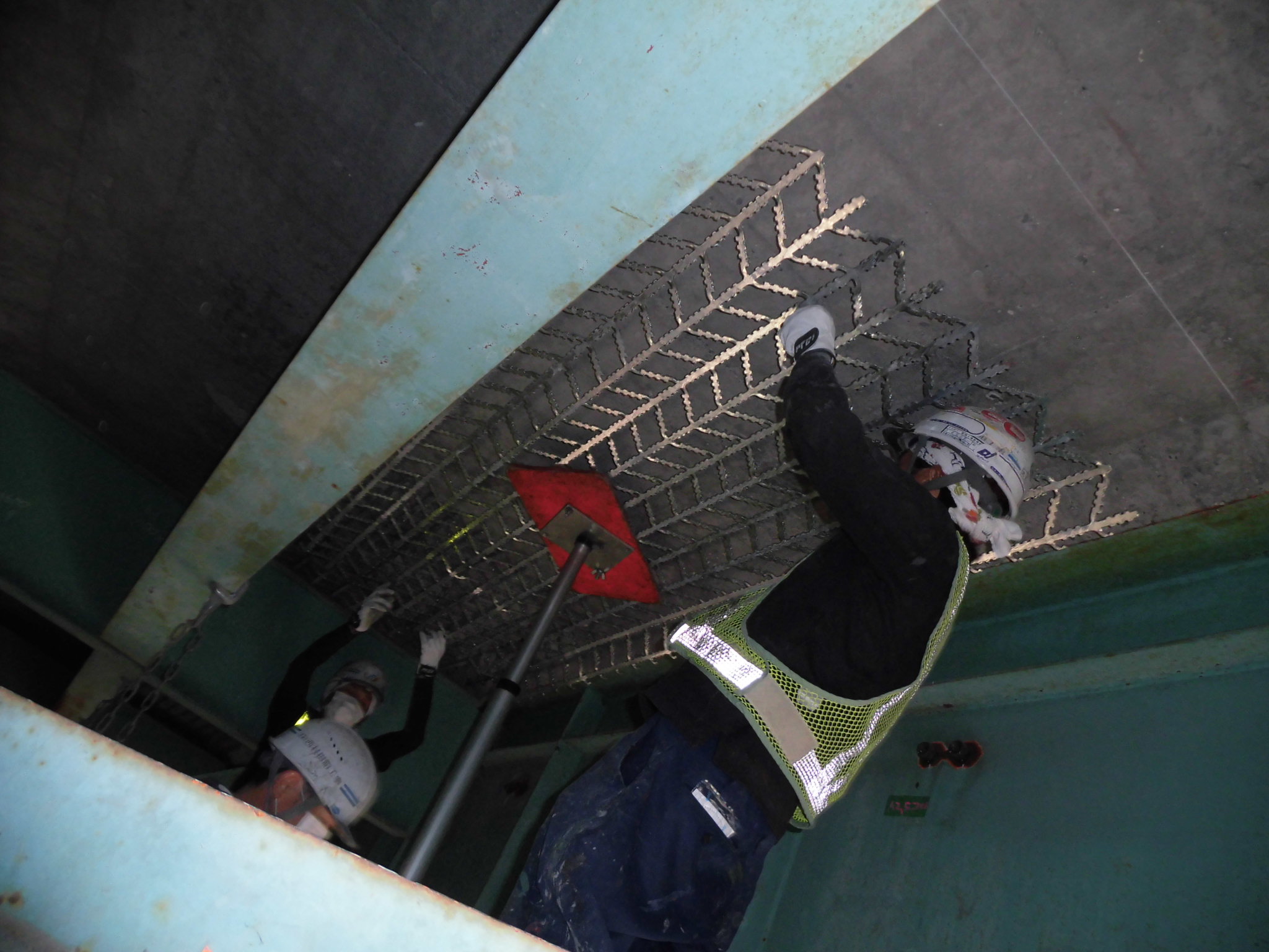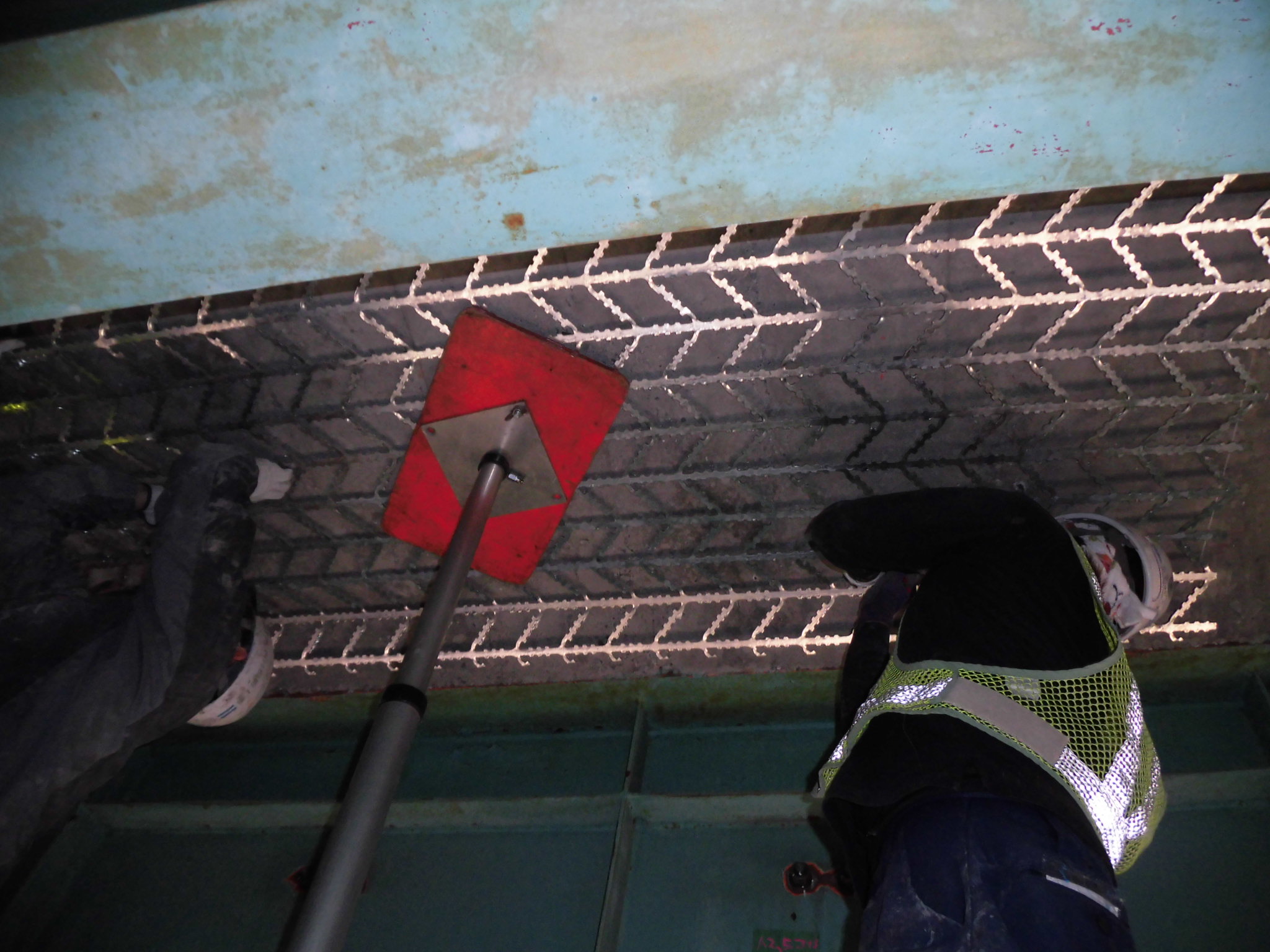 下面増厚補強は、展張タイプのグリッドメタルを配置した接着剤塗布型PCM吹きつけを選択した。本来床版補強は、上面から行うのが望ましい。しかし桁補強に足場を用いることから、足場を設置しているうちに下面補強を行うことが工程的にも、コスト的にも合理的であると考えられた。