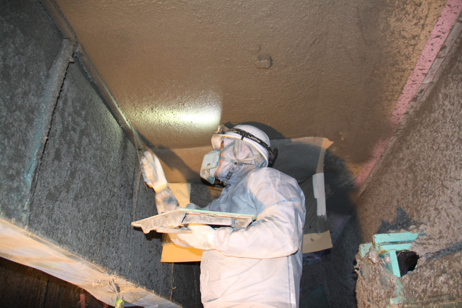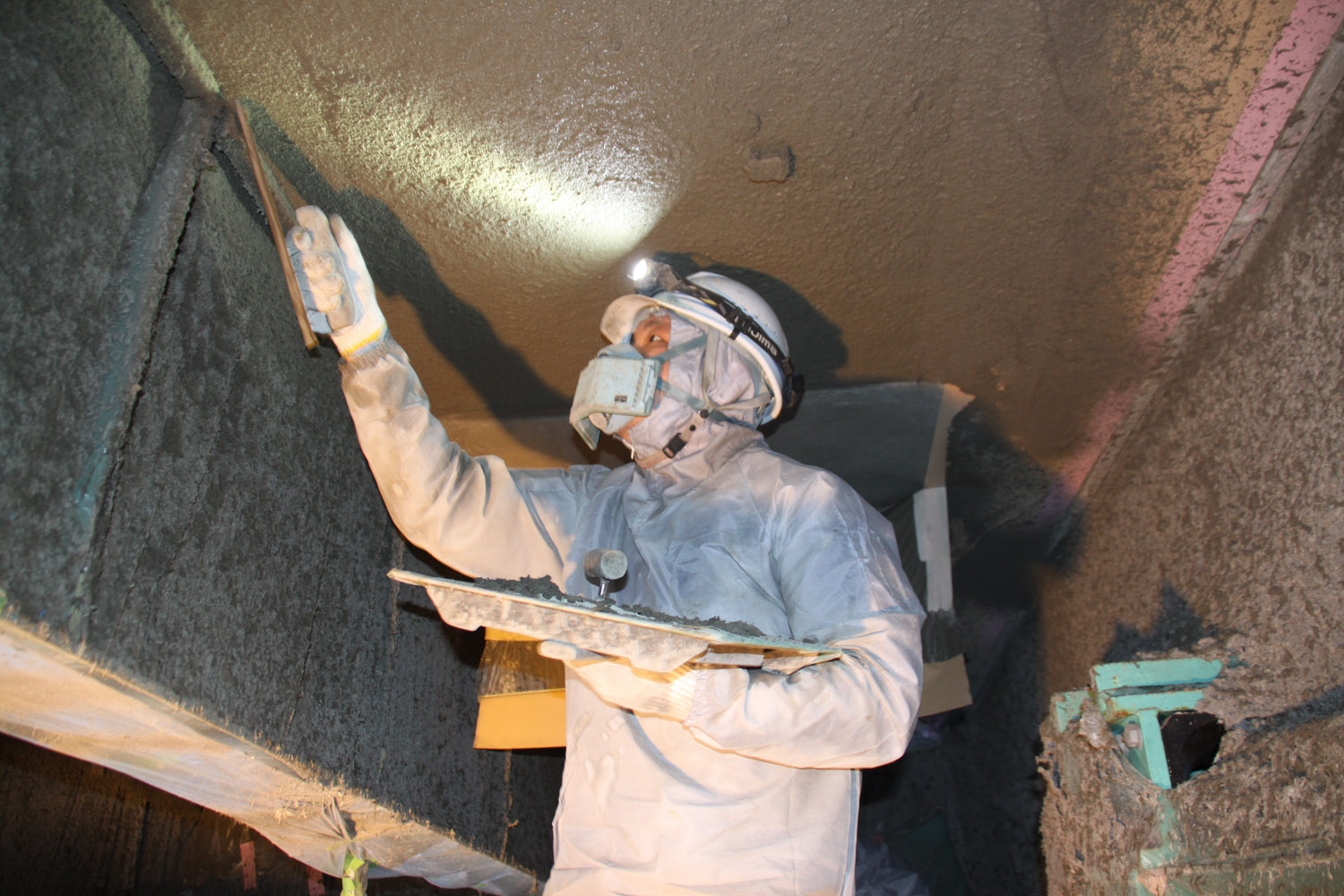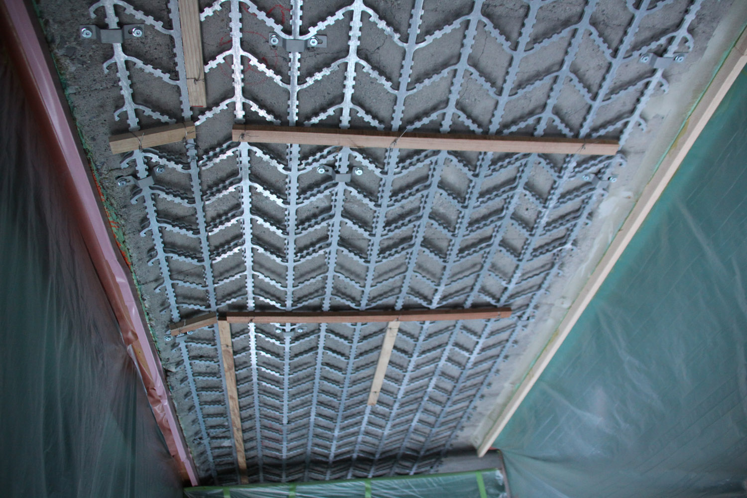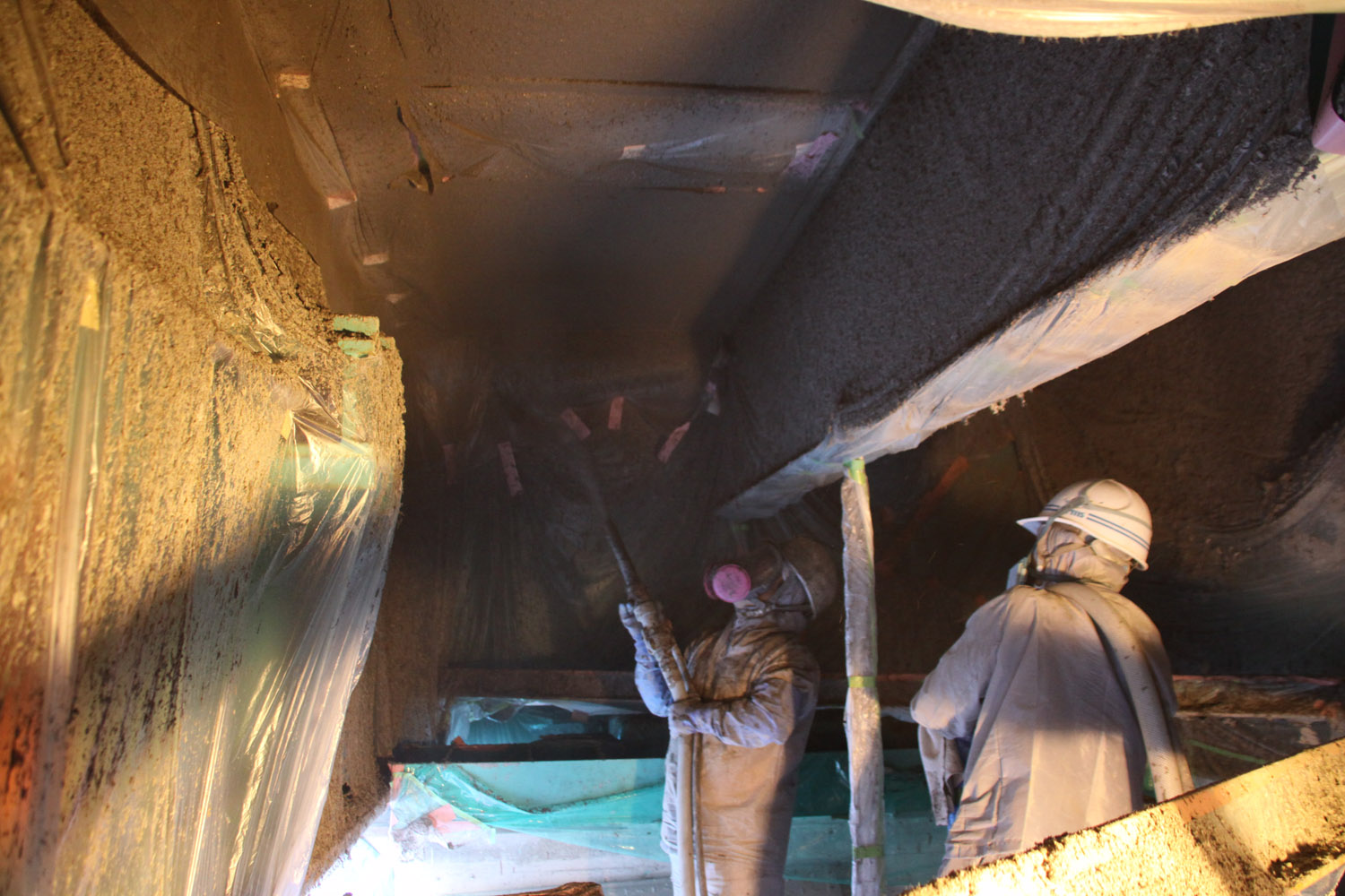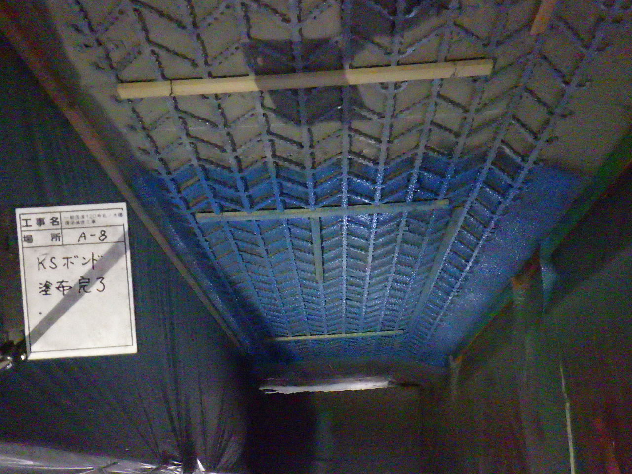 その後、付着用の樹脂系接着剤KSボンドを界面に塗布し、その上で湿式PCM(リフレモルセットSP)を吹付ける。本工法では10mm浮かせてPCM吹き付け補強することから、1層目を5mm~10mm程度薄く吹き付けすると同時に展張格子筋の裏側に完全にモルタルが挿入するように、コテで押し込みながら補強した。翌日まで養生し、2層目を吹き付け補強した。吹付の角度はほぼ垂直で、離隔は1m程度。吹き付けた後はコテで押し込み、グリッド背面に空洞が起きないように念入りに施工した。グリッドメタル筋は鉄筋よりも高価であるが炭素繊維シートに比べるとコストは4分の1以下程度であり、配筋手間が少なくできるため、施工期間も短縮できる。