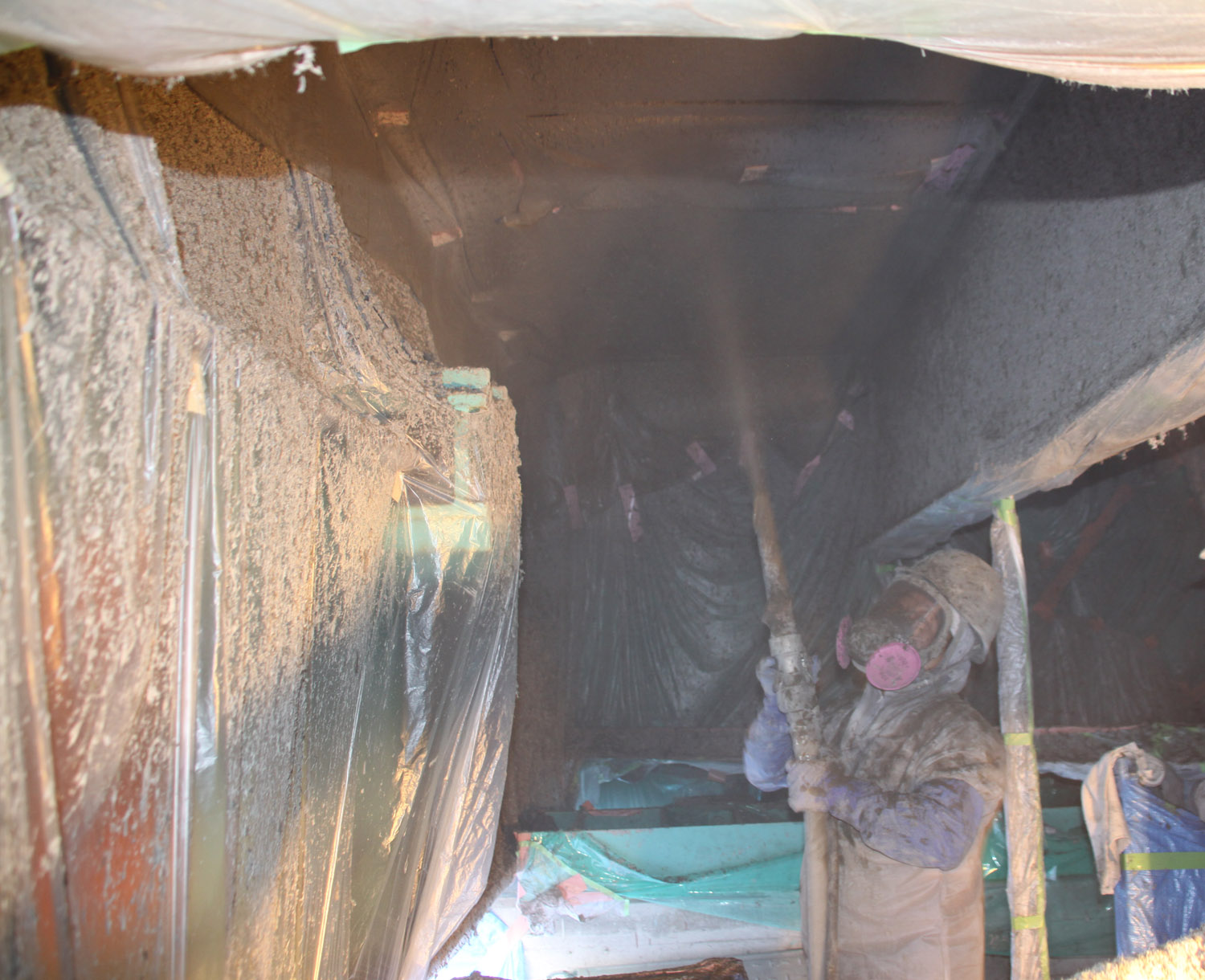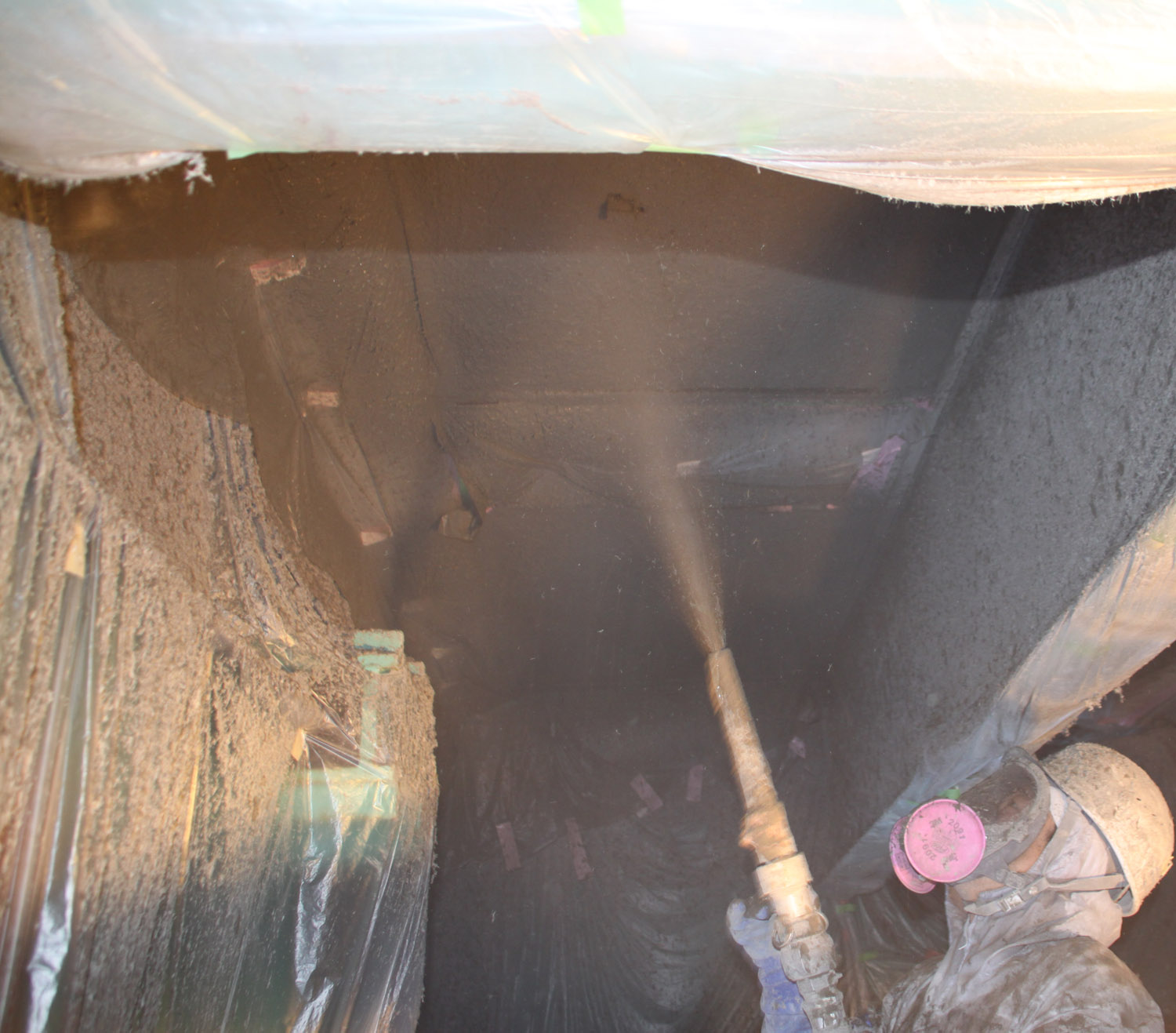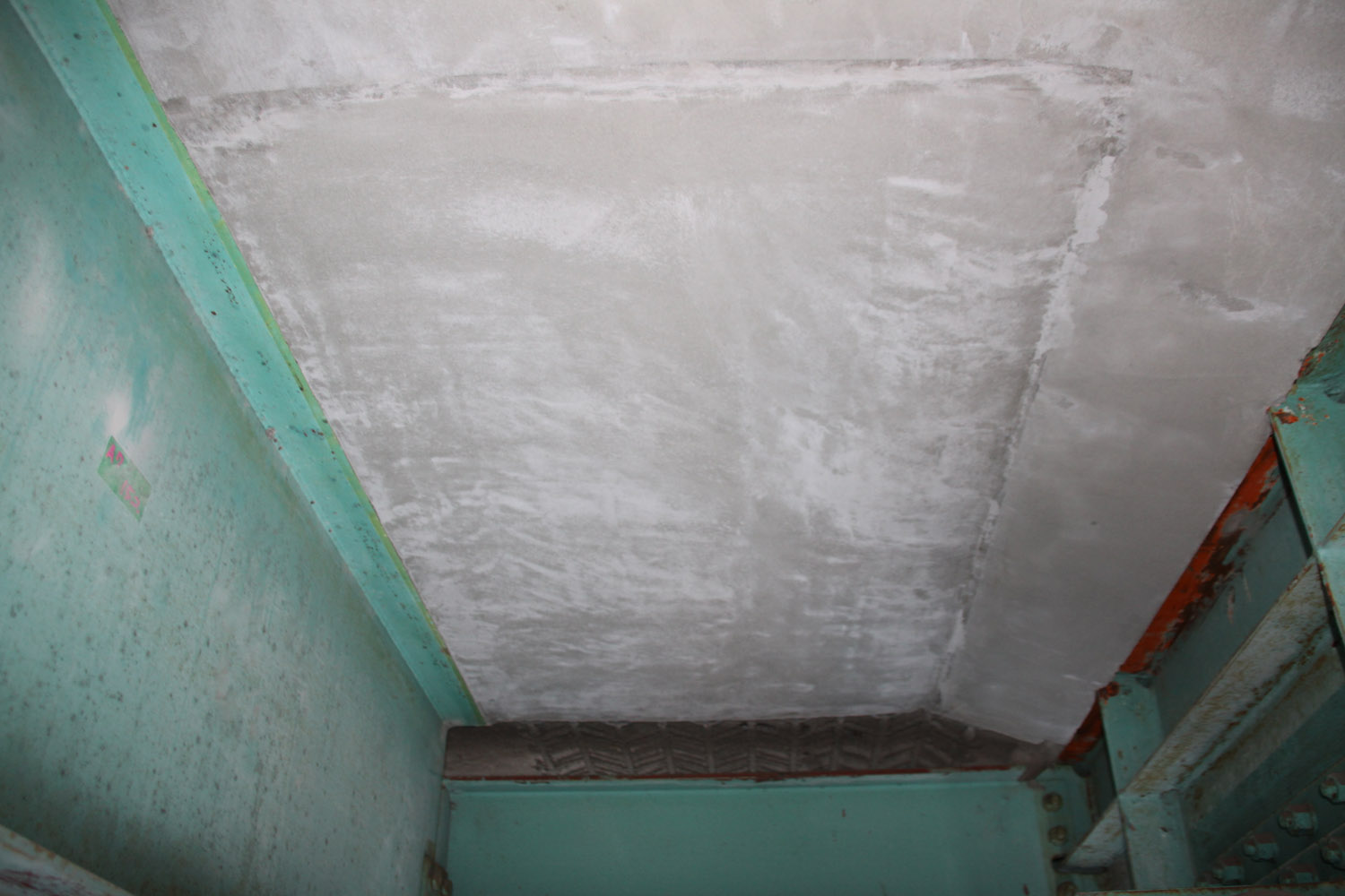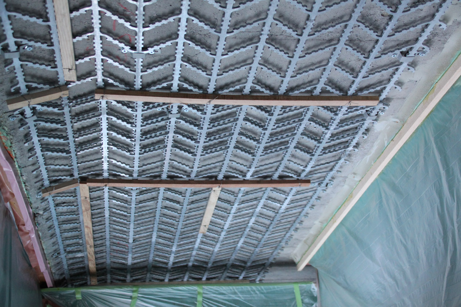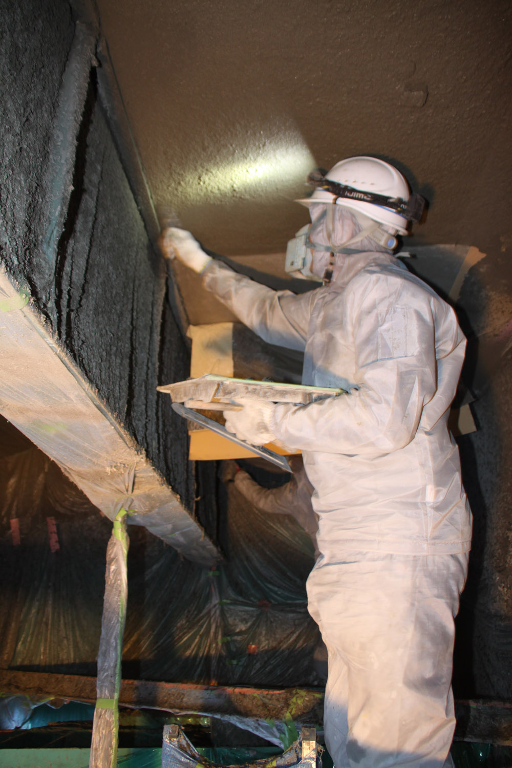 その後、付着用の樹脂系接着剤KSボンドを界面に塗布し、その上で湿式PCM(リフレモルセットSP)を吹付ける。本工法では10mm浮かせてPCM吹き付け補強することから、1層目を5mm~10mm程度薄く吹き付けすると同時に展張格子筋の裏側に完全にモルタルが挿入するように、コテで押し込みながら補強した。翌日まで養生し、2層目を吹き付け補強した。吹付の角度はほぼ垂直で、離隔は1m程度。吹き付けた後はコテで押し込み、グリッド背面に空洞が起きないように念入りに施工した。グリッドメタル筋は鉄筋よりも高価であるが炭素繊維シートに比べるとコストは4分の1以下程度であり、配筋手間が少なくできるため、施工期間も短縮できる。