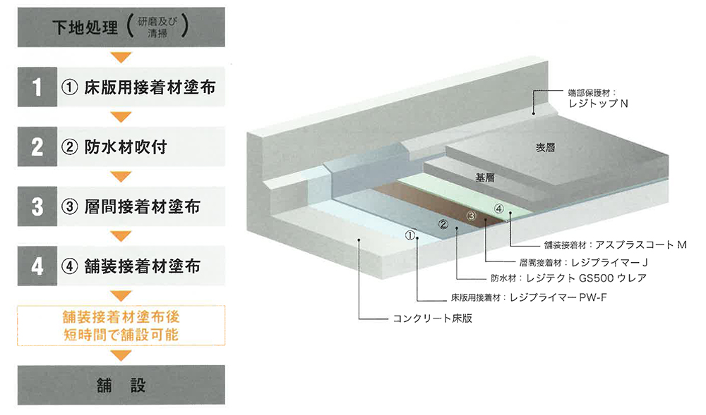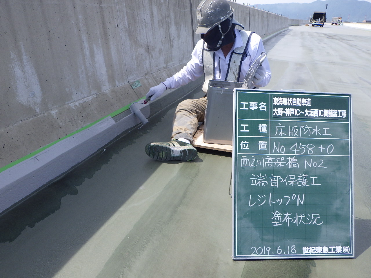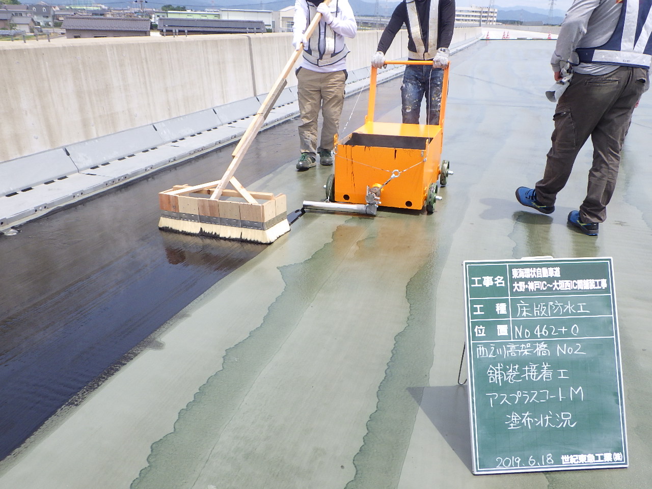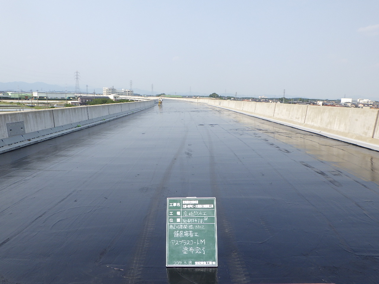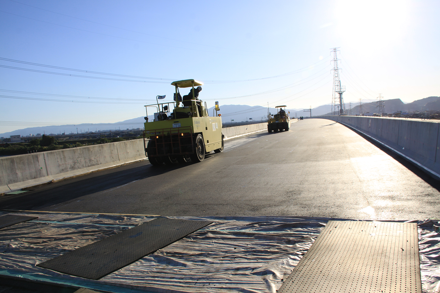 床版防水はグレードⅡを用いており、防水工法としてはレジテクトGS-M工法を採用した。同工法は、舗装との接着層などに珪砂を用いずに済み、他工法に比べて1工程減らせることや、同工法において、床版防水層と舗装との接着層に用いる「アスプラスコートM」が60℃以上の温度にならないと溶けず、夏場にダンプなどが通行してもタイヤに材料が付着せず防水層も損傷しないことから手戻りが発生しないことなどを踏まえて用いたもの。基層の施工にあたっては、防水工との付着を確実にするために合材温度を170℃~最低でも90℃以上に保って舗設した。