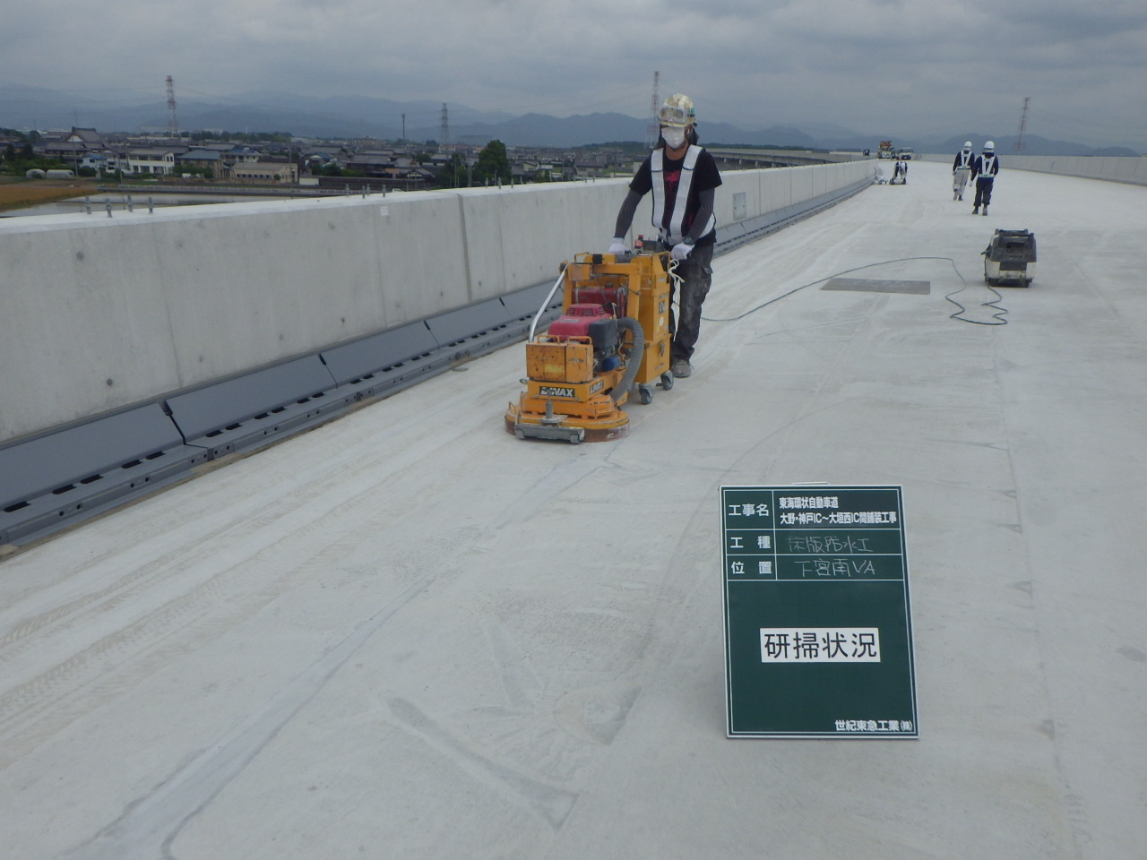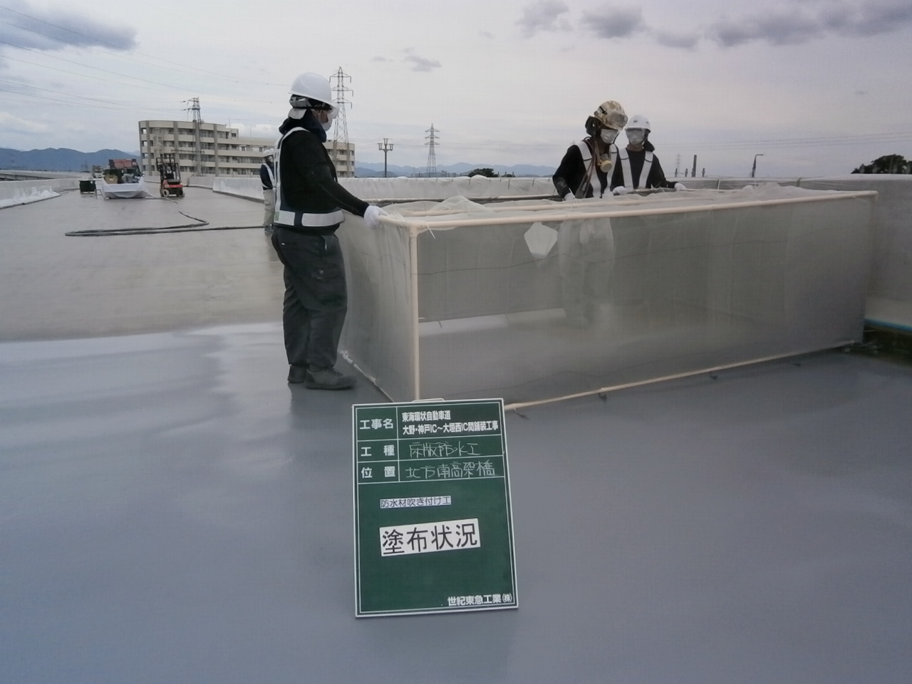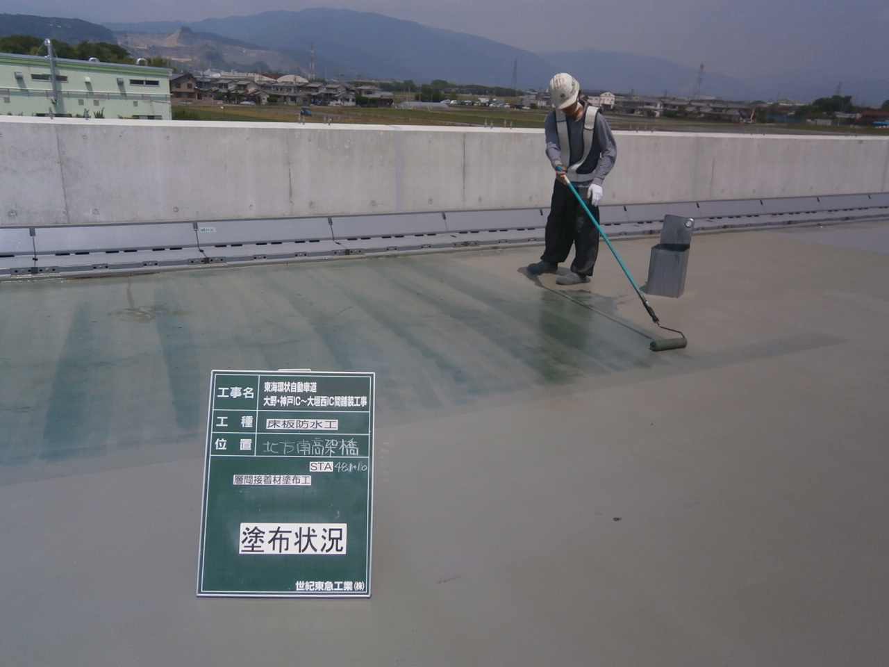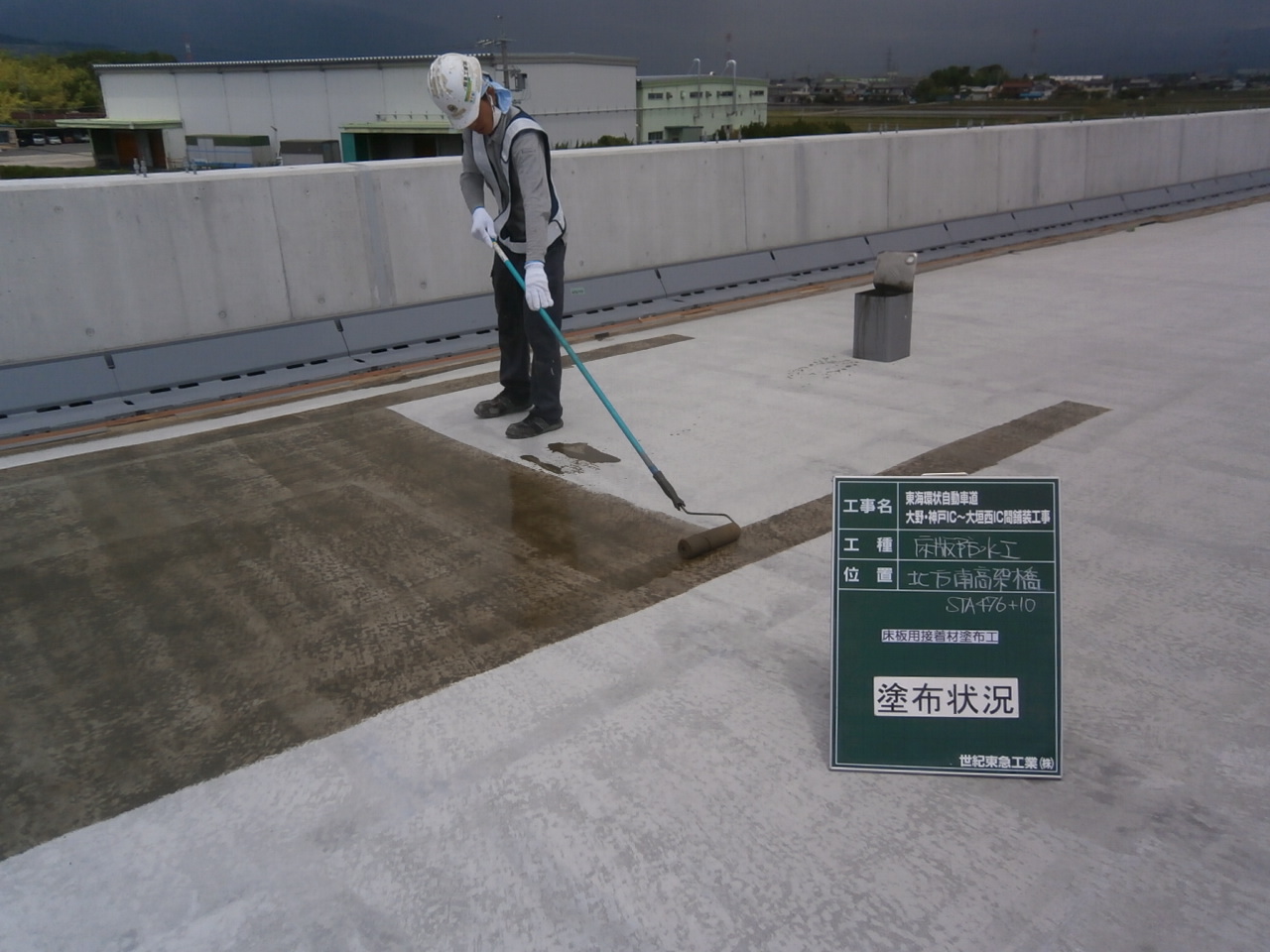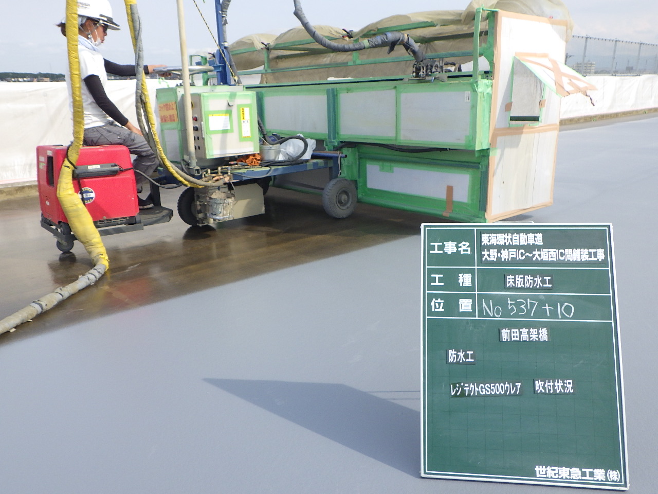 高性能床版防水工の施工① 表面研掃→プライマー塗布→防水材の吹付け