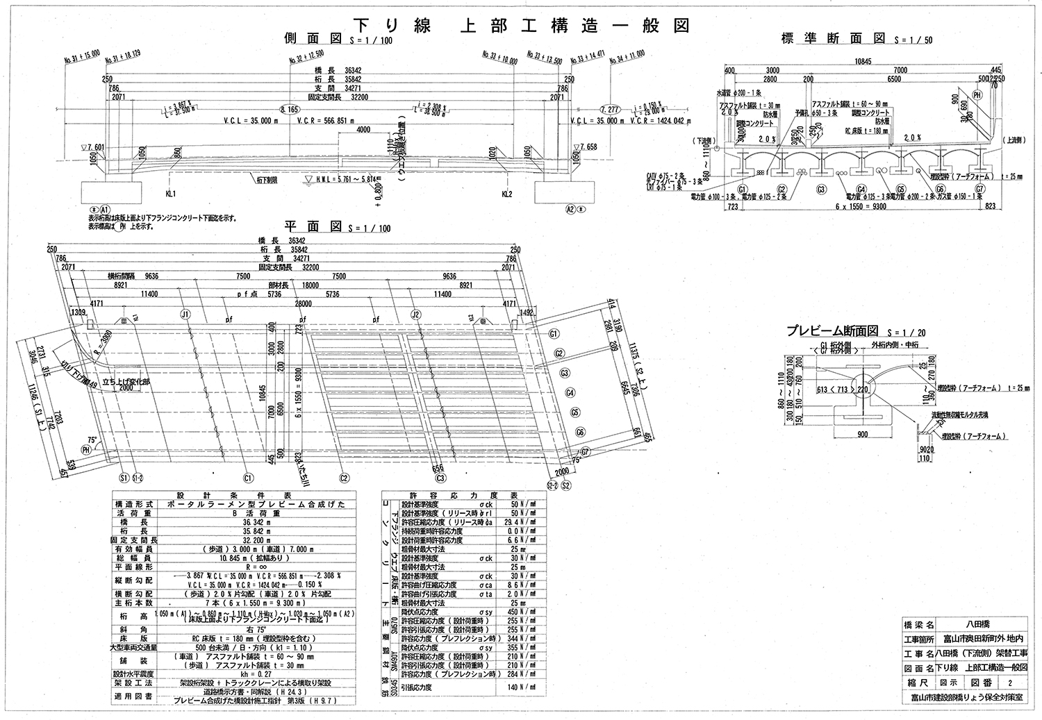 設計業務を発注するに当たっては、橋梁形式の提案を含めたプロポーザル方式で設計業者を選定した。そこで選定された当初形式はダックスビームのポータルラーメン橋でしたが、斜角があることから、より現場に適しているプレビーム合成桁を採用した。工夫としては、通常の2点載荷のプレフレクションではなく、(高岡市の千保川渡河部の木津橋などで実績のある)3点載荷のプレフレクションを採用し、2点載荷に比べ桁高を1割弱抑制した。剛結構造であるため上下部の取合部は非常に過密な配筋となっており、コンクリートの打設も気を付けていく必要がある。