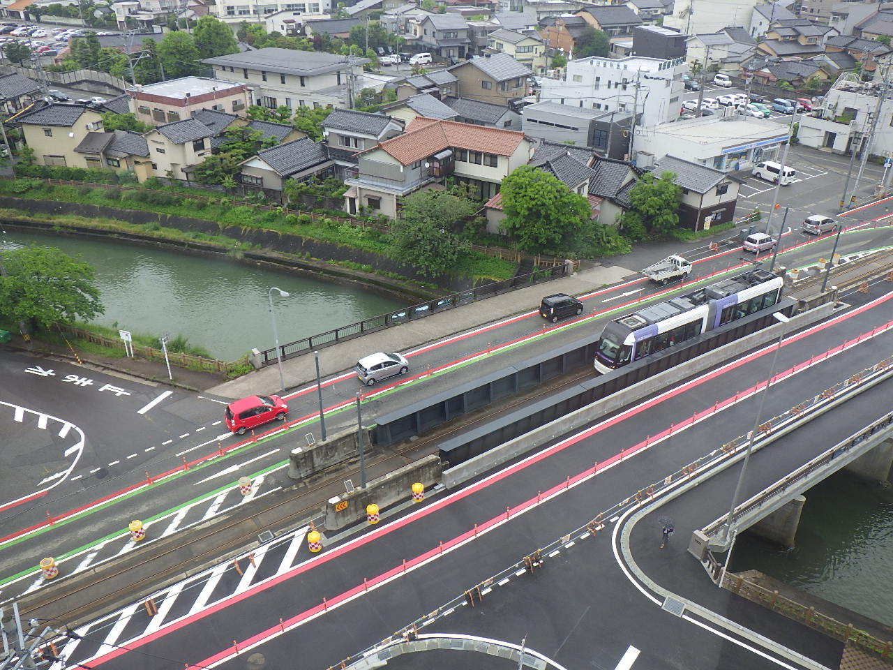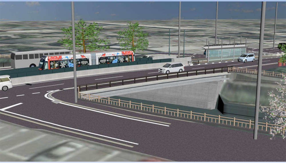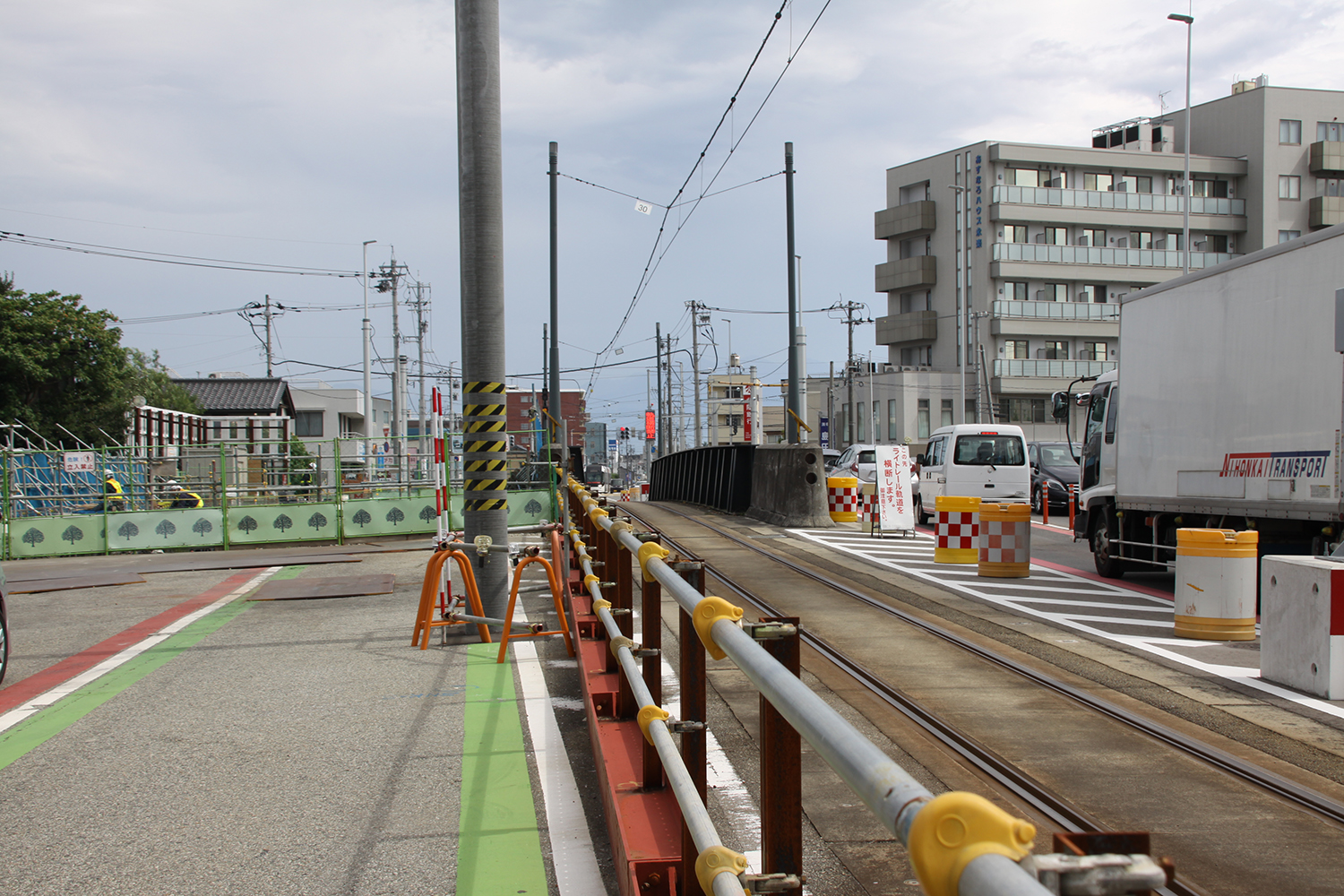 一方で八田橋は橋梁の真ん中に富山ライトレールが走っている。これはRC桁ではなく、同形式の橋梁の真ん中を切り欠いて新たに鋼桁をかけているものだ。今後、ライトレールの複線化に伴って、橋のたもとに電停を設ける計画があり、その計画が進むと架け替えは一層困難になる。そのため今回のタイミングで架け替えることにした。