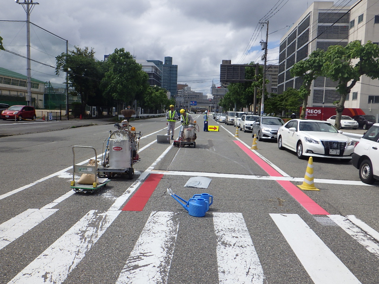 現在は片側2車線の道路であり、上流が施工時は下流側、下流側施工時は上流側をそれぞれ対面通行にした。仮橋は架けるスペースがないため設置しなかった。具体的には①上流の上部工を撤去し、橋台を新設、②新しい上部工を架設、③下流の上部工を撤去し、橋台を新設、④新しい上部工を架設、⑤旧橋の下部工を撤去という流れになる。施工にあたっては、交通の切りまわしや渋滞を抑えるための信号プログラムの改良、中央部にある鉄道桁への影響の把握(鉄道桁から4㍍の離隔しかない箇所に橋台を新たに設けるため施工時・完成時に変位が生じないようにするための調査)など準備工を行った。